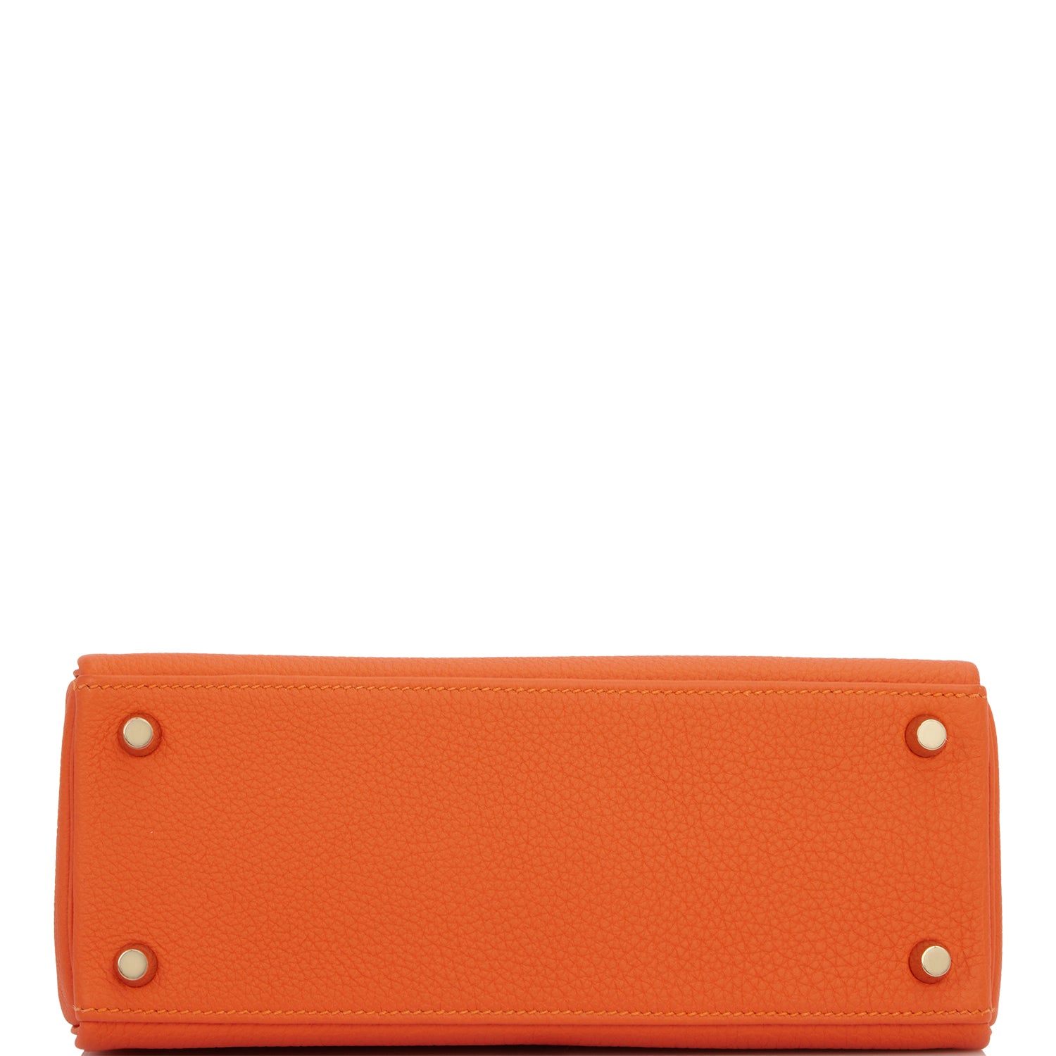 This Retourne Kelly is of Feu togo leather with gold hardware and has tonal stitching, front flap, two straps with center toggle closure, clochette with lock and two keys, single rolled handle and an optional shoulder strap.