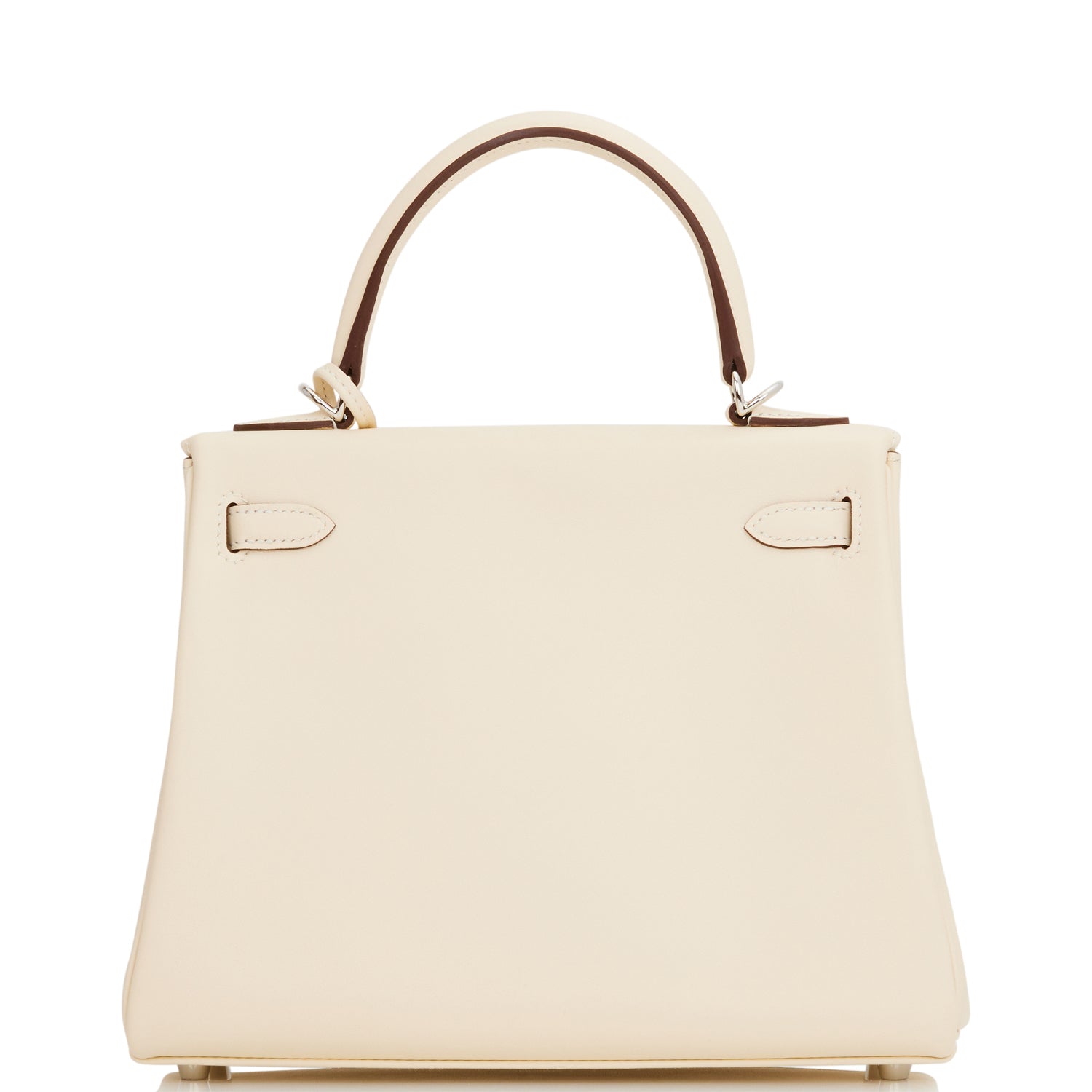 This Limited Edition Kelly, in the Retourne style, is in Nata swift leather with palladium hardware and has tonal stitching, front graphics of a rodeo charm, lipstick, pencil, coin purse and other small items found inside a bag, front flap, two straps with center toggle closure, clochette with lock and two keys, single rolled handle and removable shoulder strap.