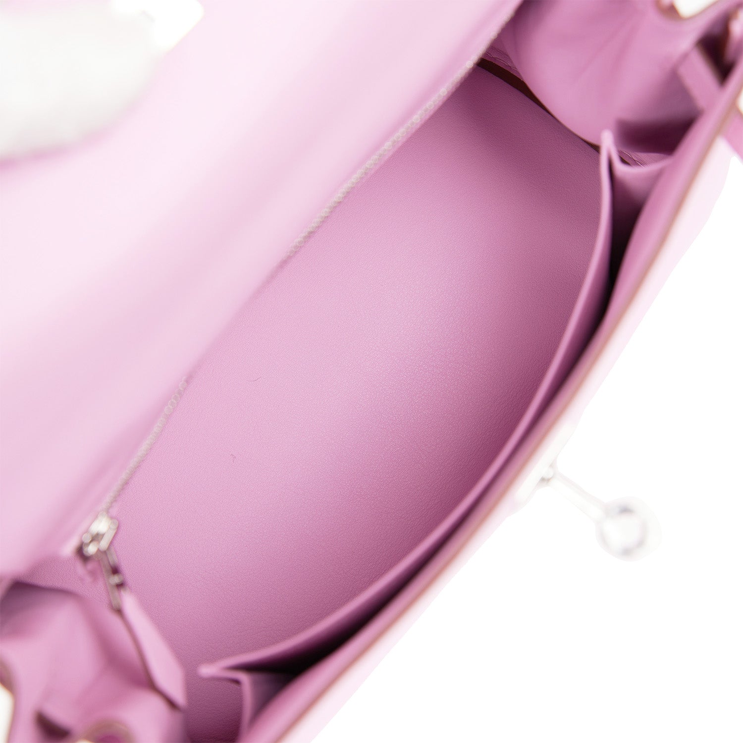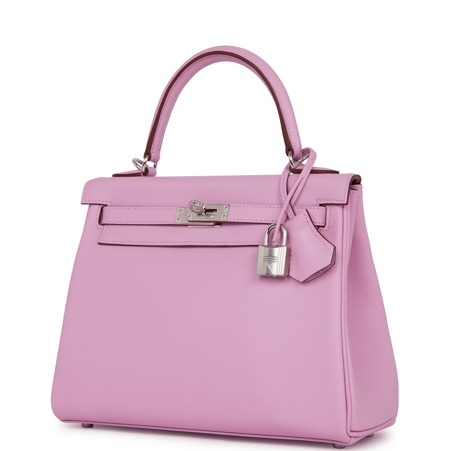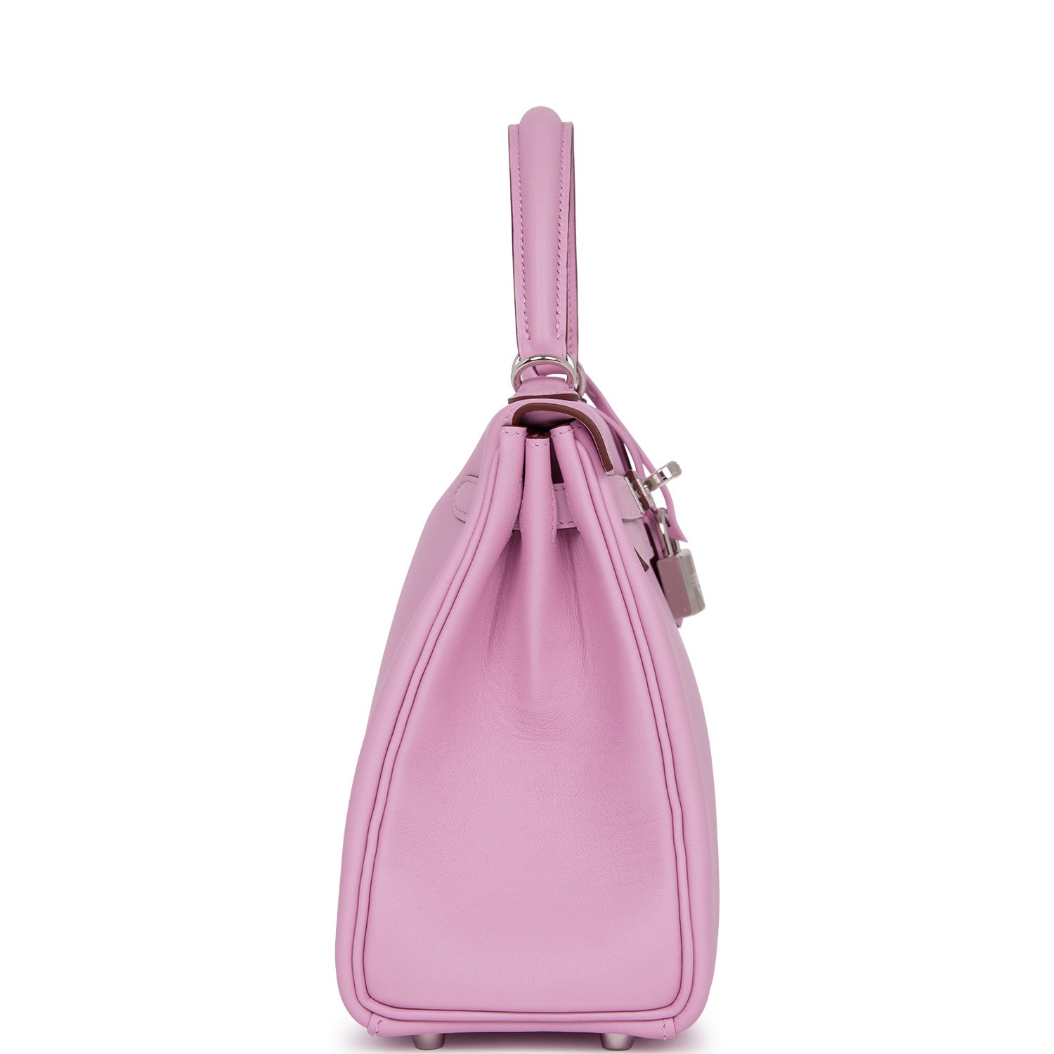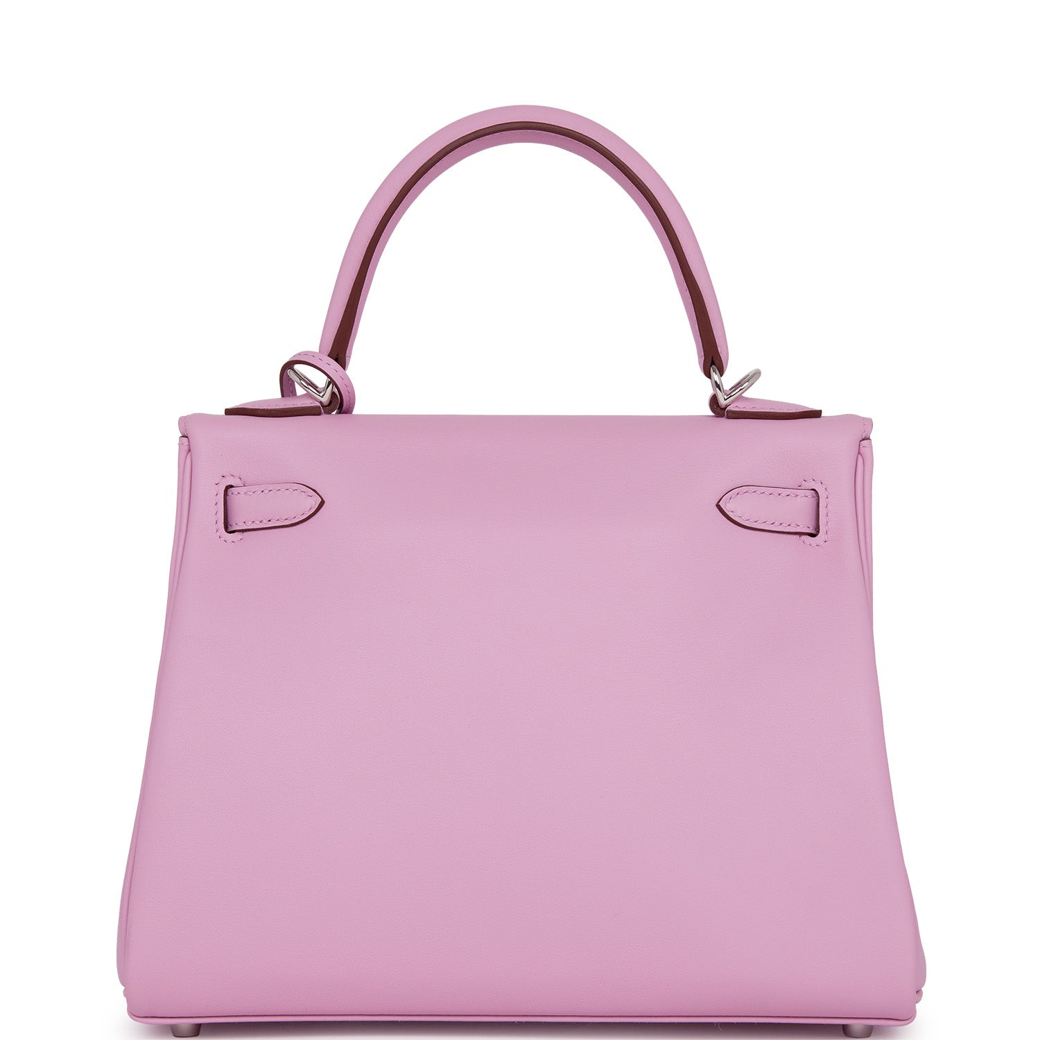 This Kelly, in the Retourne style, is in Mauve Sylvestre swift leather with palladium hardware and has tonal stitching, two straps with front toggle closure, clochette with lock and two keys, single rolled handle and removable shoulder strap.