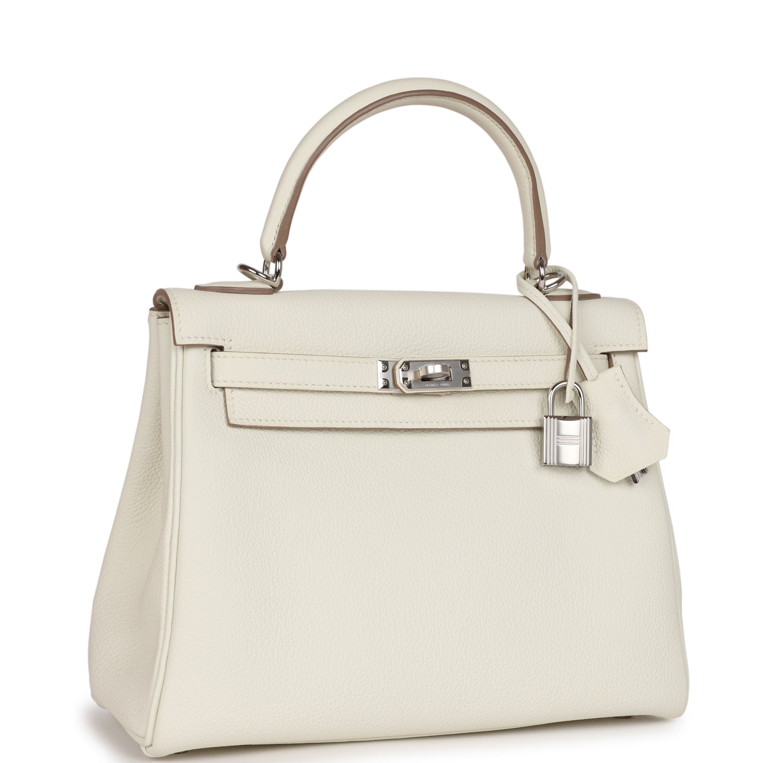 This Kelly, in the Retourne style, is in Mushroom togo leather with palladium hardware and has tonal stitching, two straps with front toggle closure, clochette with lock and two keys, single rolled handle and removable shoulder strap.