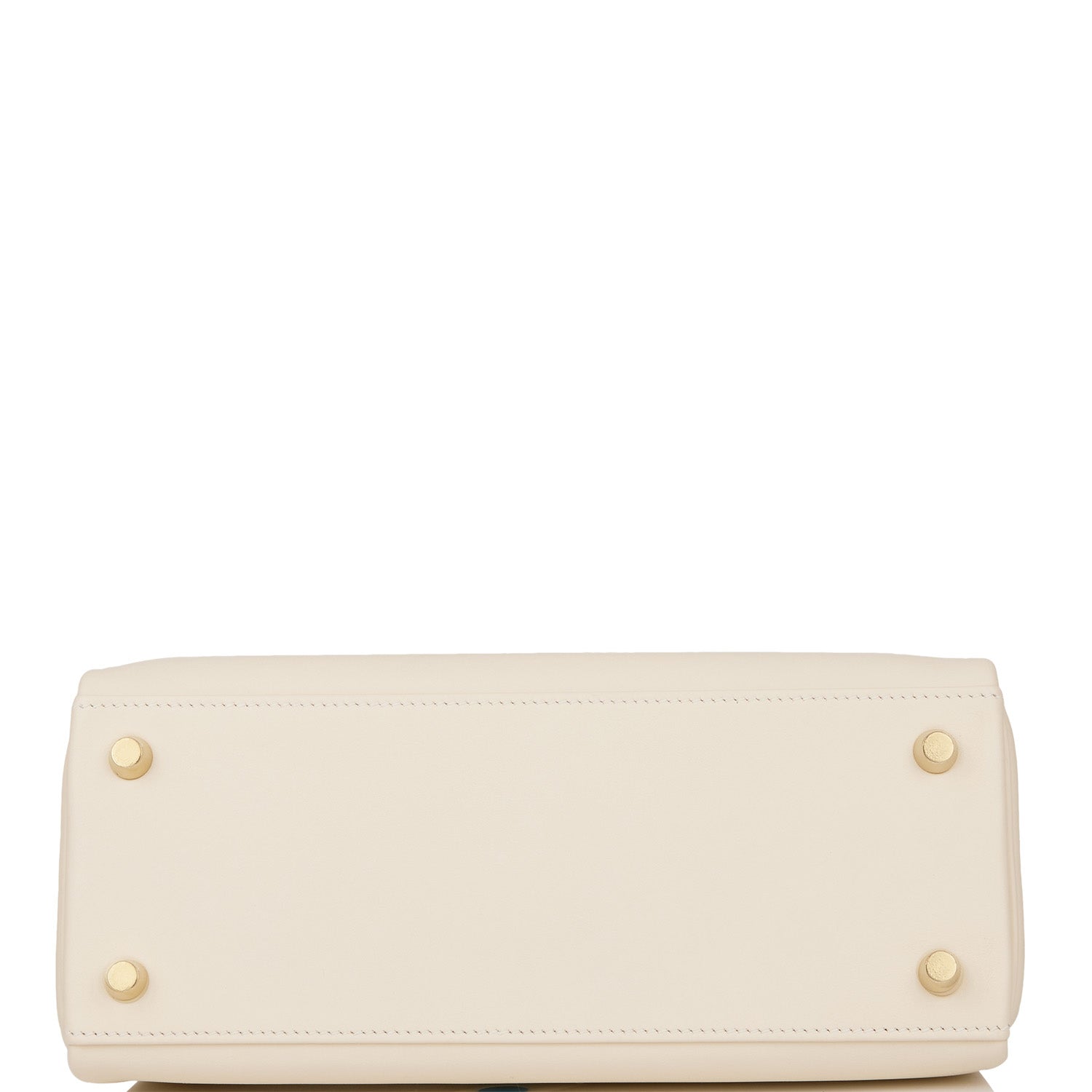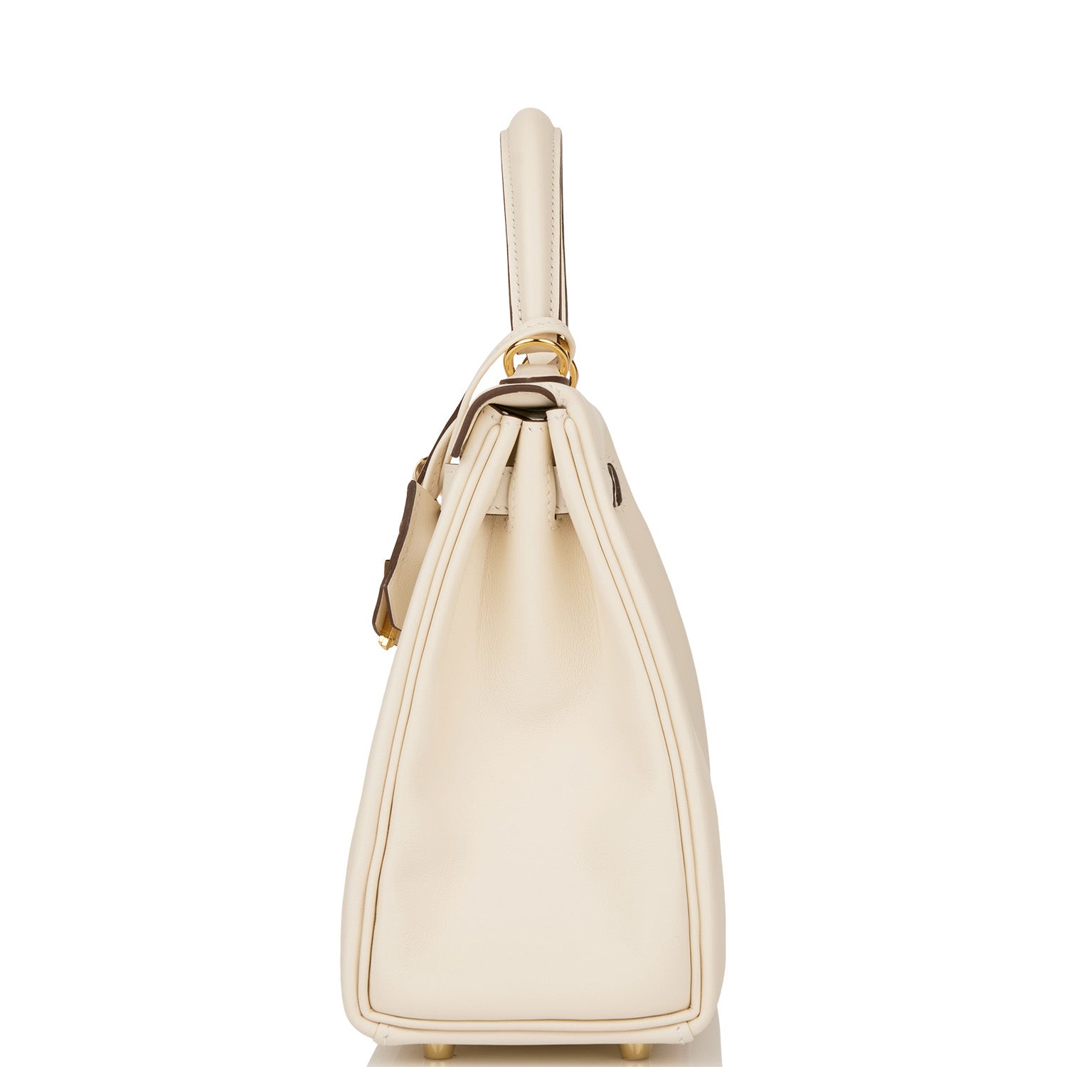 This Kelly, in the Retourne style, is in Nata swift leather with gold hardware and has tonal stitching, two straps with front toggle closure, clochette with lock and two keys, single rolled handle and removable shoulder strap.