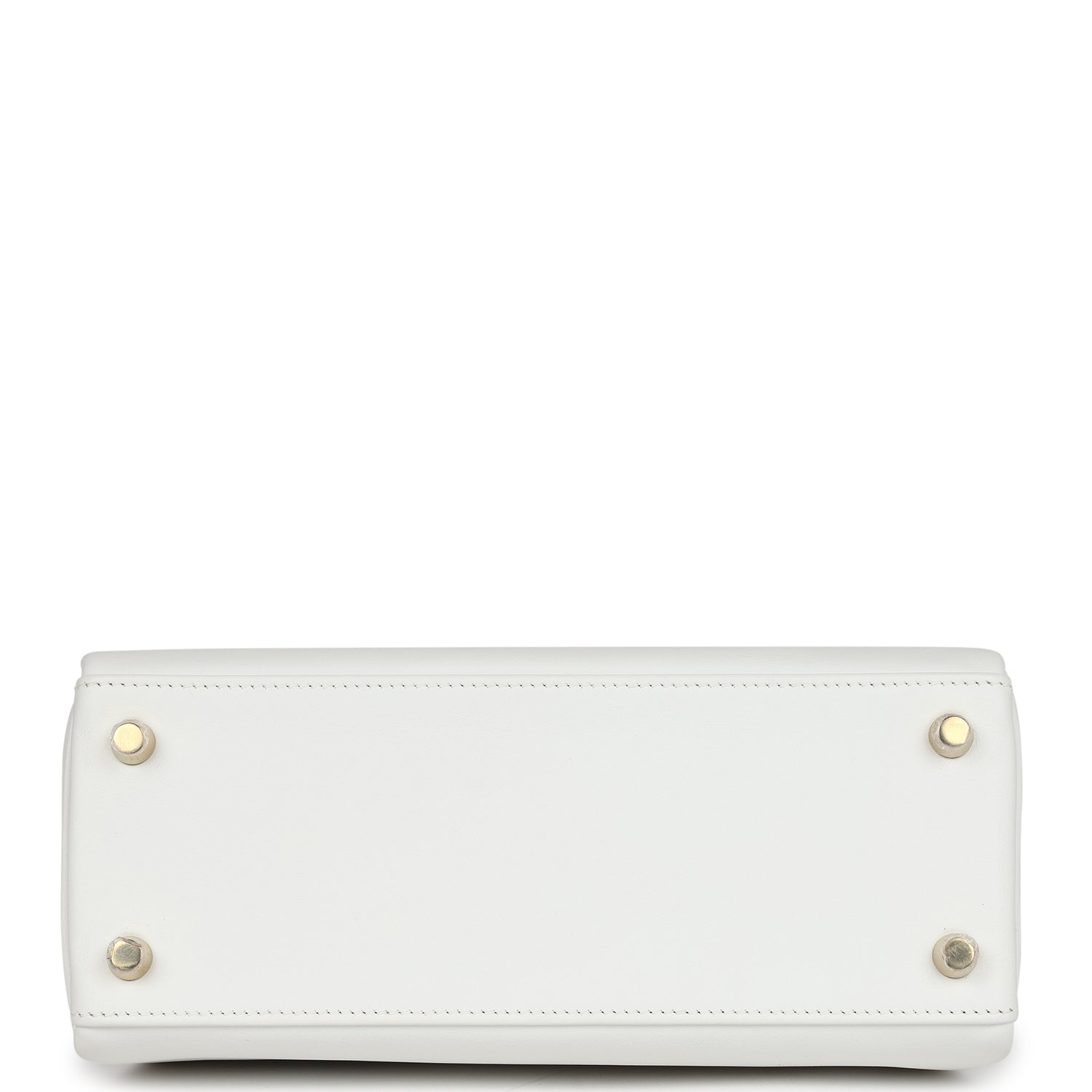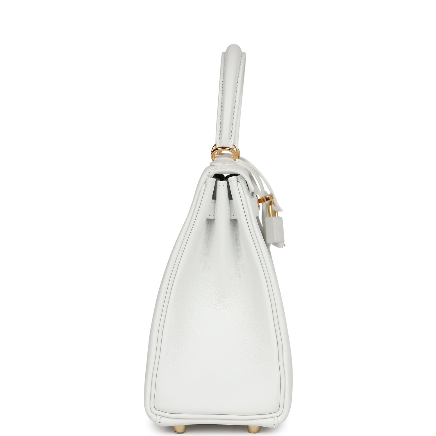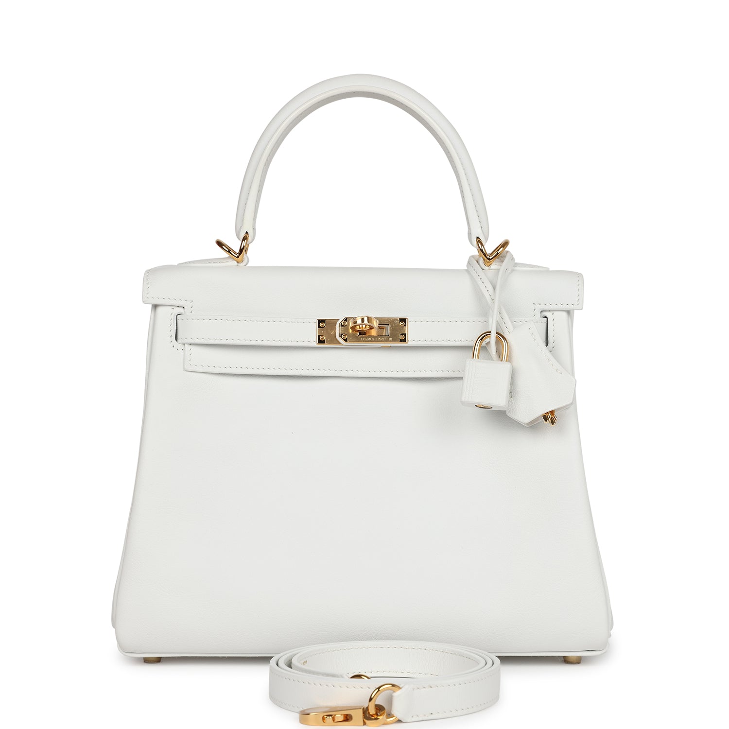 This Kelly, in the Retourne style, is in New White swift leather with gold hardware and has tonal stitching, two straps with front toggle closure, clochette with lock and two keys, single rolled handle and removable shoulder strap.