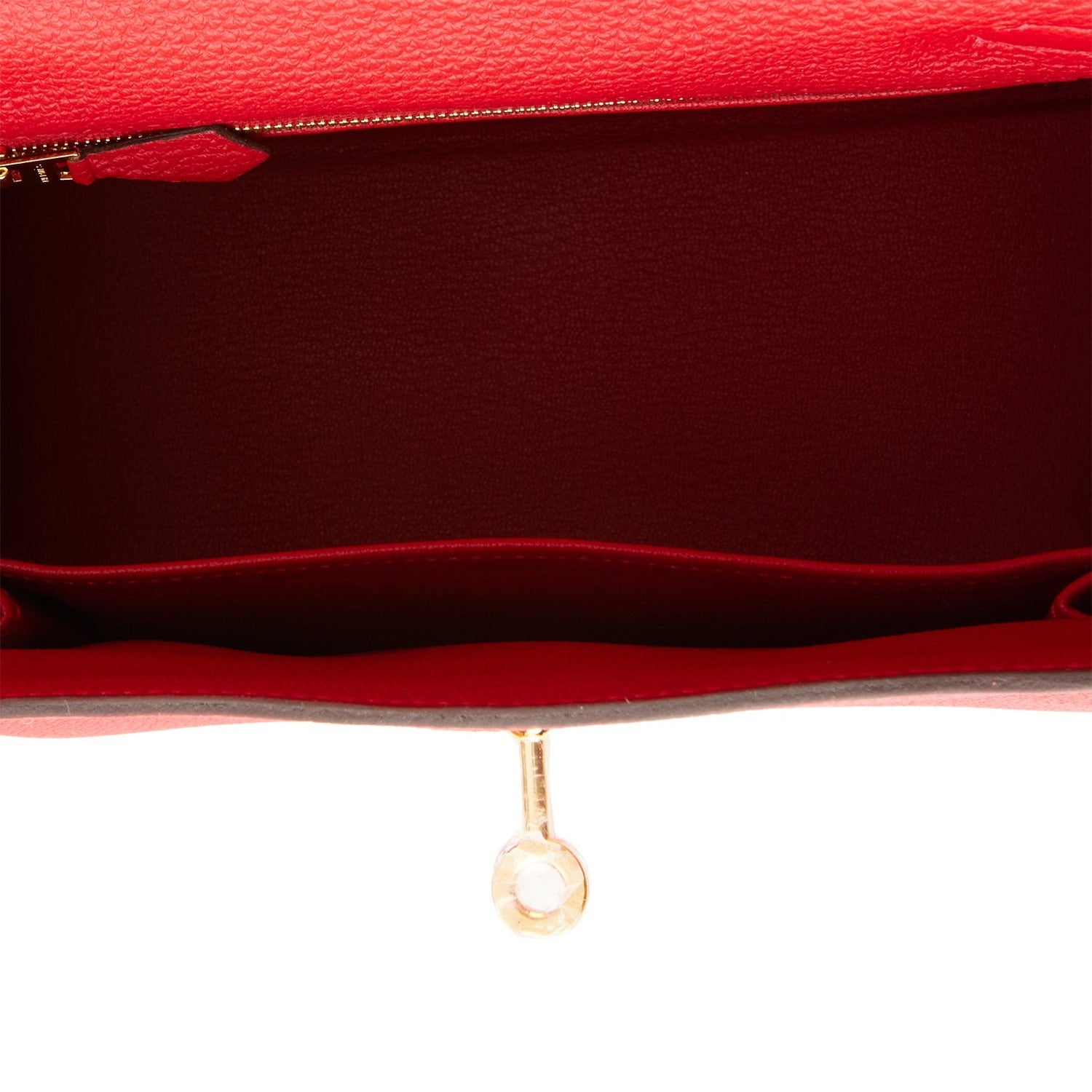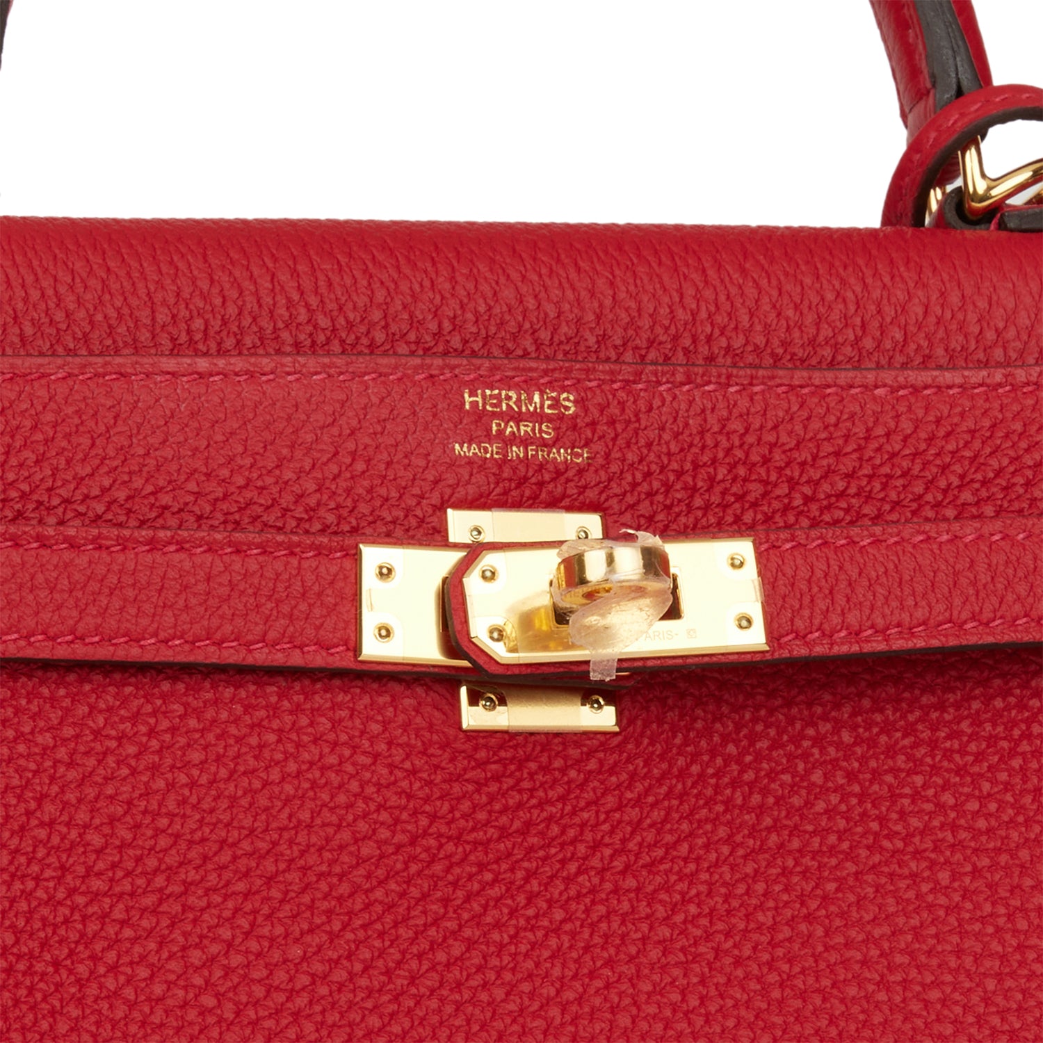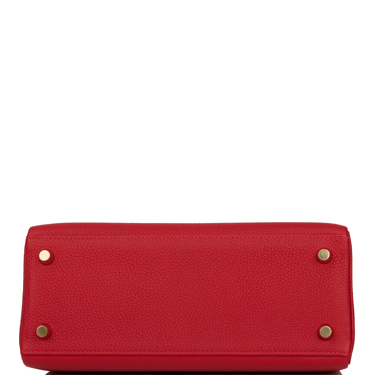 This Retourne Kelly is of Rouge Casaque togo leather with gold hardware and has tonal stitching, front flap, two straps with center toggle closure, clochette with lock and two keys, single rolled handle and an optional shoulder strap.