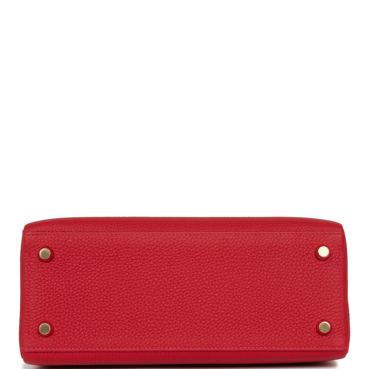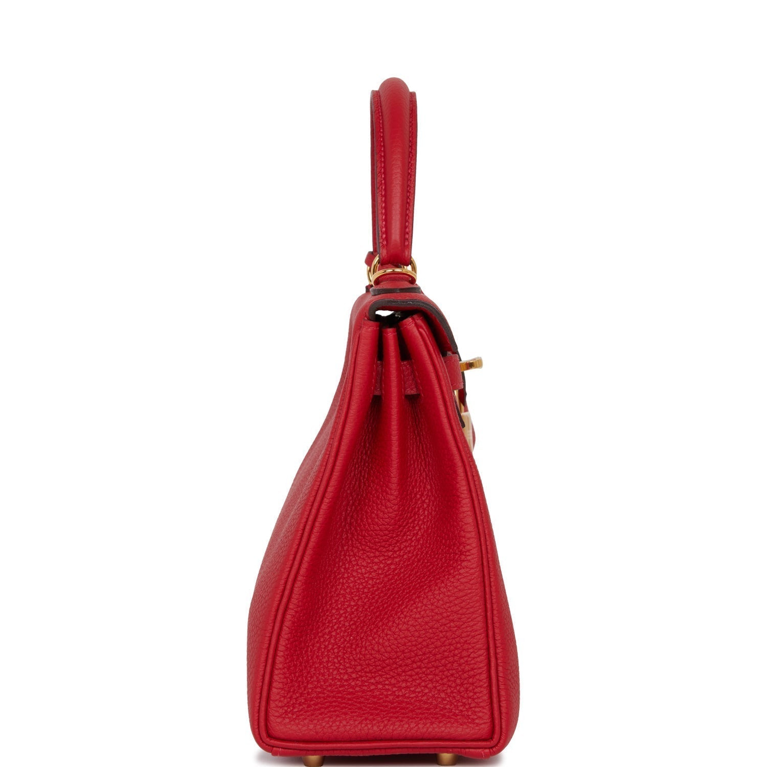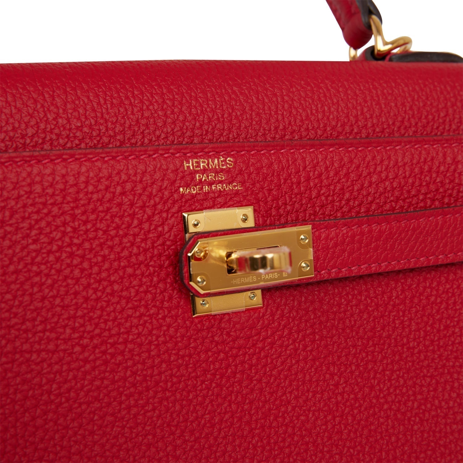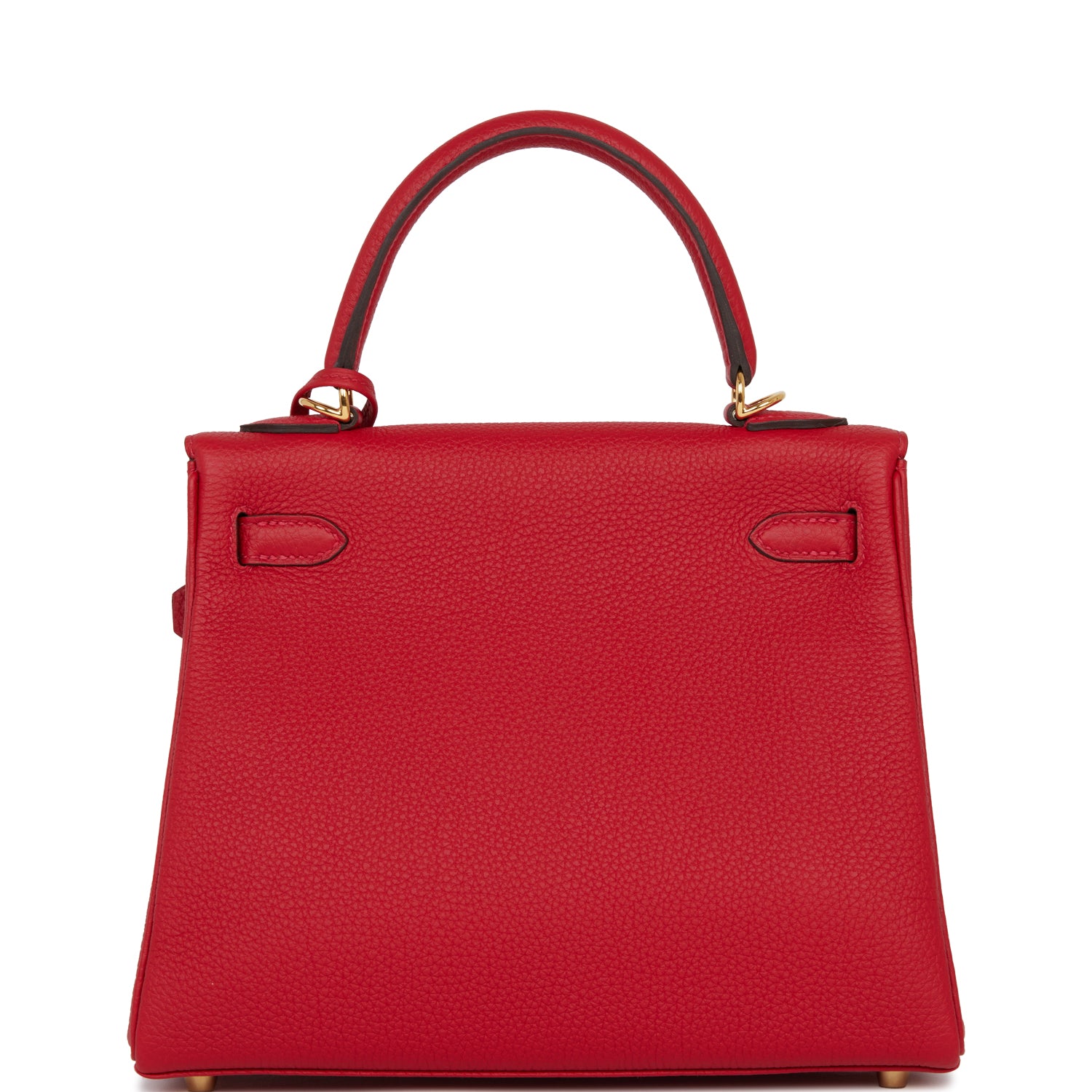 This Retourne Kelly is of Rouge Casaque togo leather with gold hardware and has tonal stitching, front flap, two straps with center toggle closure, clochette with lock and two keys, single rolled handle and an optional shoulder strap.