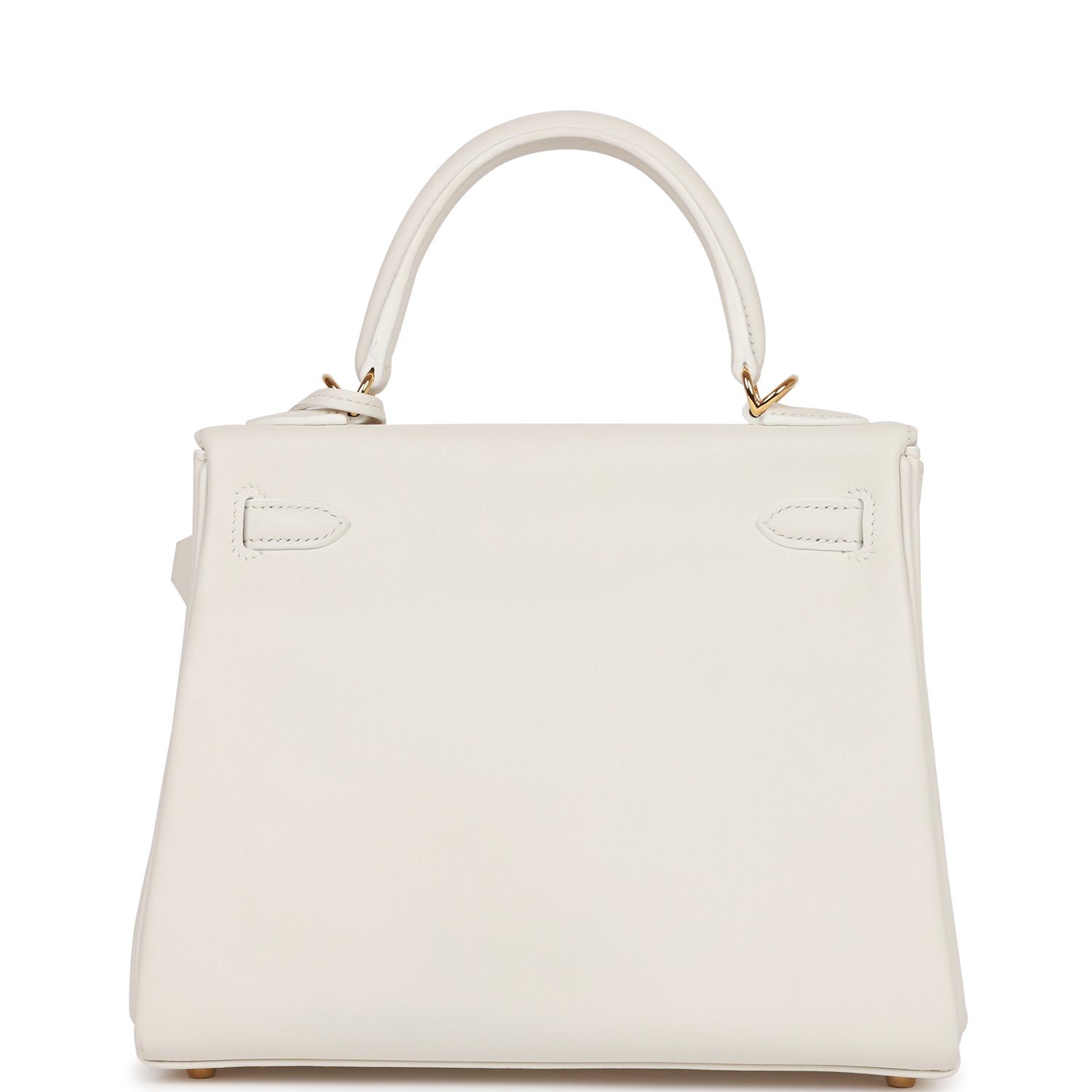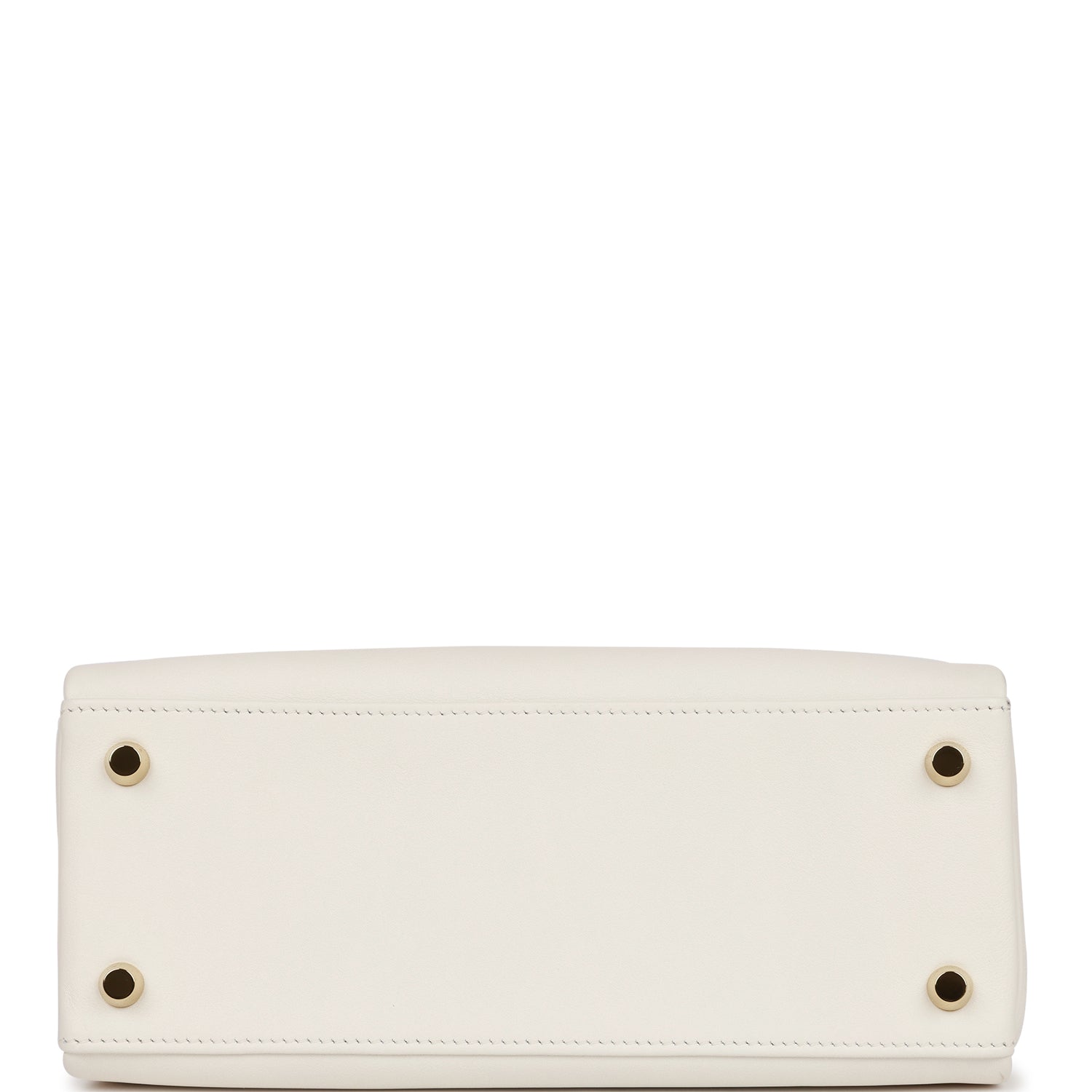 This Retourne Kelly is of white swift leather with gold hardware and has tonal stitching, front flap, two straps with center toggle closure, clochette with lock and two keys, single rolled handle and an optional shoulder strap.
