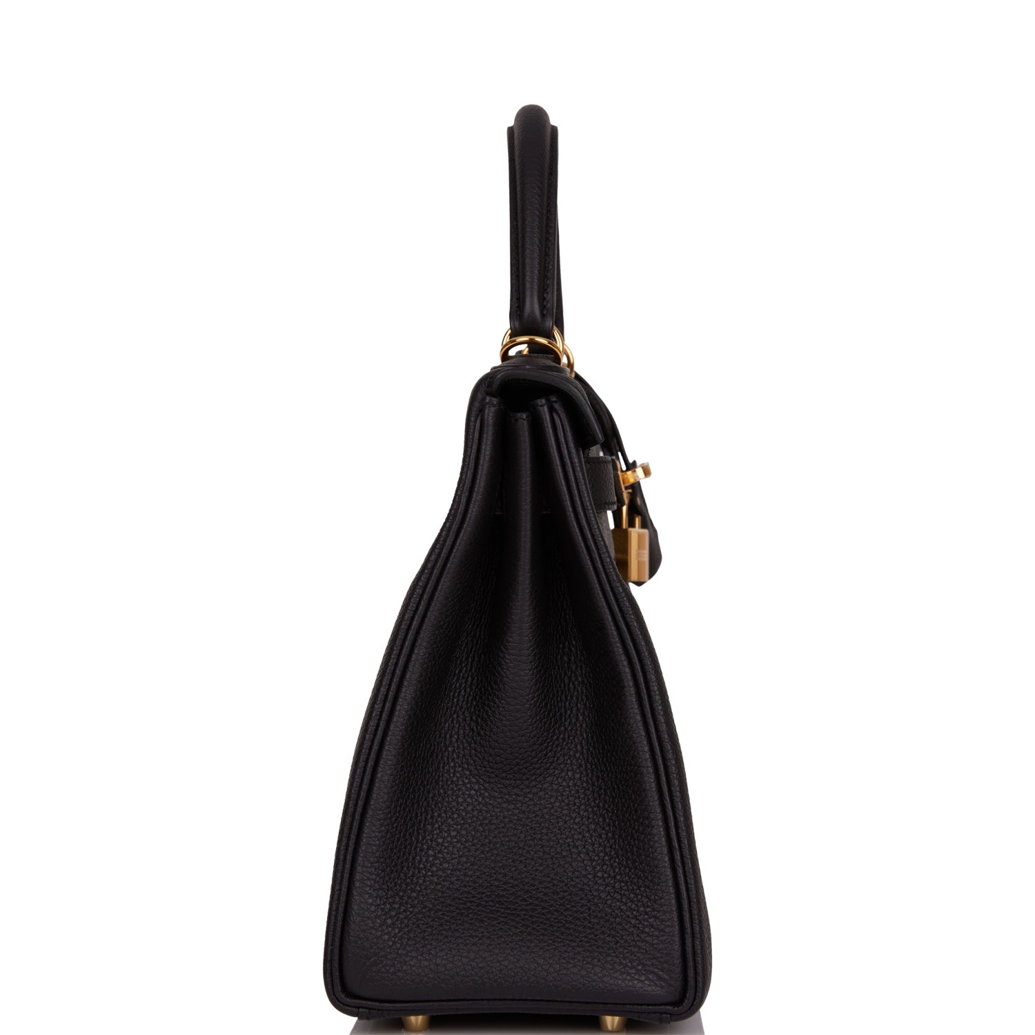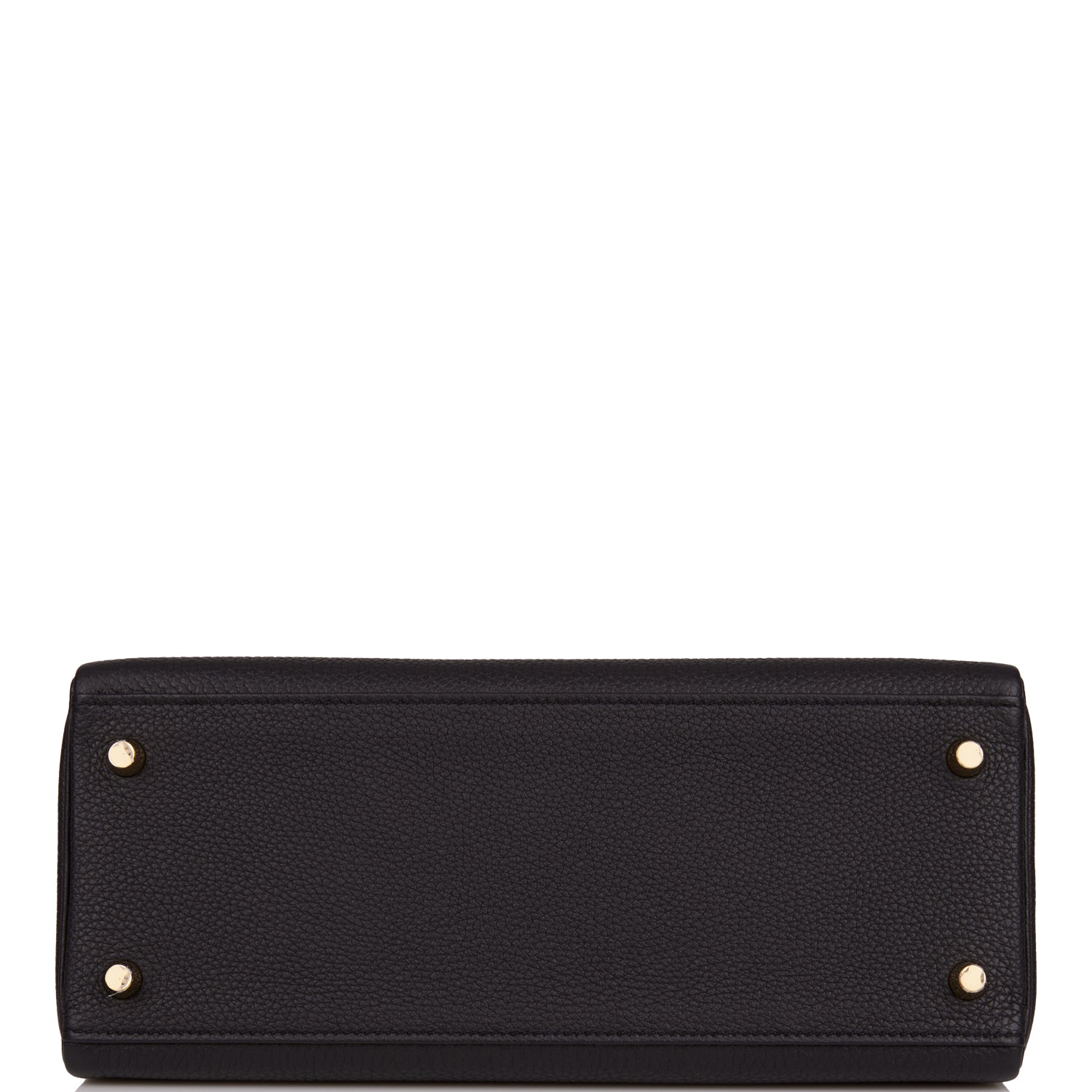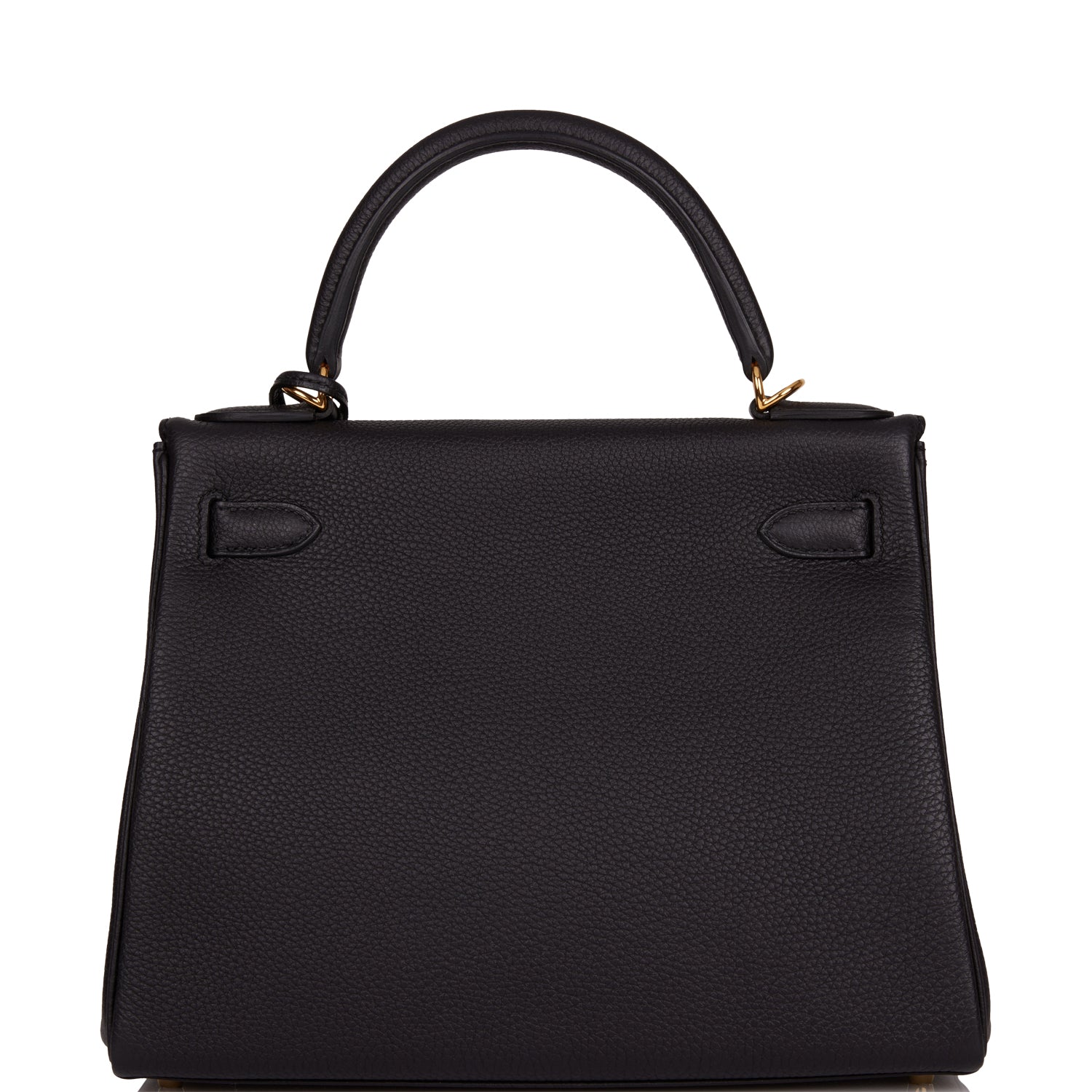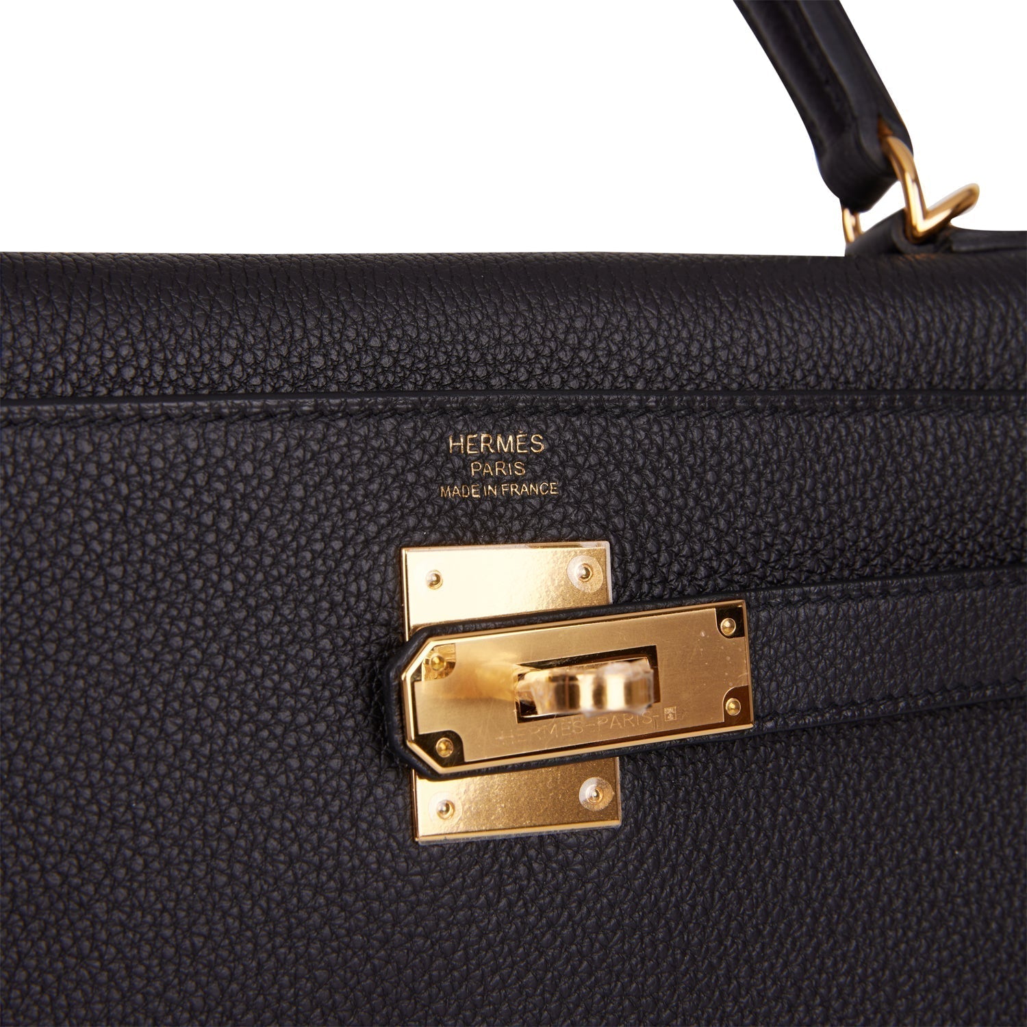 This Kelly, in the Retourne style, is in Black togo leather with gold hardware and has tonal stitching,front flap, two straps with center toggle closure, clochette with lock and two keys, single rolled handle and removable shoulder strap.
