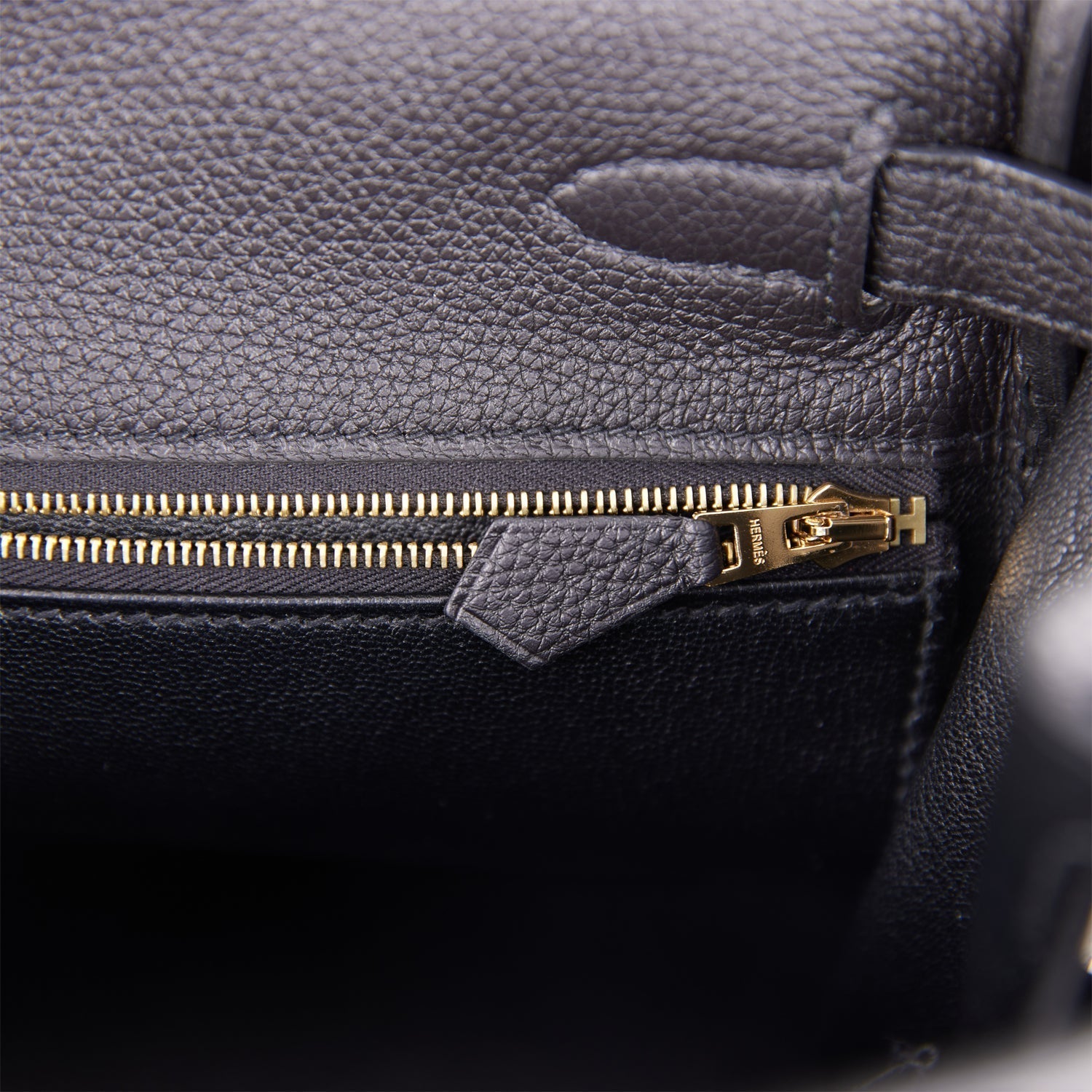 The interior is lined in black chevre and has one zip pocket with Hermes engraved pull and two open pockets on the opposite side.