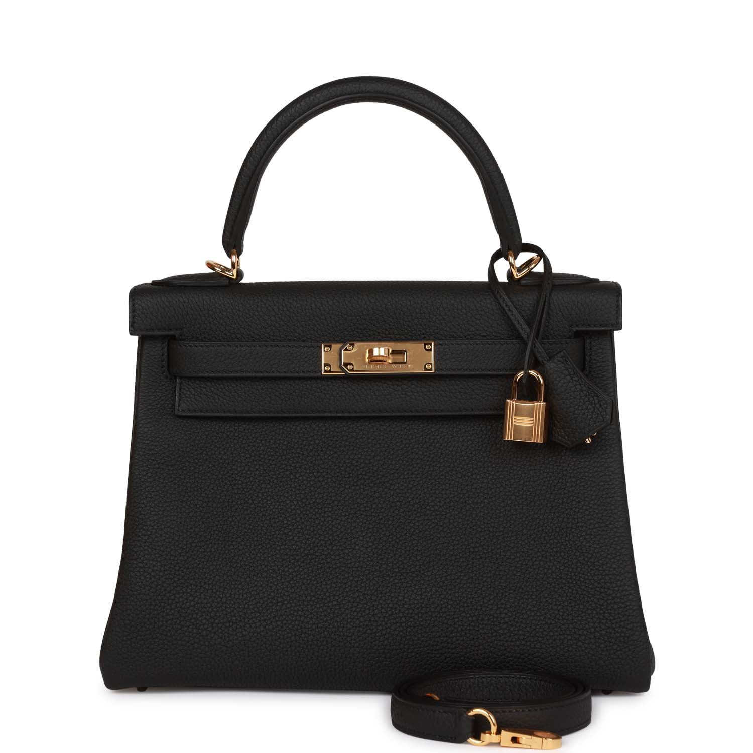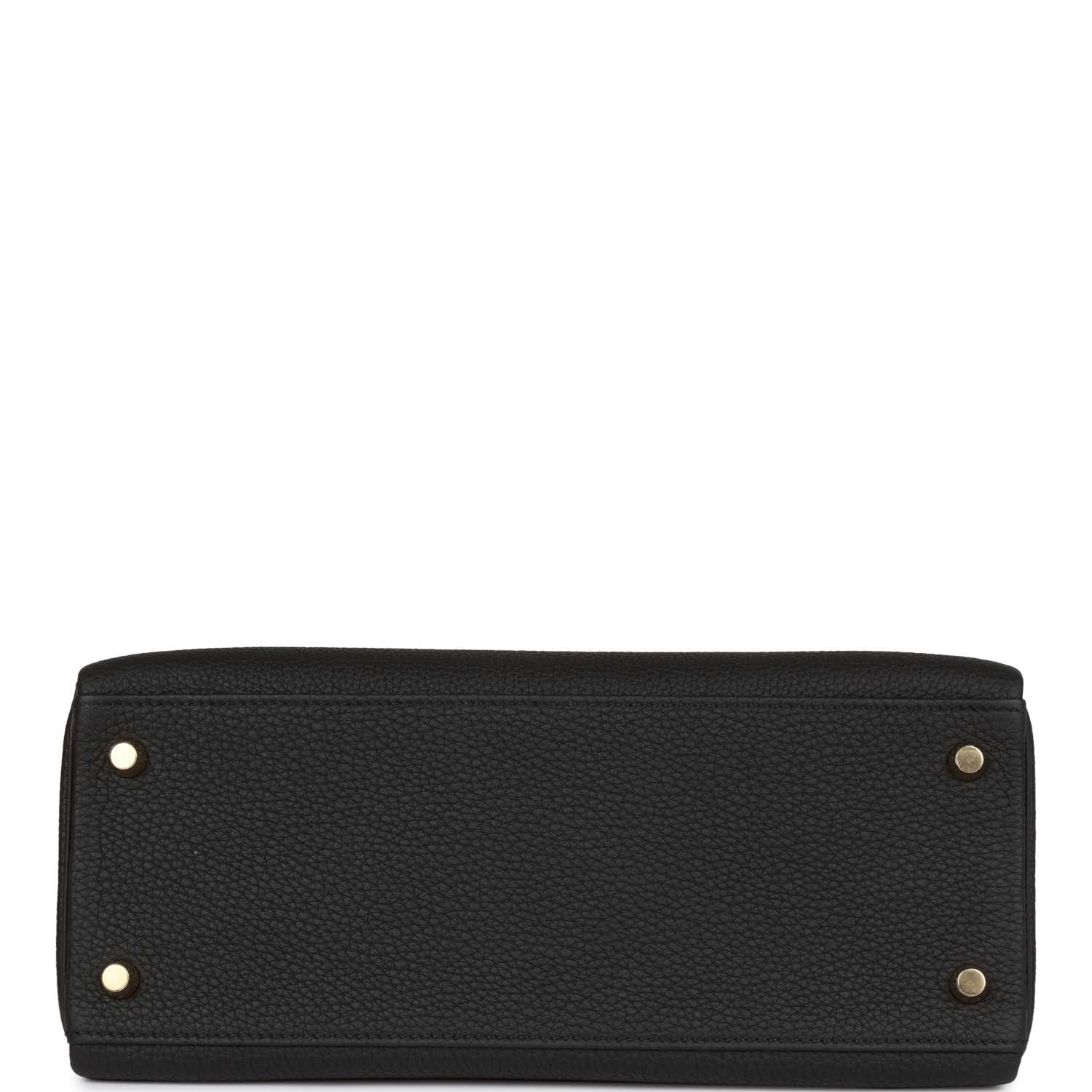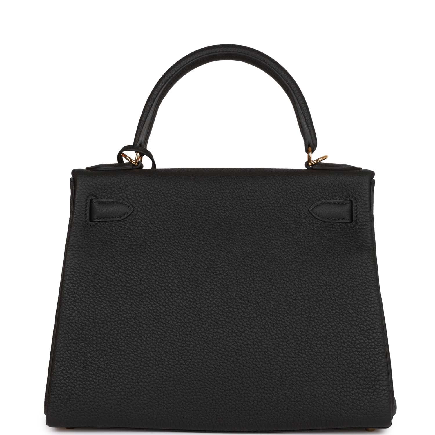 This Kelly, in the Retourne style, is in Black togo leather with gold hardware and has tonal stitching, front flap, two straps with center toggle closure, clochette with lock and two keys, single rolled handle and removable shoulder strap.