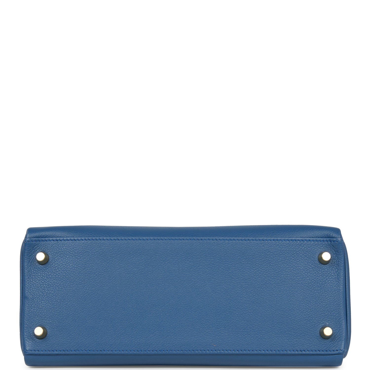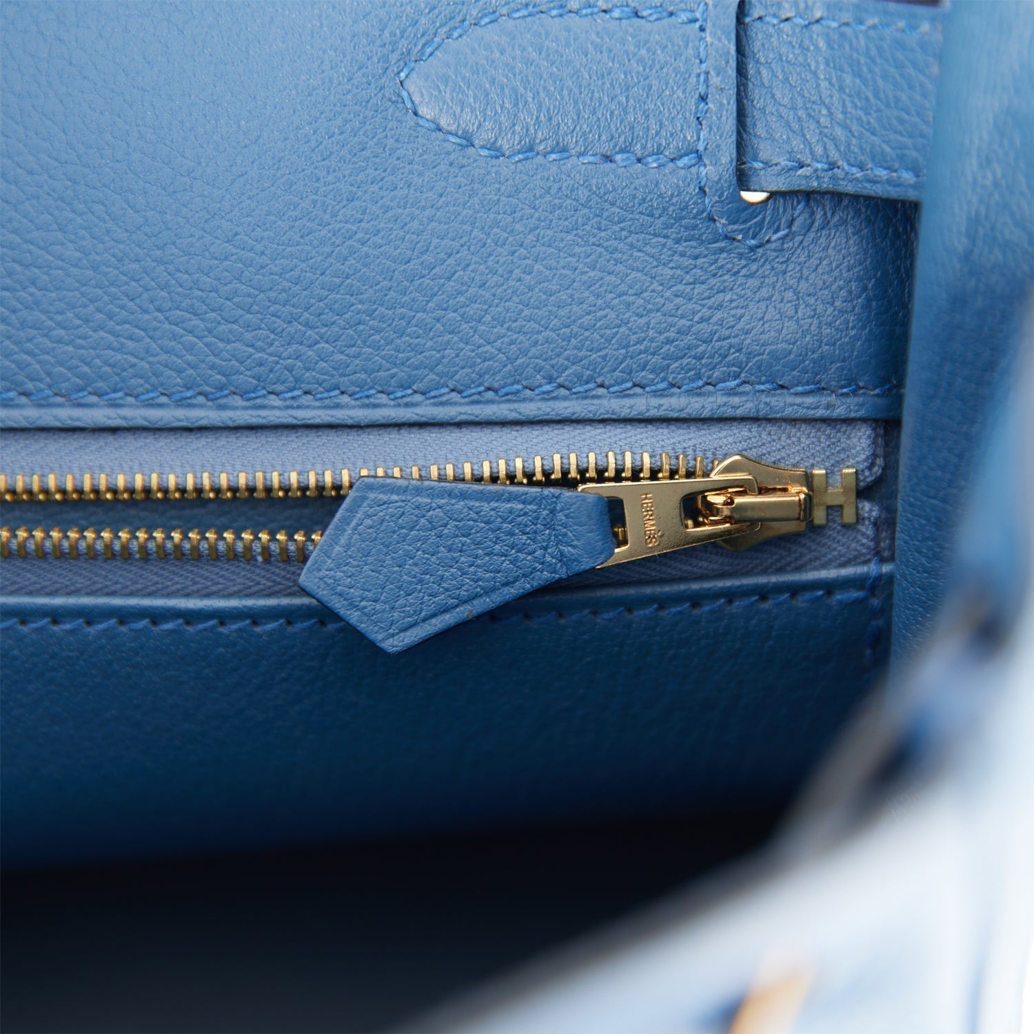 The interior is lined in Bleu Agate chevre and has one zip pocket with Hermes engraved pull and two open pockets on the opposite side.