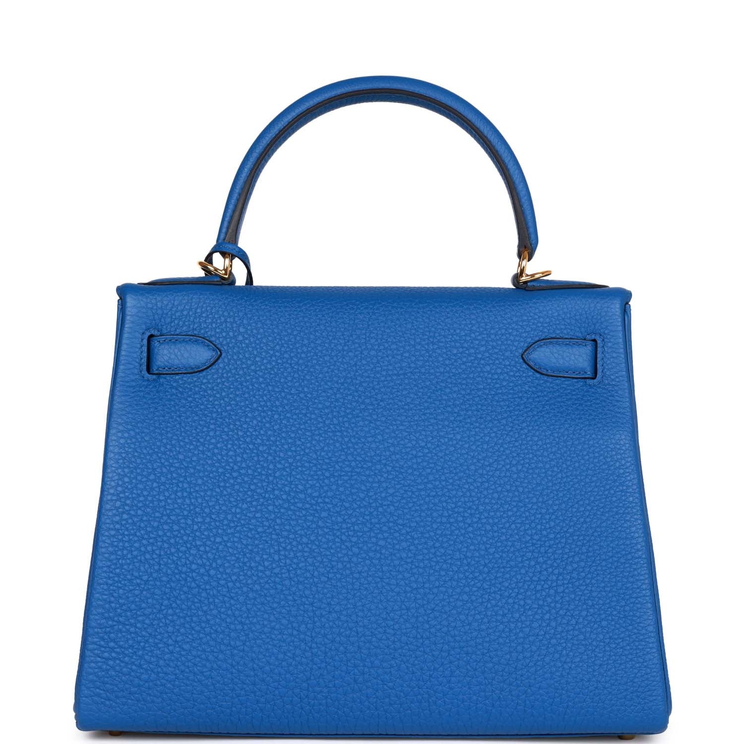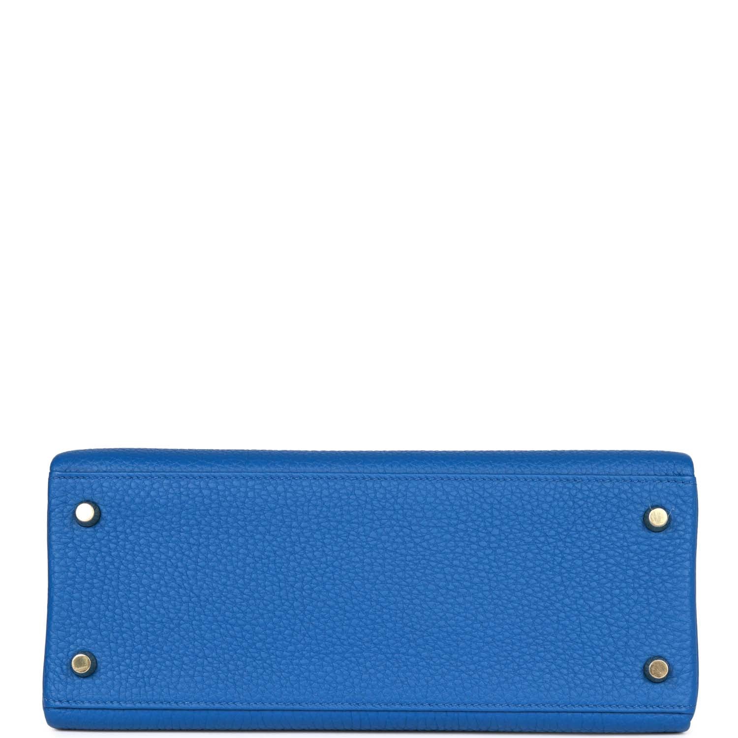 This Kelly, in the Retourne style, is in Bleu France togo leather with gold hardware and has tonal stitching, front flap, two straps with center toggle closure, clochette with lock and two keys, single rolled handle and removable shoulder strap.
