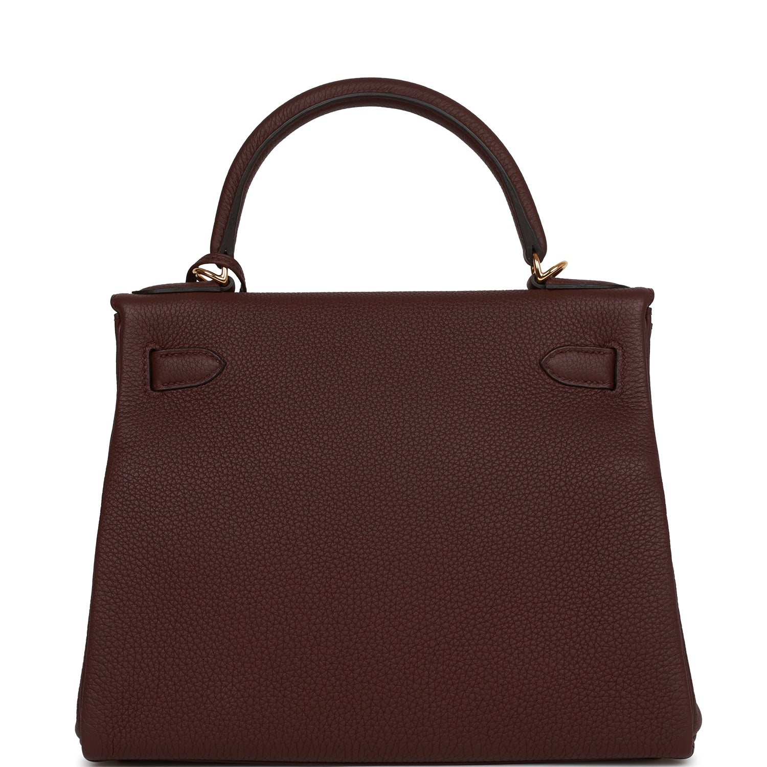 This Kelly, in the Retourne style, is in Bordeaux togo leather with gold hardware and has tonal stitching, front flap, two straps with center toggle closure, clochette with lock and two keys, single rolled handle and removable shoulder strap.