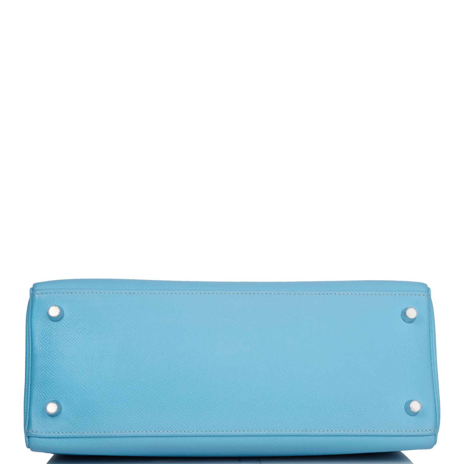 This Kelly, in the Retourne style, is in Celeste epsom leather with palladium hardware and has contrast stitching, front flap, two straps with center toggle closure, clochette with lock and two keys, single rolled handle and removable shoulder strap.