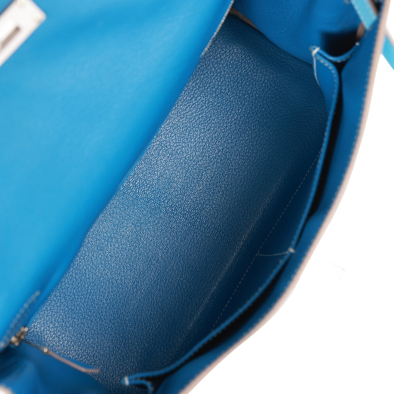 The interior is lined in Mykonos chevre and has one zip pocket with Hermes engraved pull and two open pockets on the opposite side.