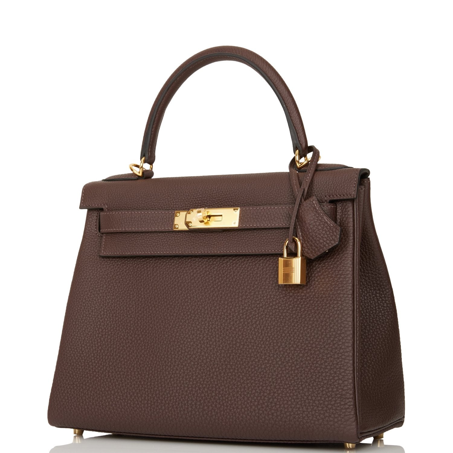This Kelly, in the Retourne style, is in Chocolate togo leather with gold hardware and has tonal stitching, front flap, two straps with center toggle closure, clochette with lock and two keys, single rolled handle and removable shoulder strap.