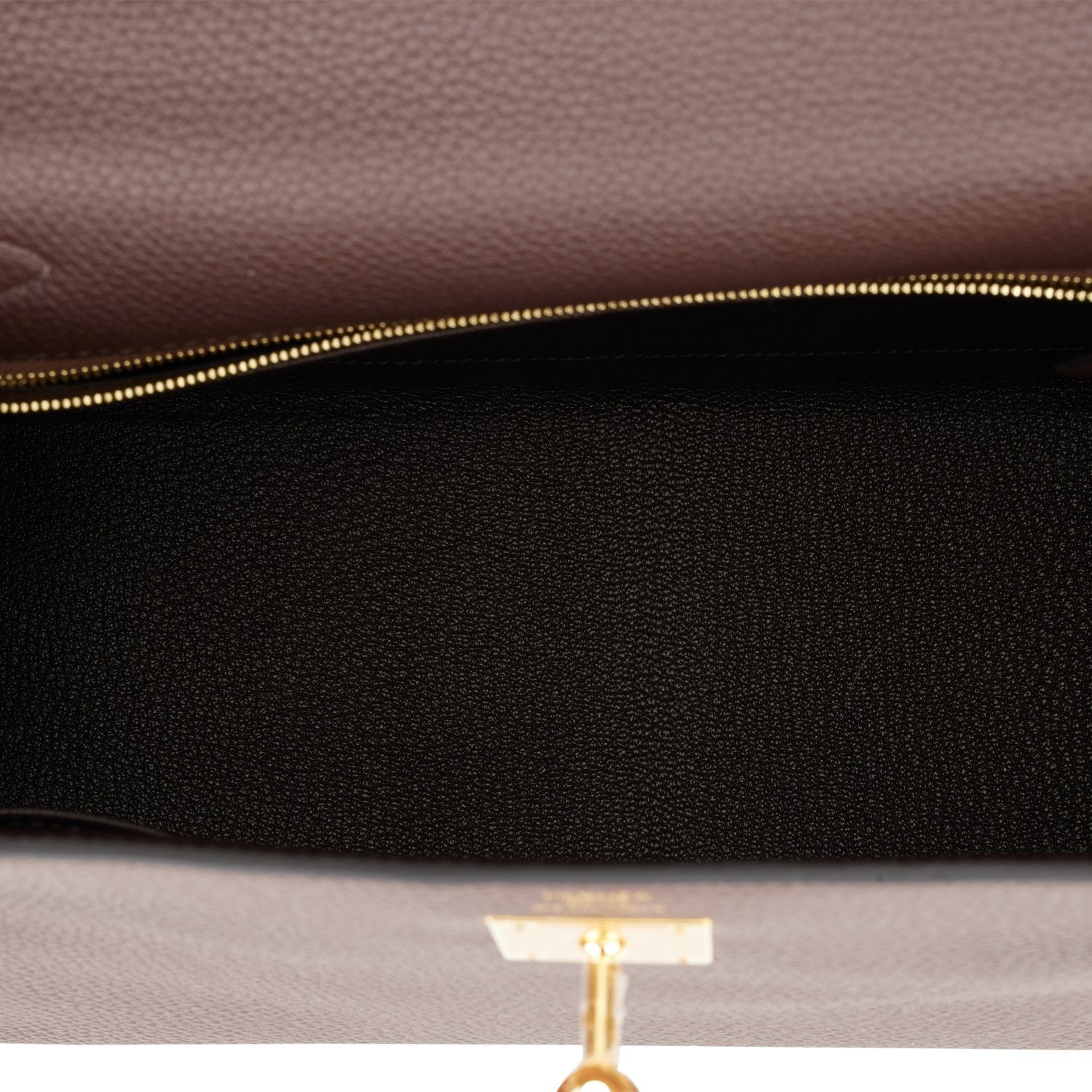 The interior is lined in Chocolate chevre and has one zip pocket with Hermes engraved pull and two open pockets on the opposite side.