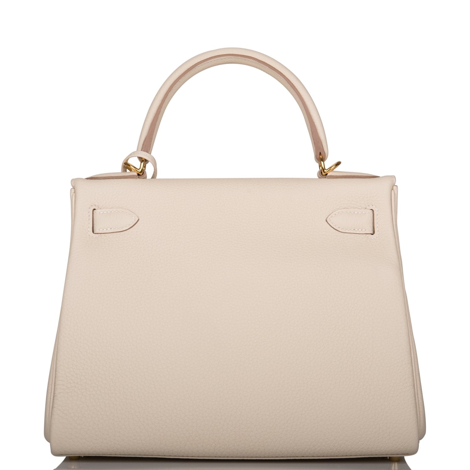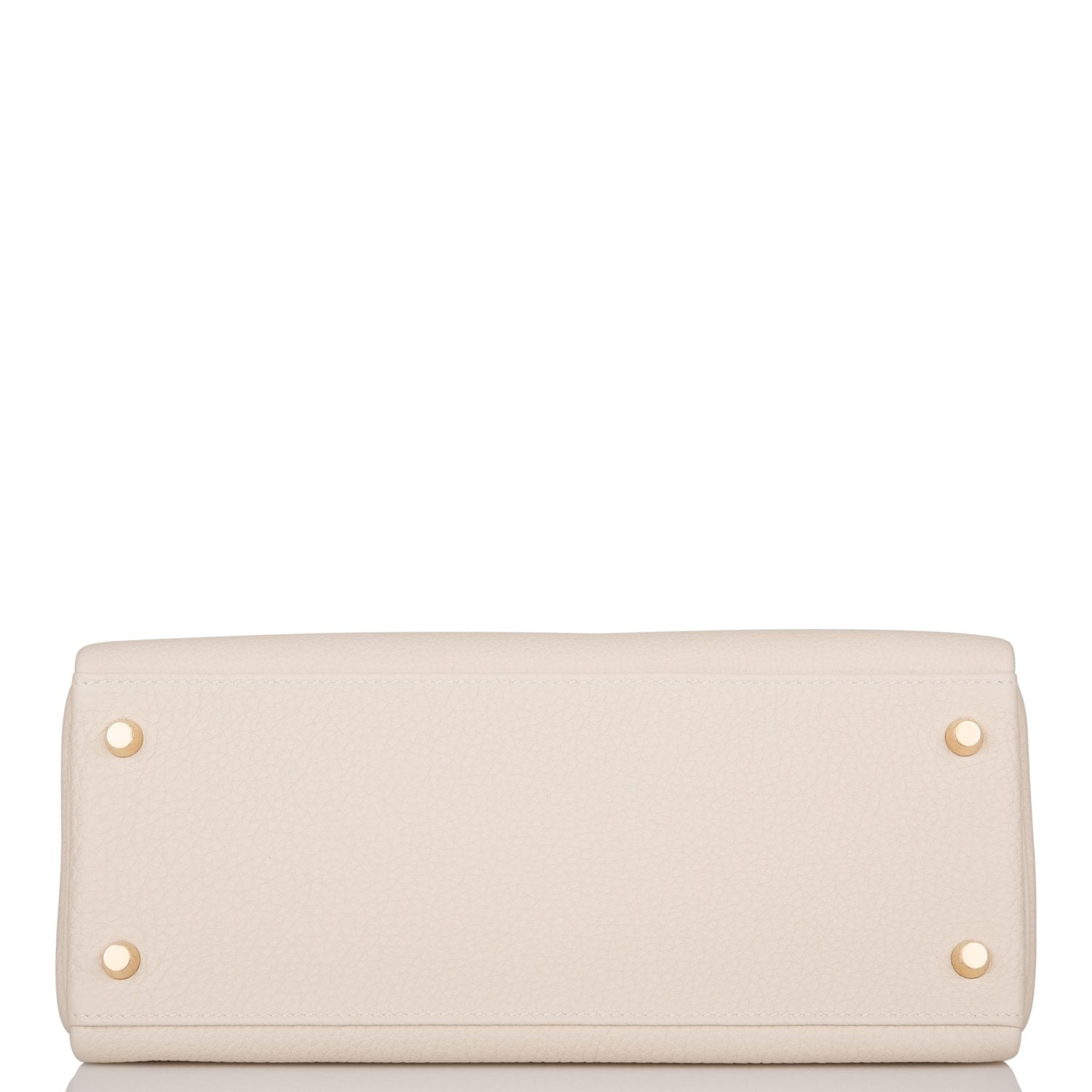 This Kelly, in the Retourne style, is in Craie togo leather with gold hardware and has tonal stitching,front flap, two straps with center toggle closure, clochette with lock and two keys, single rolled handle and removable shoulder strap.