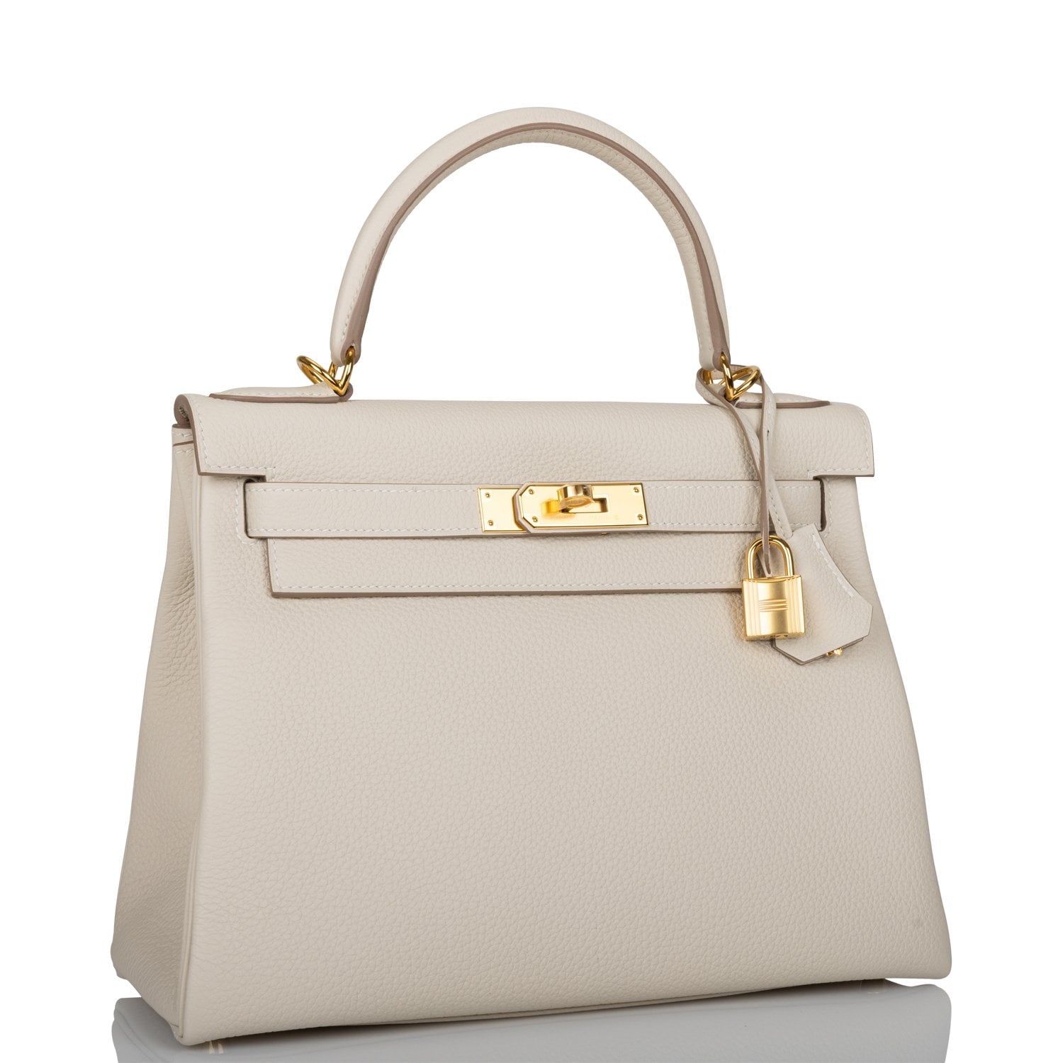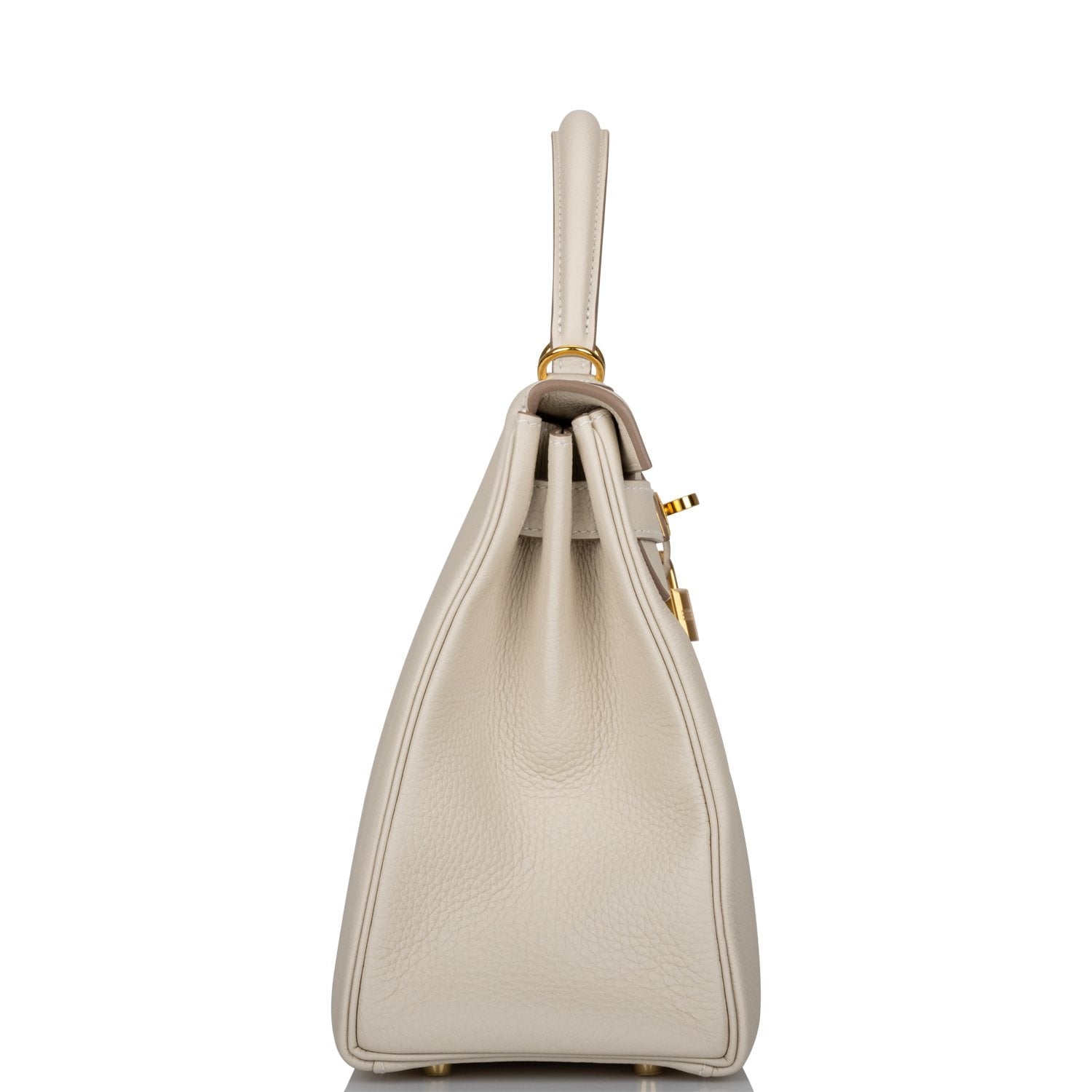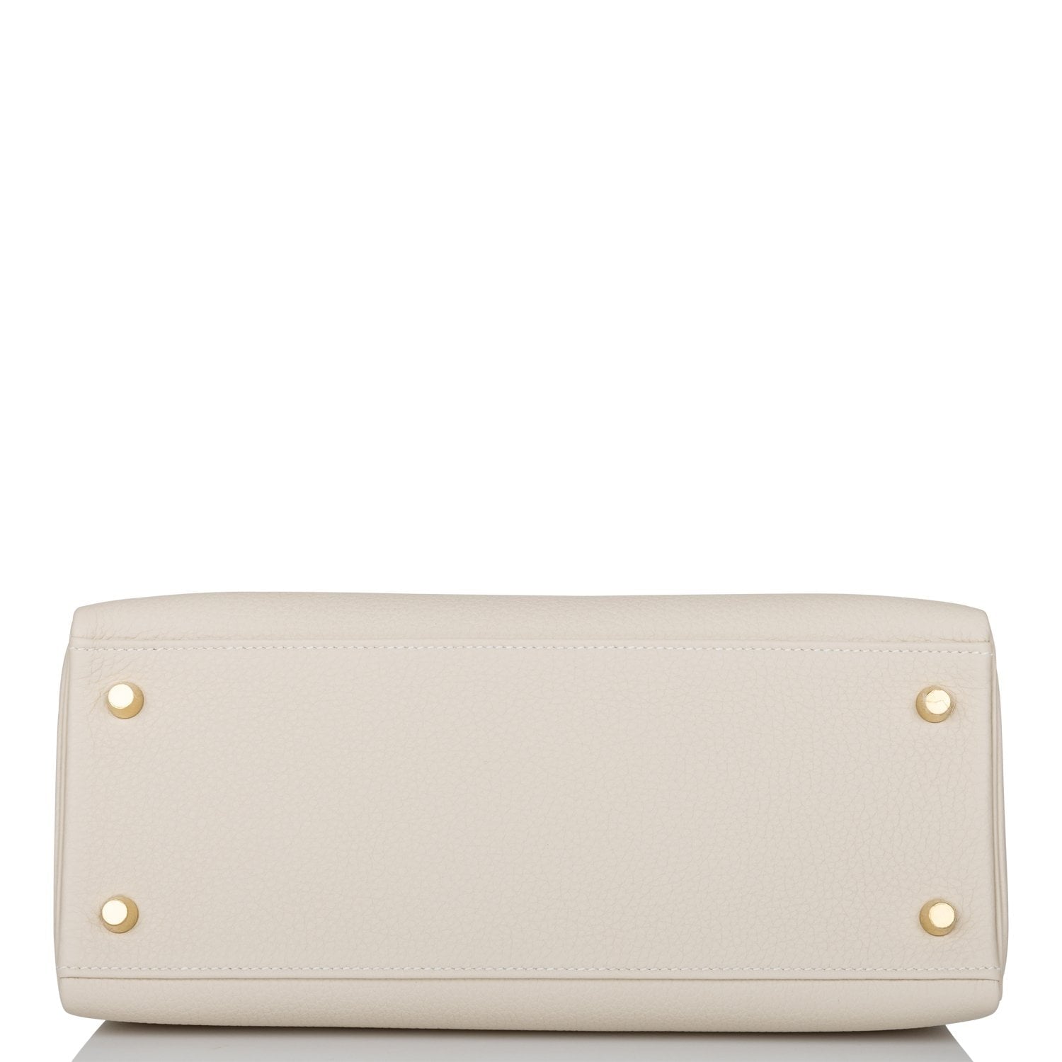 This Kelly, in the Retourne style, is in Craie togo leather with gold hardware and has tonal stitching,front flap, two straps with center toggle closure, clochette with lock and two keys, single rolled handle and removable shoulder strap.