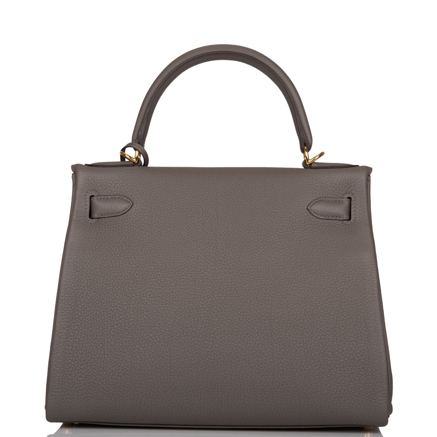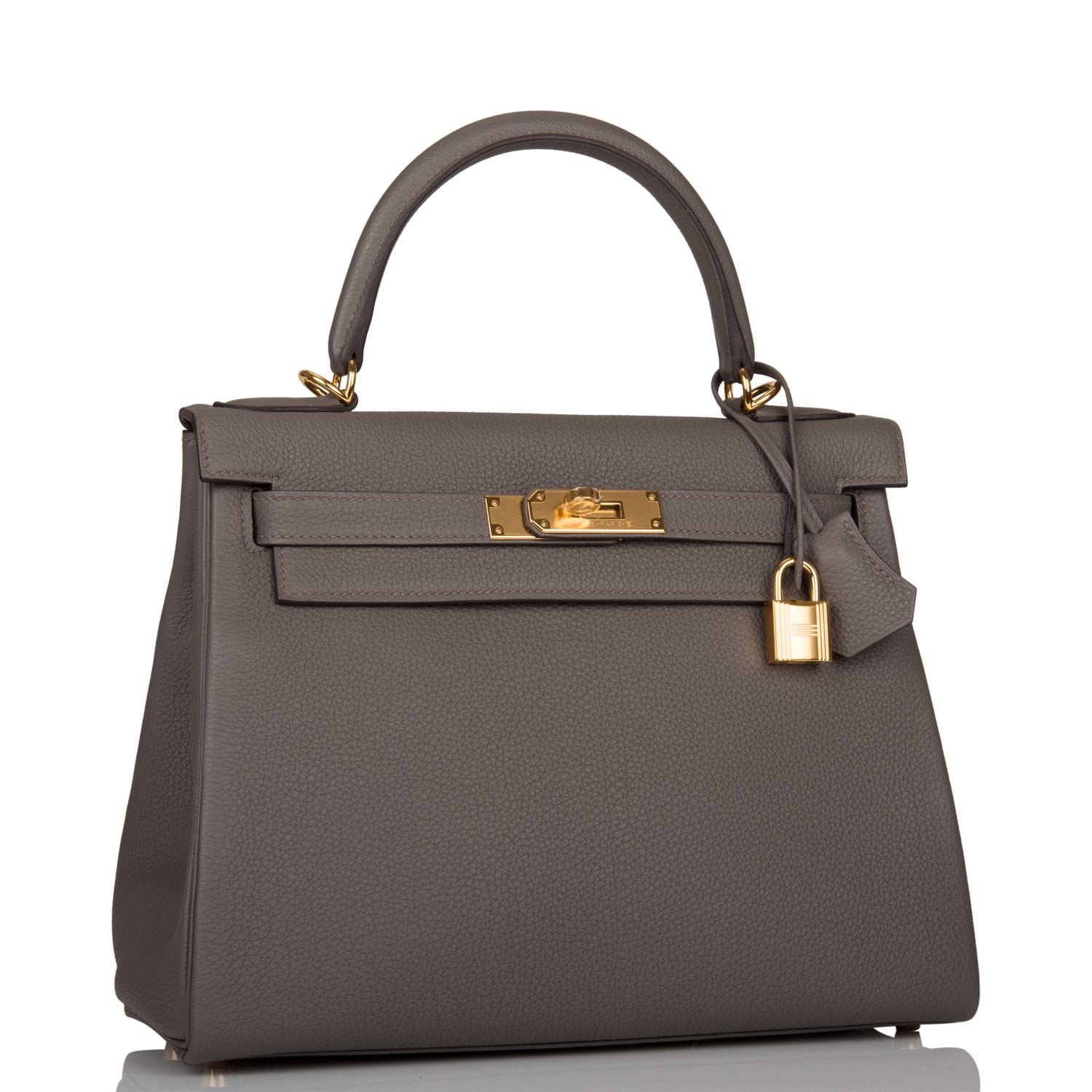 This Kelly, in the Retourne style, is in Etain togo leather with gold hardware and has tonal stitching,front flap, two straps with center toggle closure, clochette with lock and two keys, single rolled handle and removable shoulder strap.