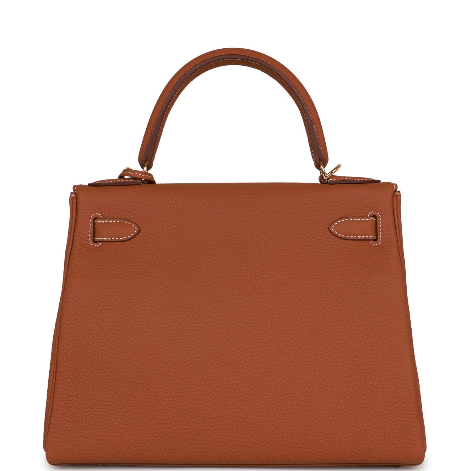 This Kelly, in the Retourne style, is in Gold togo leather with gold hardware and has white contrast stitching,front flap, two straps with center toggle closure, clochette with lock and two keys, single rolled handle and removable shoulder strap.