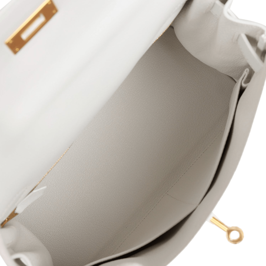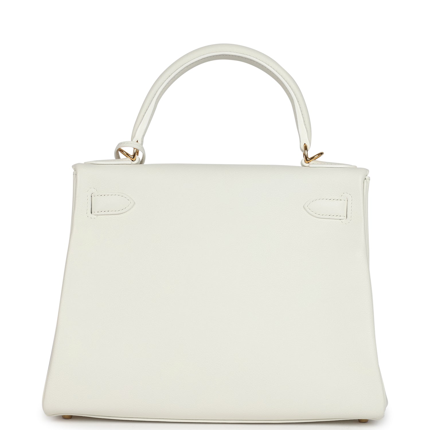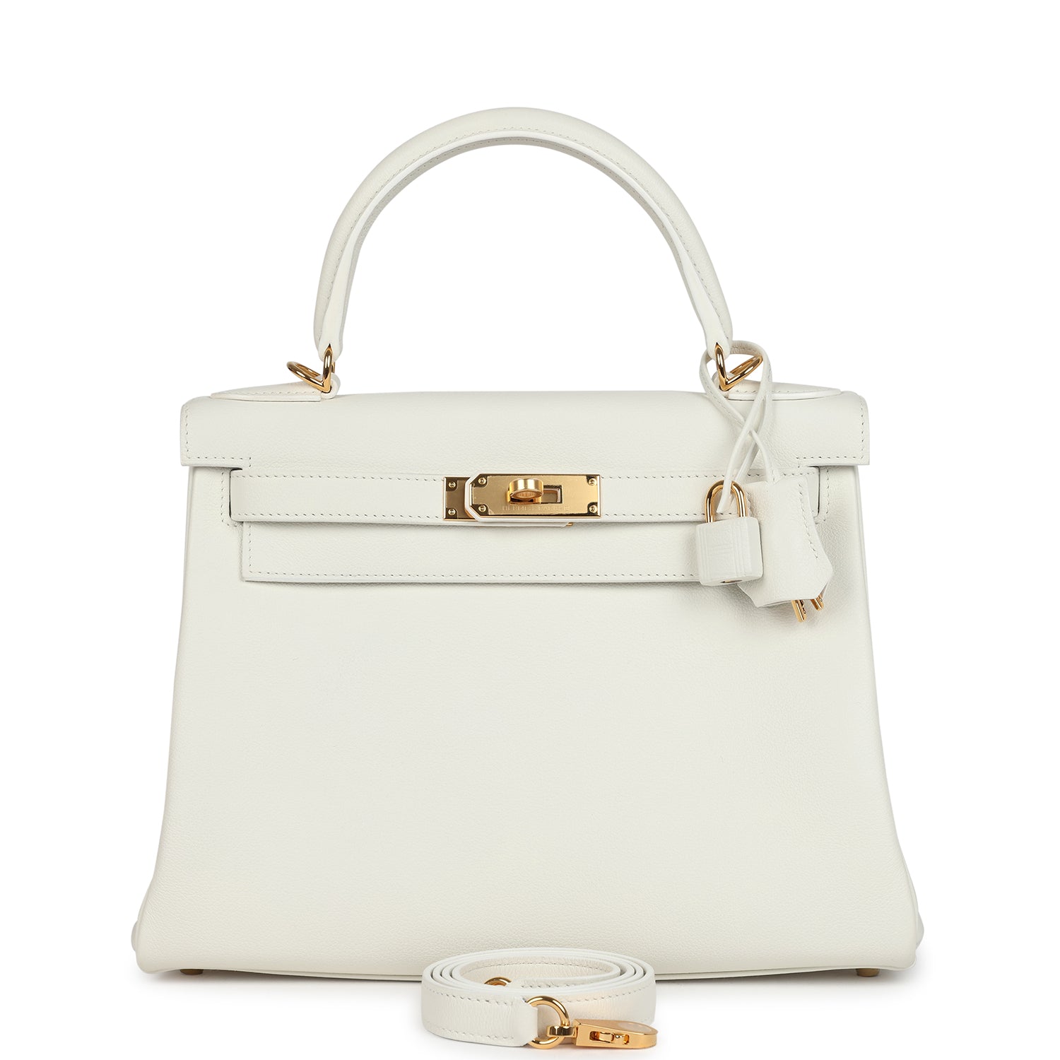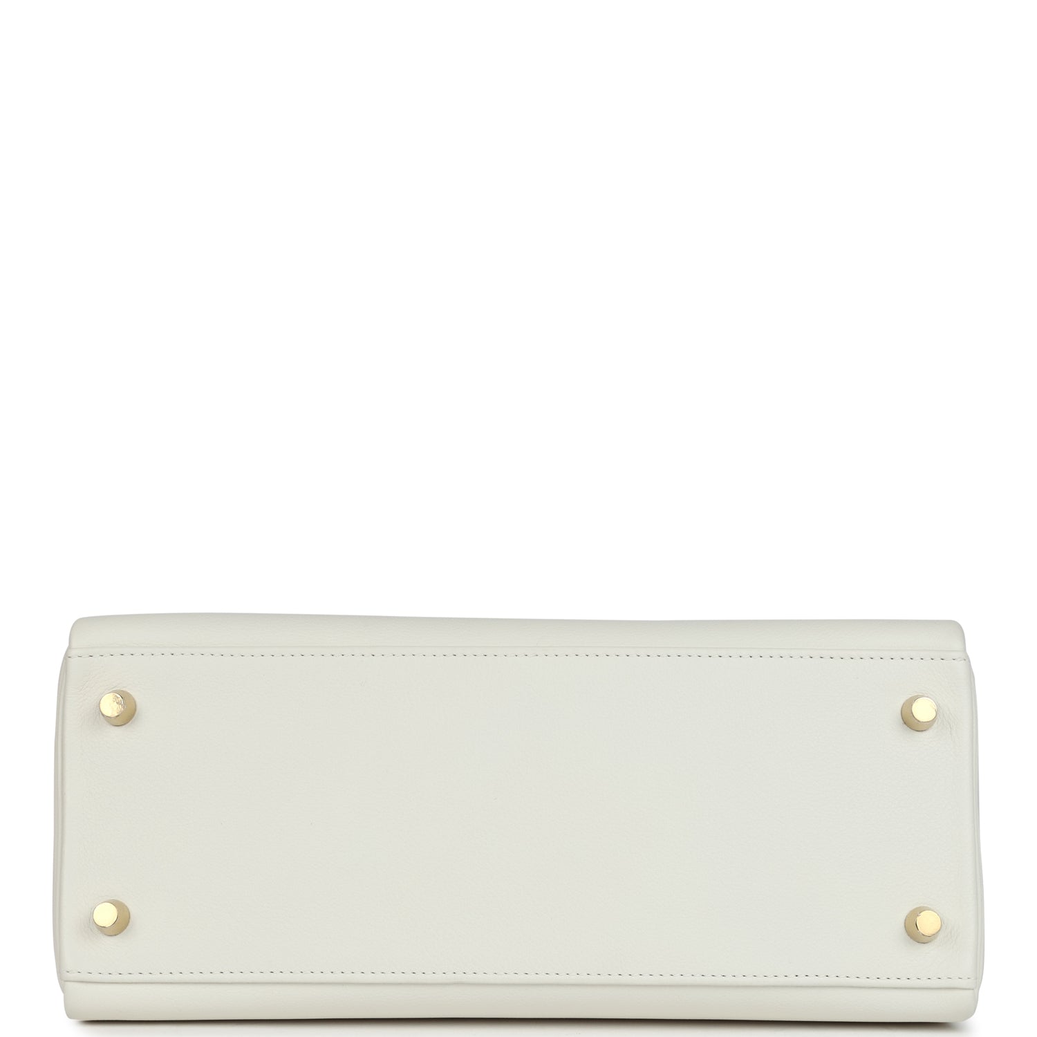 This Kelly, in the Retourne style, is in White Evercolor leather with gold hardware and has tonal stitching, front flap, two straps with center toggle closure, clochette with lock and two keys, single rolled handle and a removable shoulder strap.