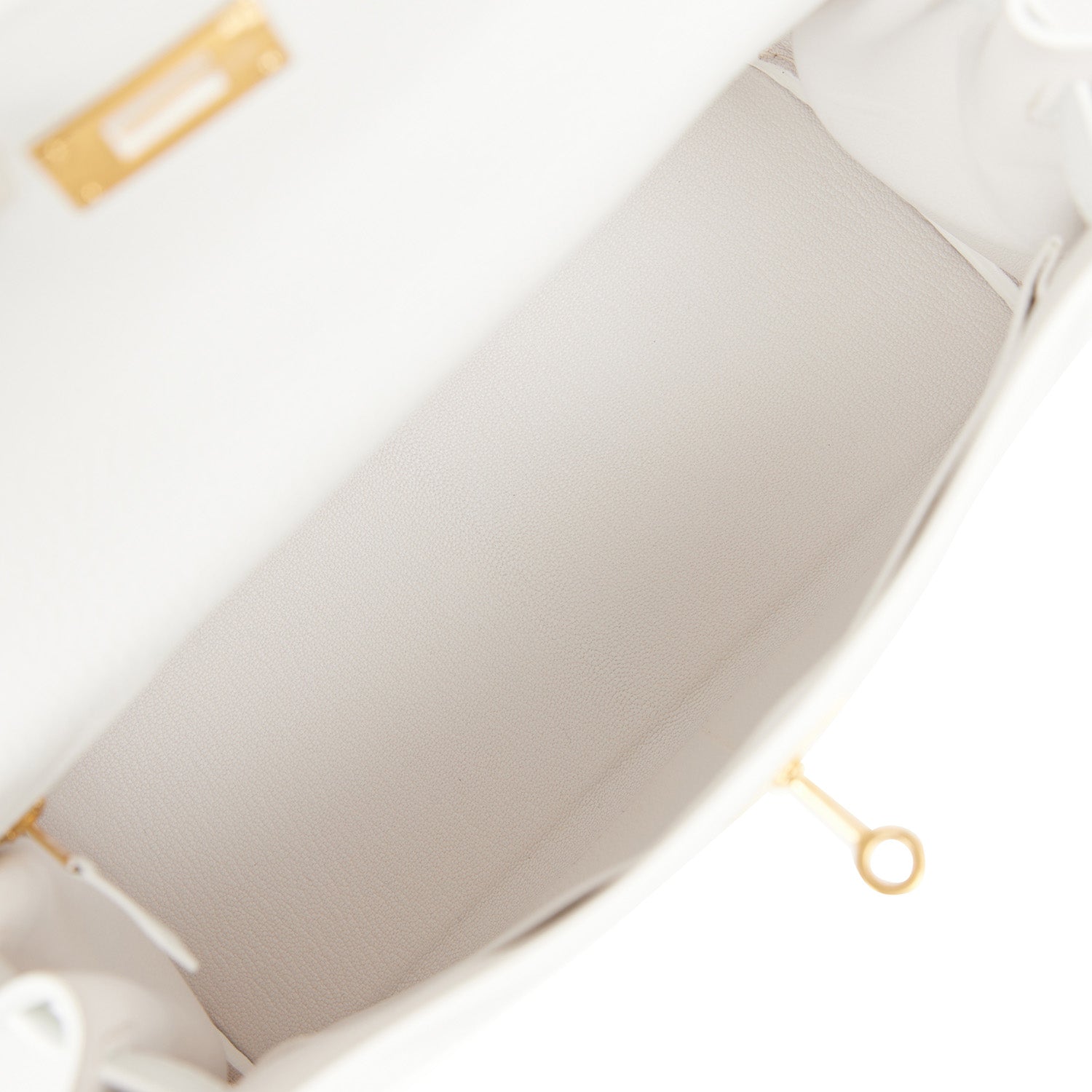This Kelly, in the Retourne style, is in White clemence leather with gold hardware and has tonal stitching,front flap, two straps with center toggle closure, clochette with lock and two keys, single rolled handle and removable shoulder strap.
