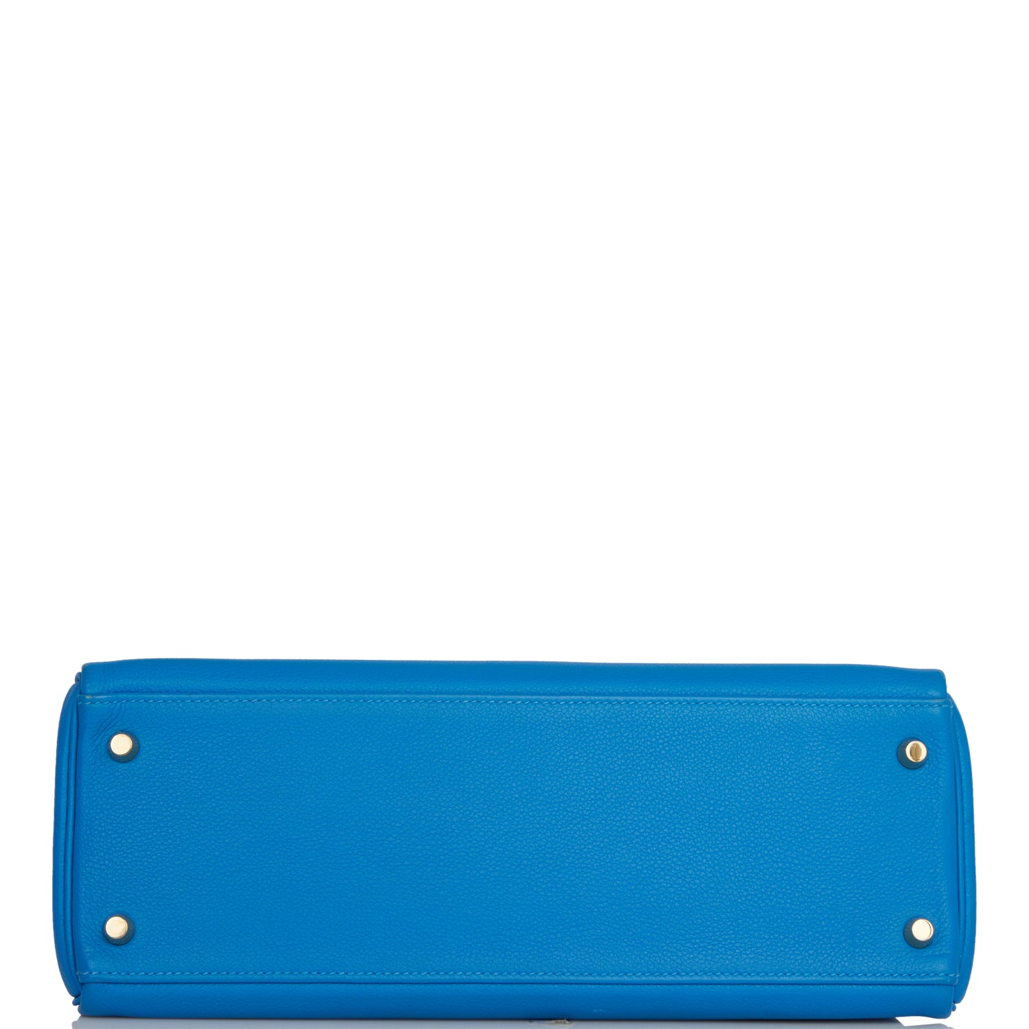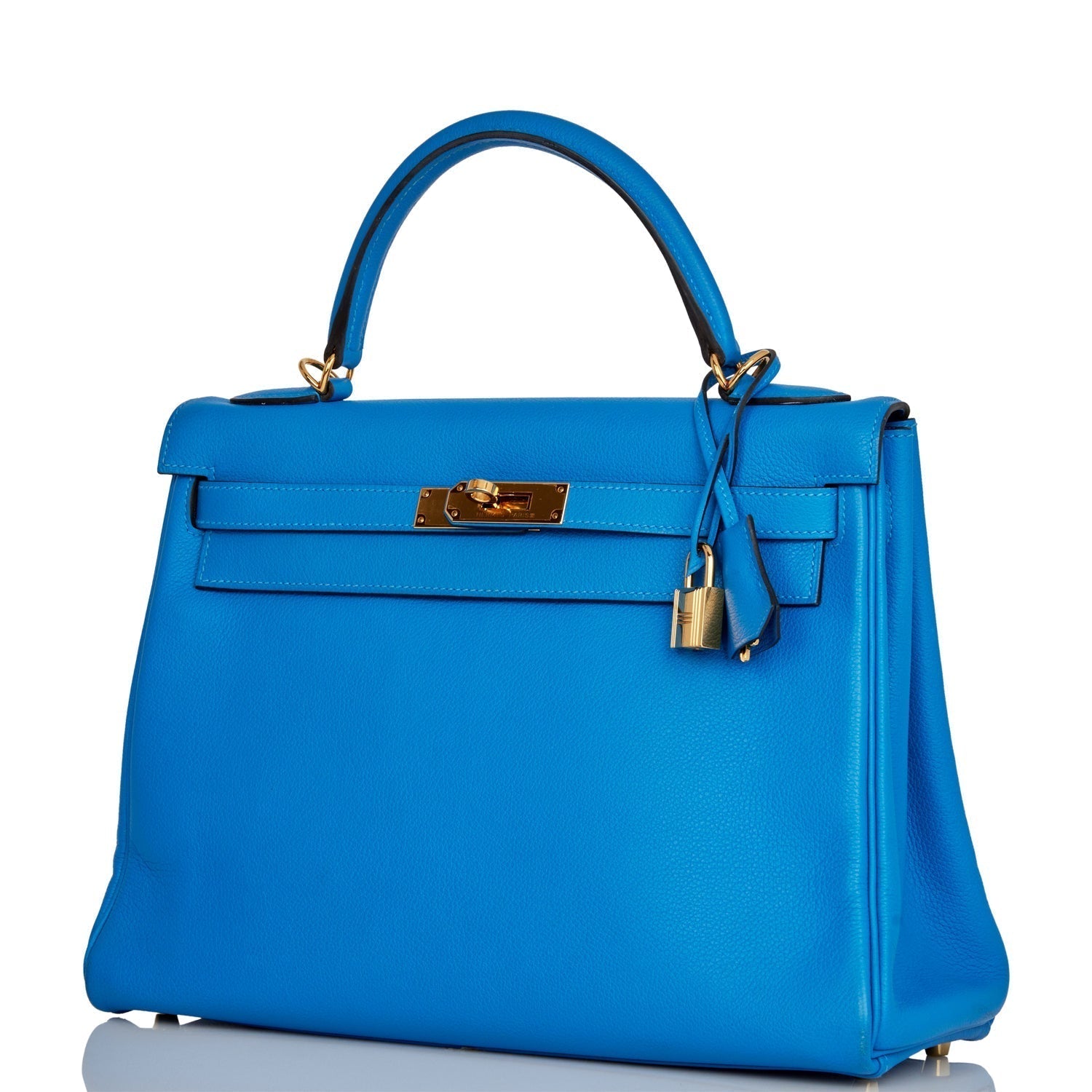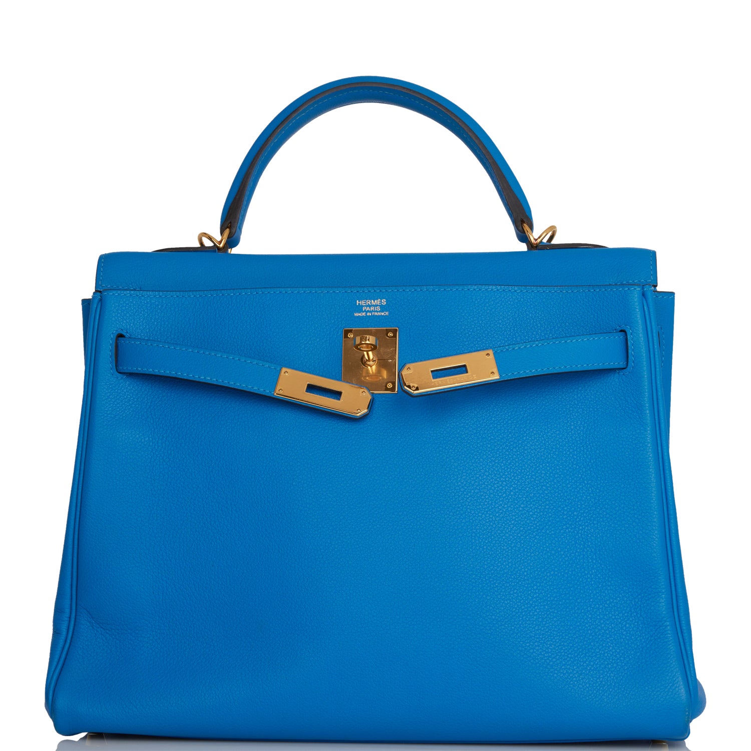 This Kelly, in the Retourne style, is in Bleu Hydra evercolor leather with gold hardware and has tonal stitching, two straps with front toggle closure, clochette with lock and two keys, single rolled handle and removable shoulder strap.