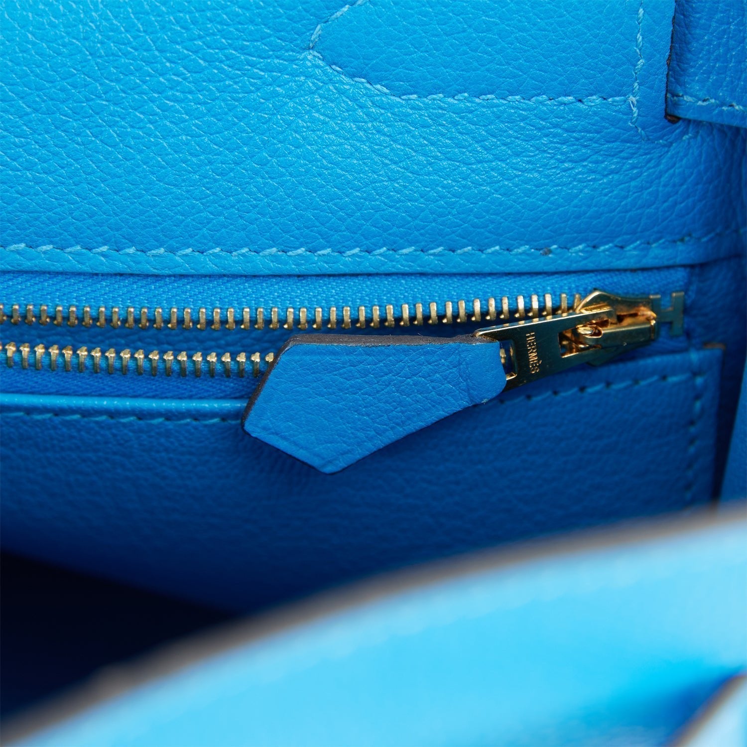 The interior is lined with Bleu Hydra chevre and features one zip pocket with an Hermes engraved pull and two open pockets on the opposite side.