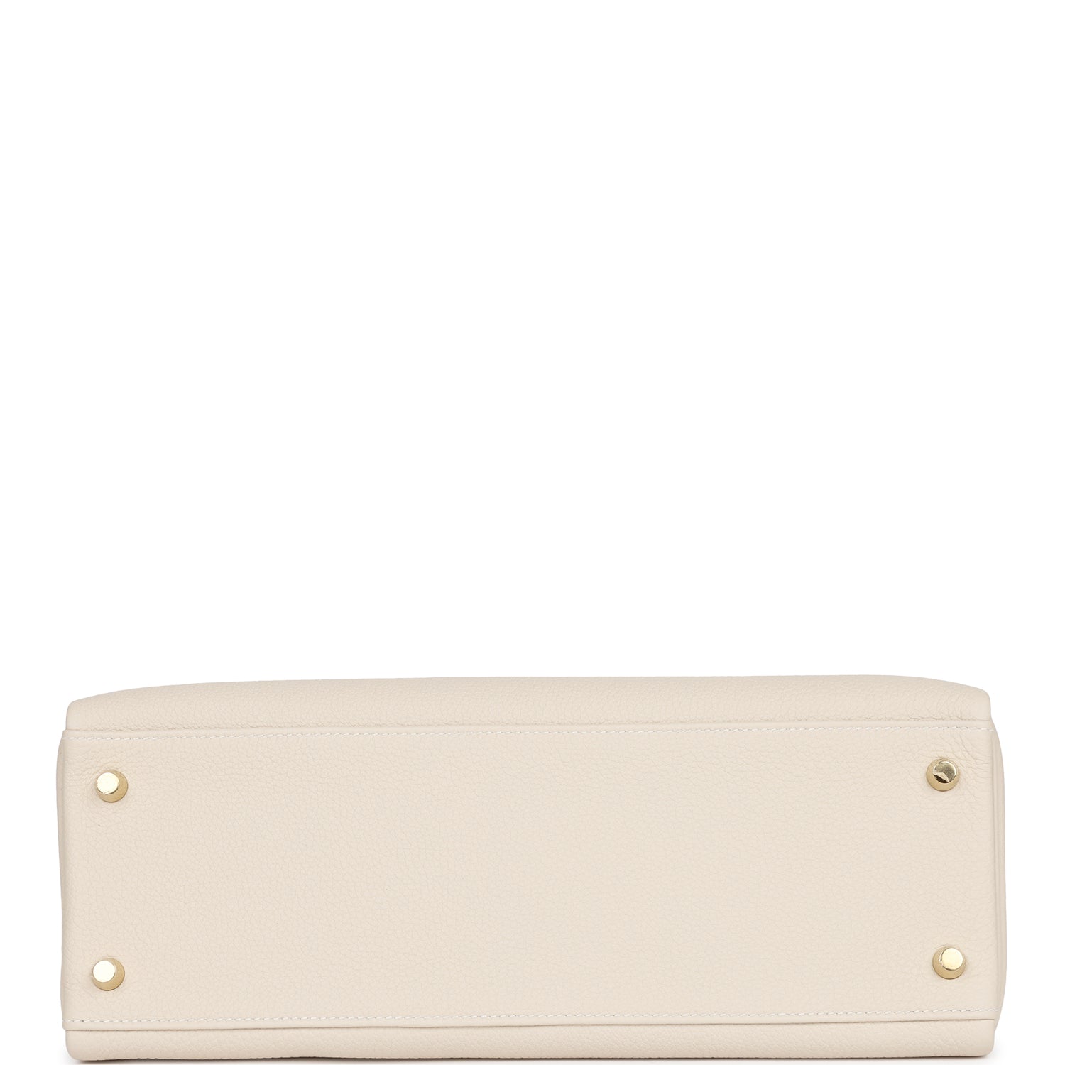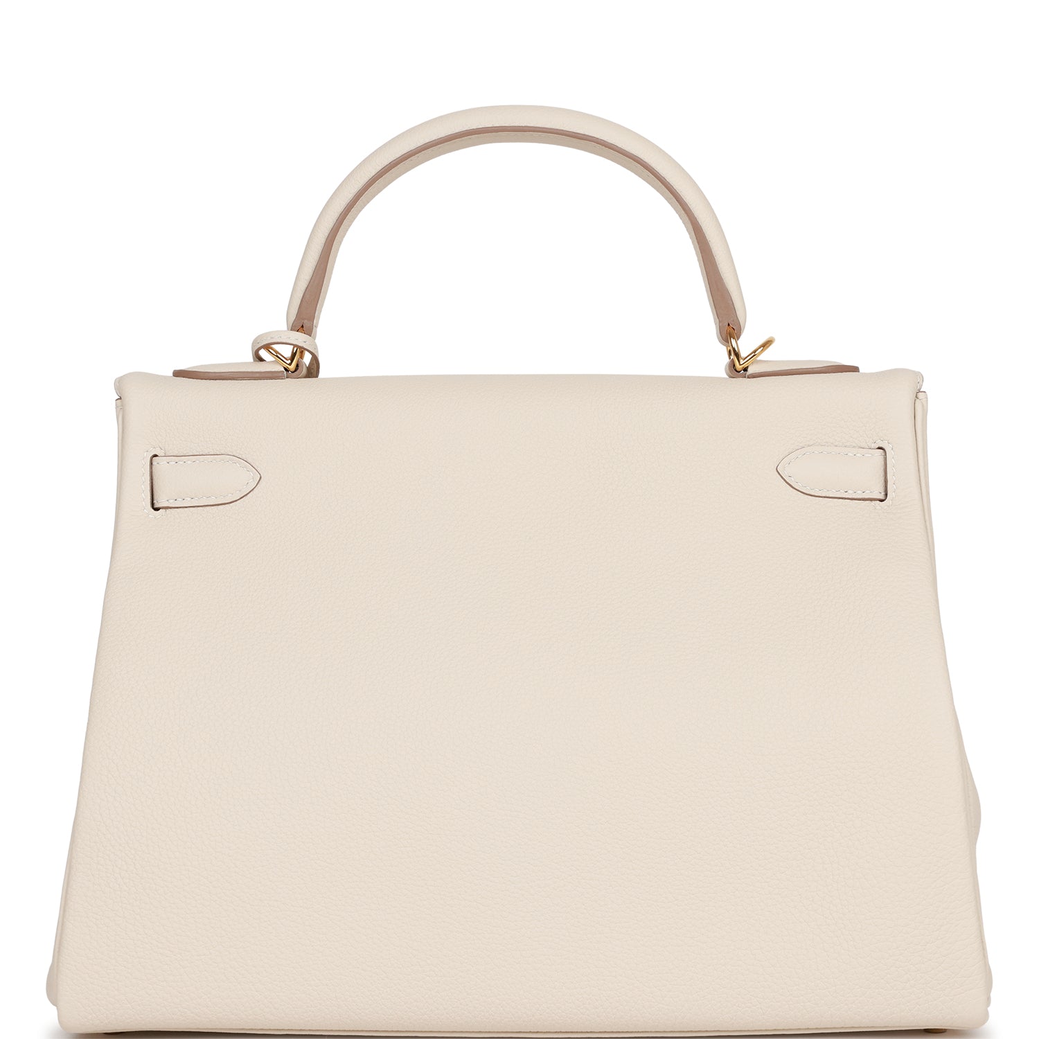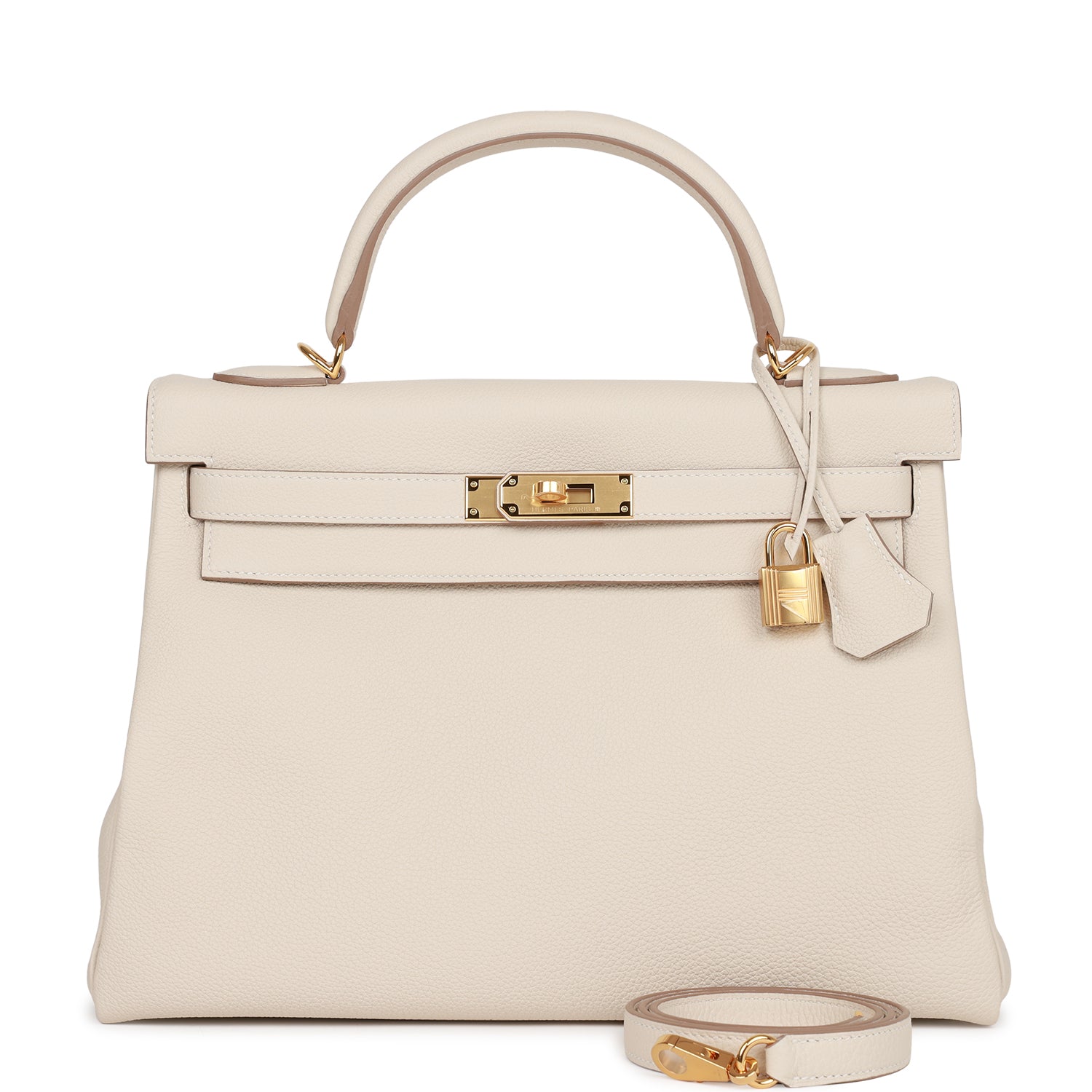 This Kelly, in the Retourne style, is in Craie togo leather with gold hardware and has tonal stitching, two straps with front toggle closure, clochette with lock and two keys, single rolled handle and removable shoulder strap.
