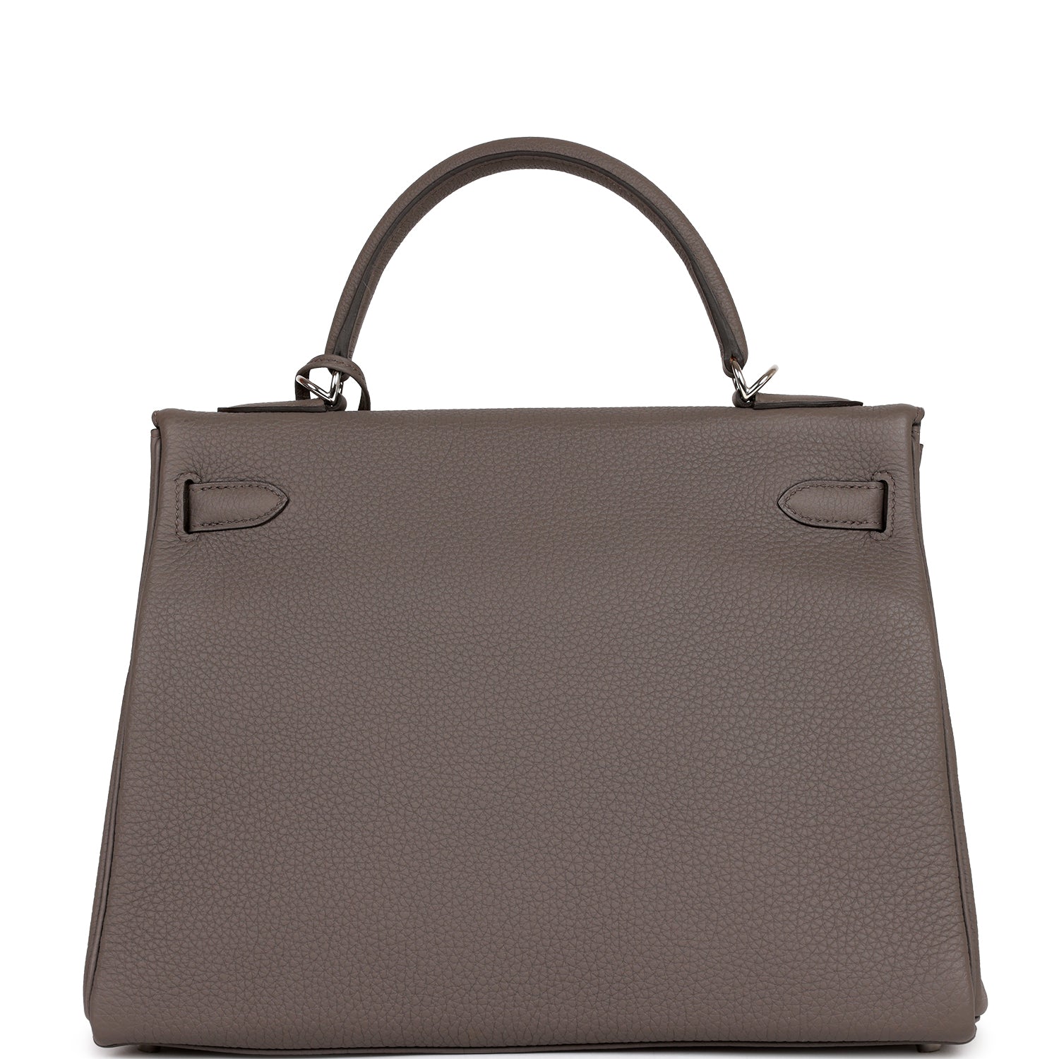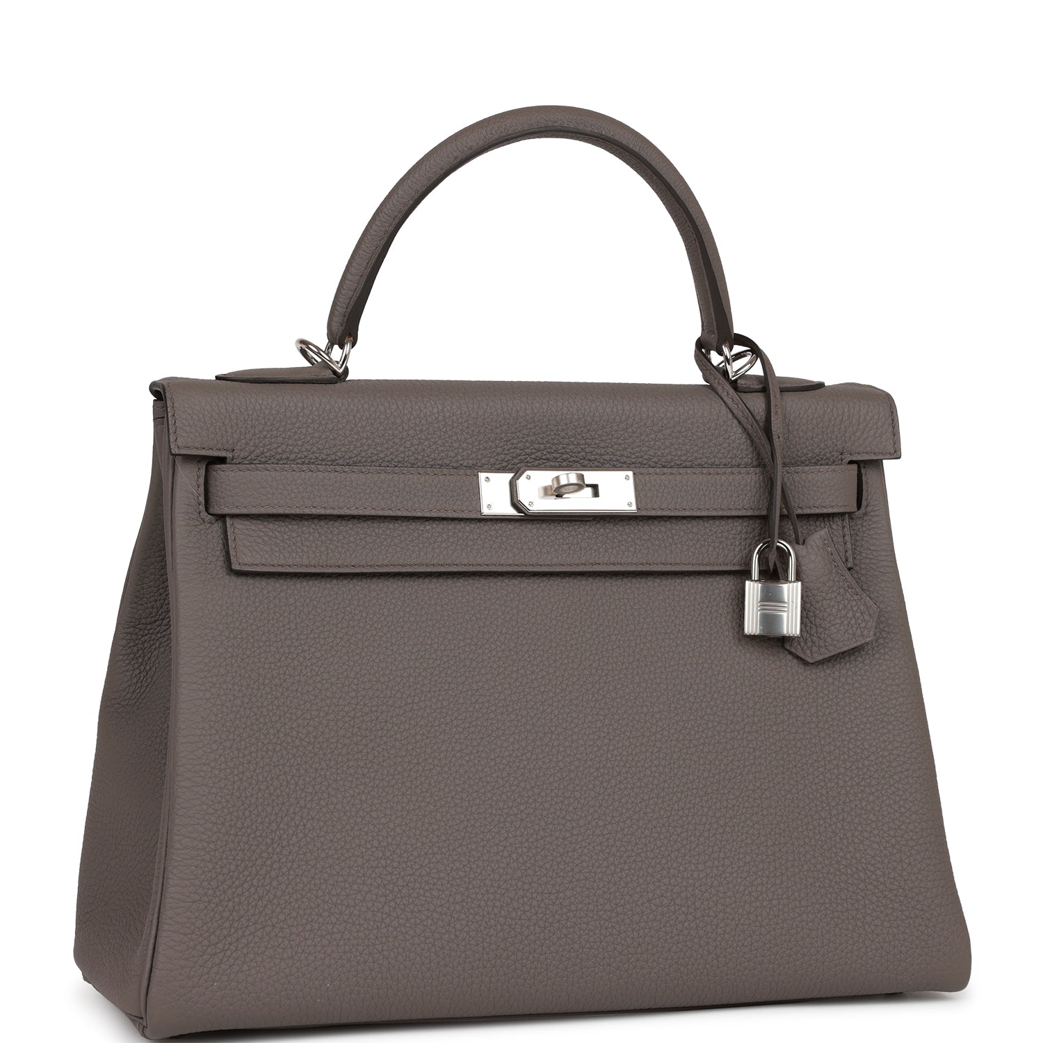 This Kelly, in the Retourne style, is in Etain togo leather with palladium hardware and has tonal stitching, front flap, two straps with center toggle closure, clochette with lock and two keys, single rolled handle and removable shoulder strap.