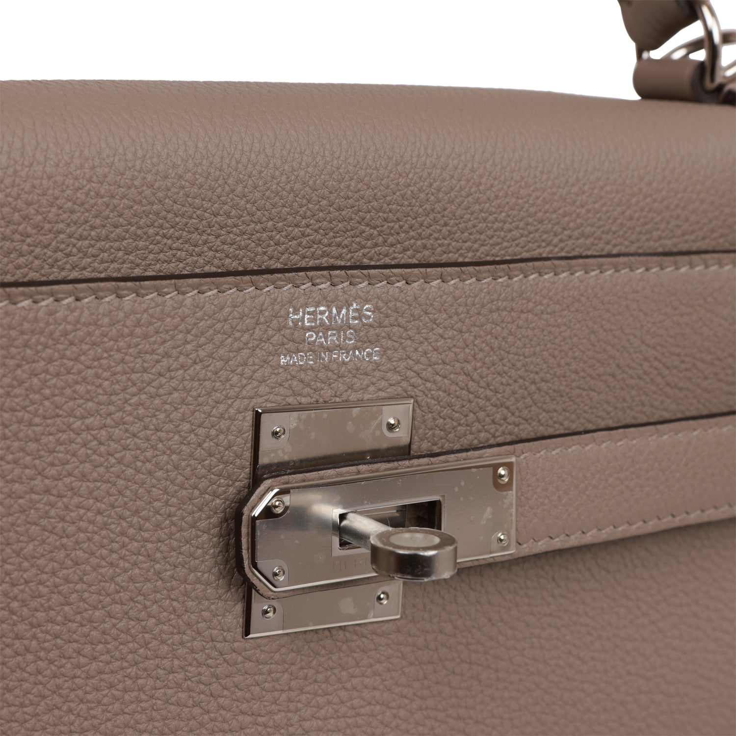 This Kelly, in the Retourne style, is in Gris Asphalte togo leather with palladium hardware and has tonal stitching, two straps with front toggle closure, clochette with lock and two keys, single rolled handle and removable shoulder strap.