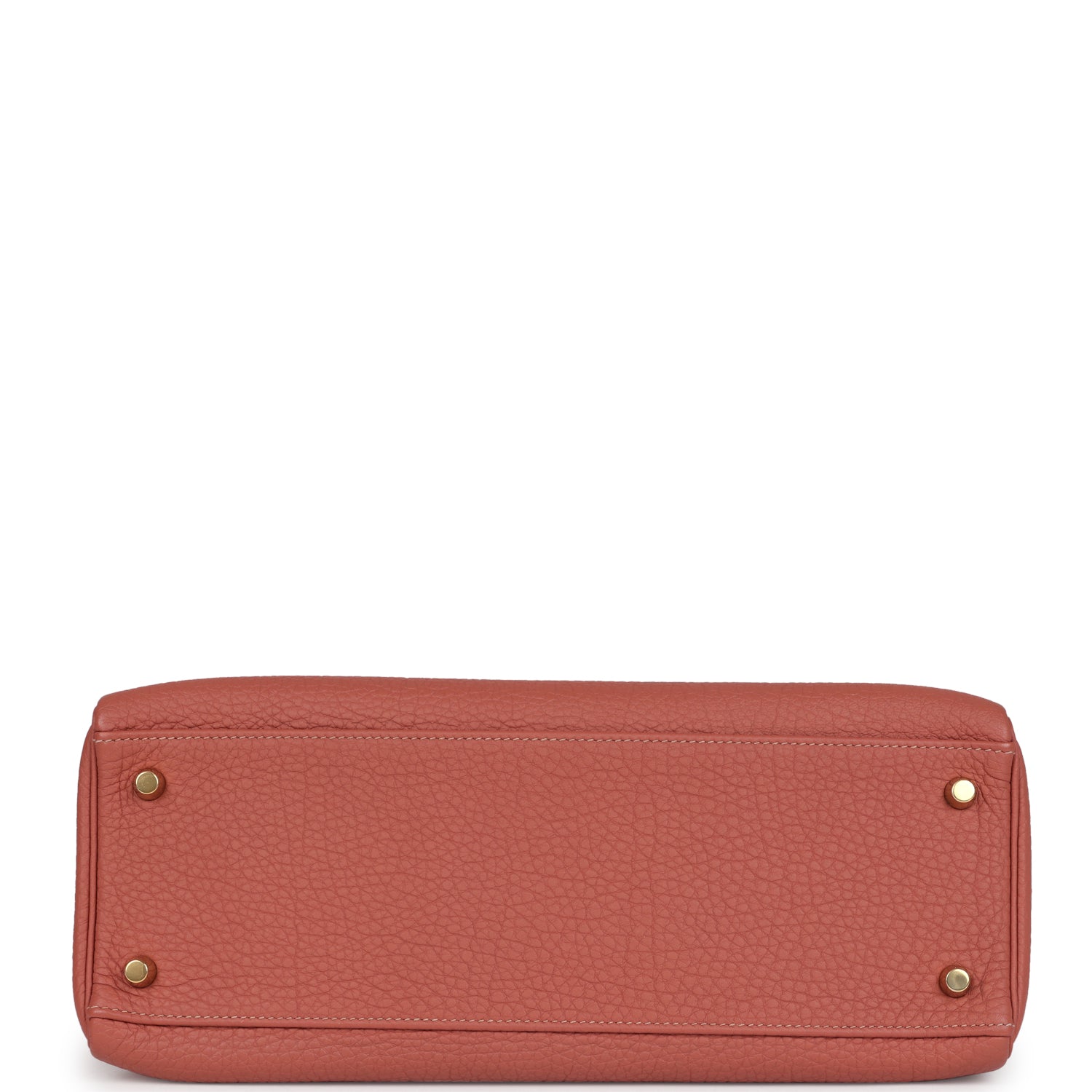 This Kelly, in the Retourne style, is of Rosy togo leather with gold hardware and has tonal stitching, a front toggle closure, a clochette with lock, two keys, a single rolled handle and removable shoulder strap.