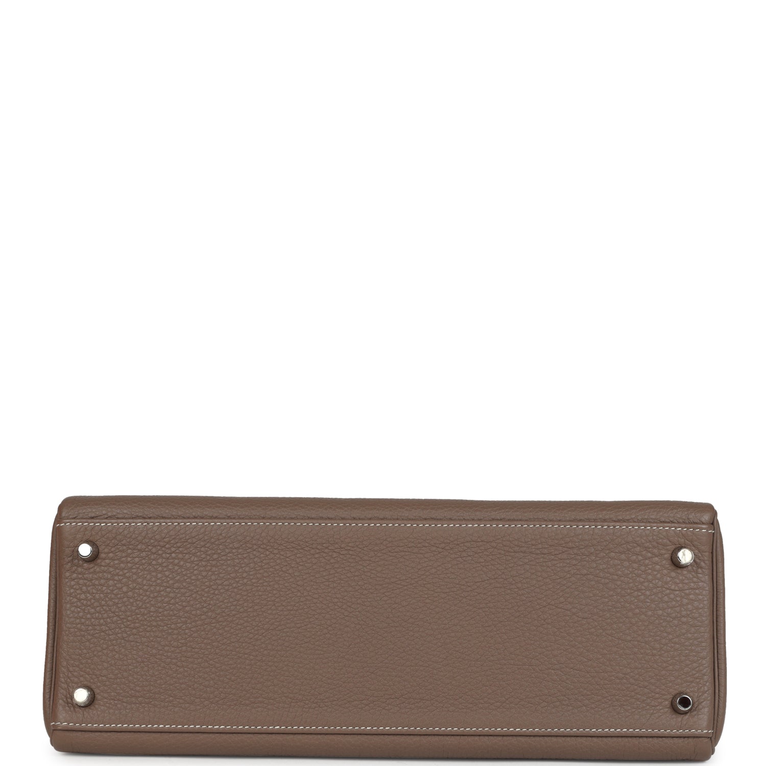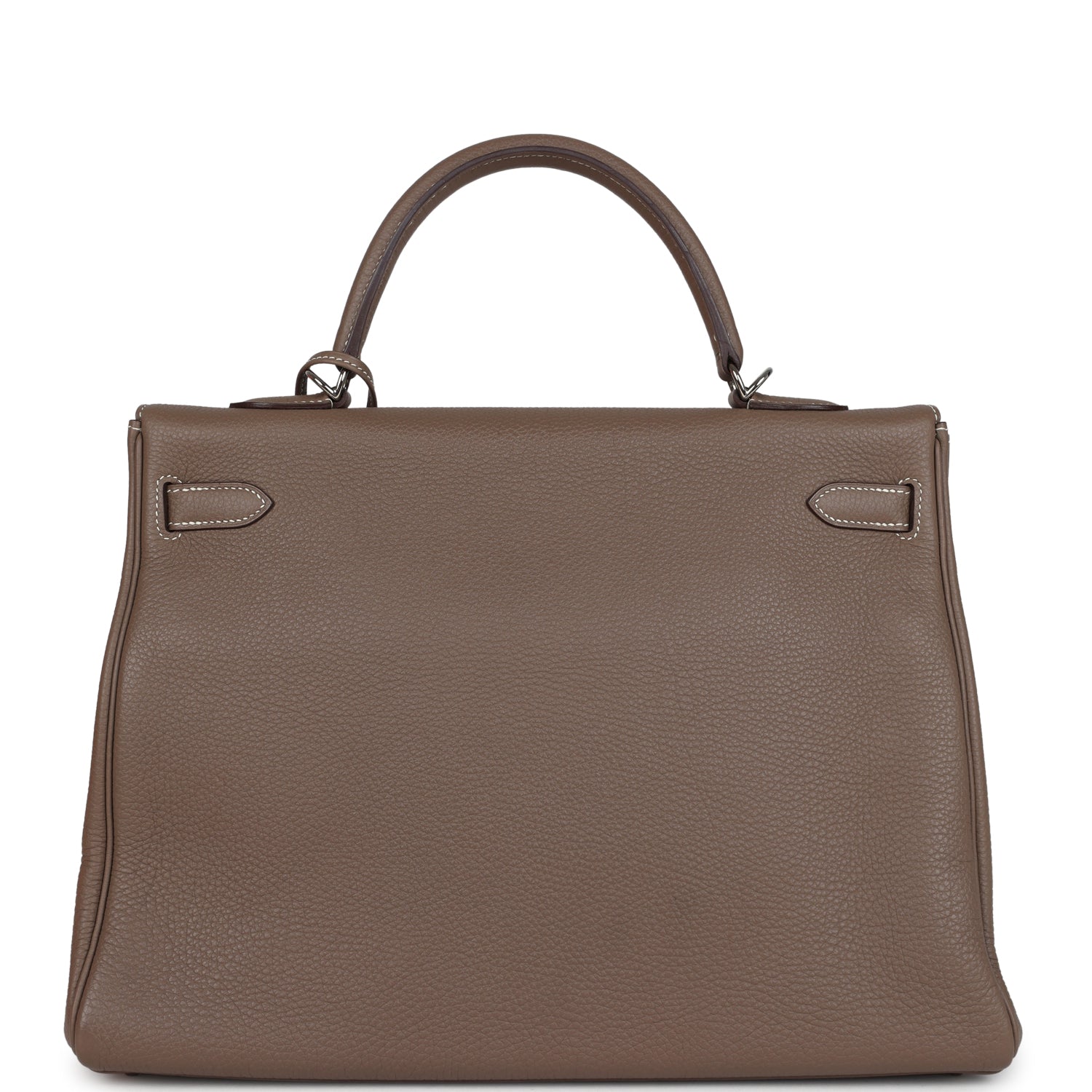 This Hermes Kelly, in the Retourne style, is in Etoupe togo leather with palladium hardware, contrast stitching front toggle closure, clochette with lock and two keys, single rolled handle and removable strap.
