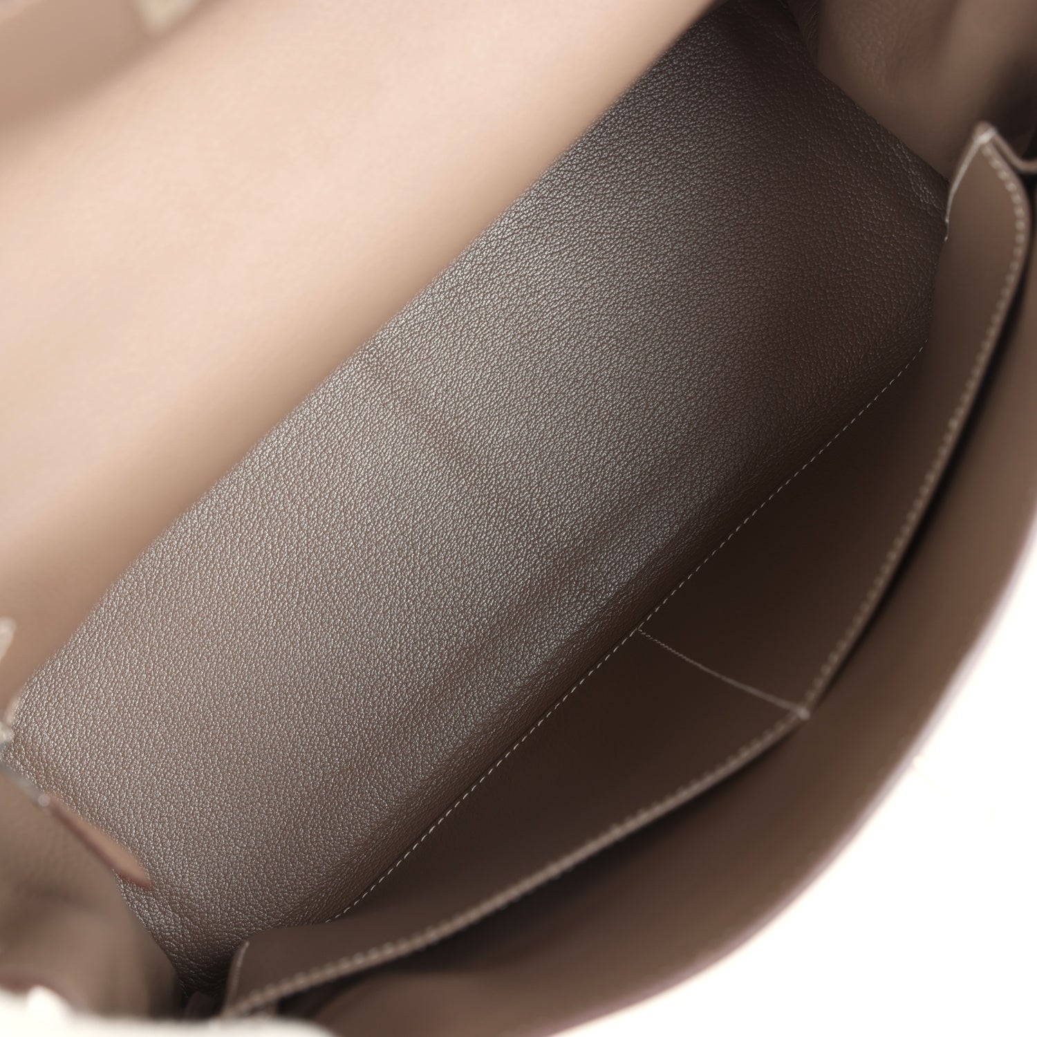 The interior is lined with Etoupe chevre and features one zip pocket with an Hermes engraved pull and two open pockets on the opposite side.