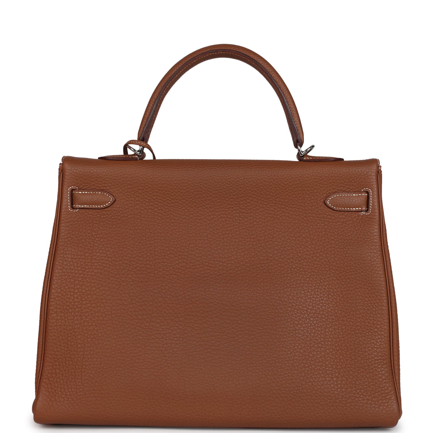 This Hermes Kelly, in the Retourne style, is in Gold togo leather with palladium hardware, contrast stitching front toggle closure, clochette with lock and two keys, single rolled handle and removable strap.