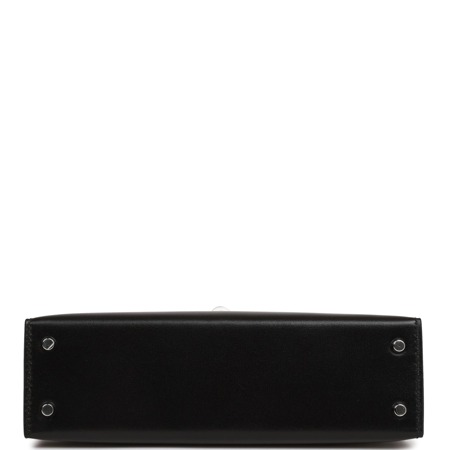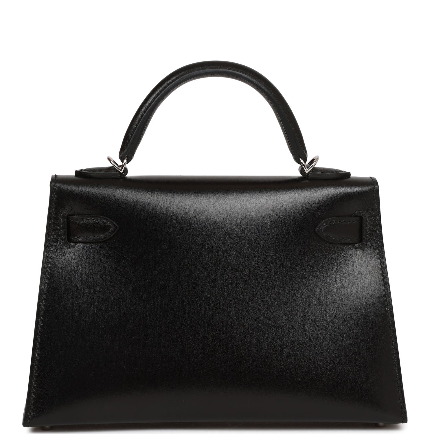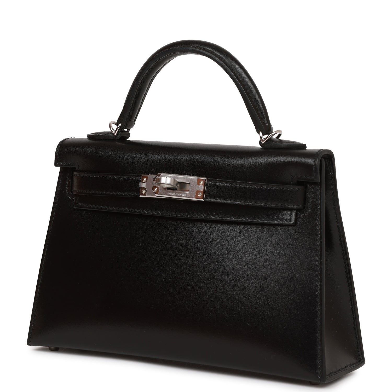 This tiny Kelly, in the Sellier style, is in black box leather with palladium hardware and has tonal stitching, two front straps with front toggle closure, single rolled handle and removable shoulder strap.