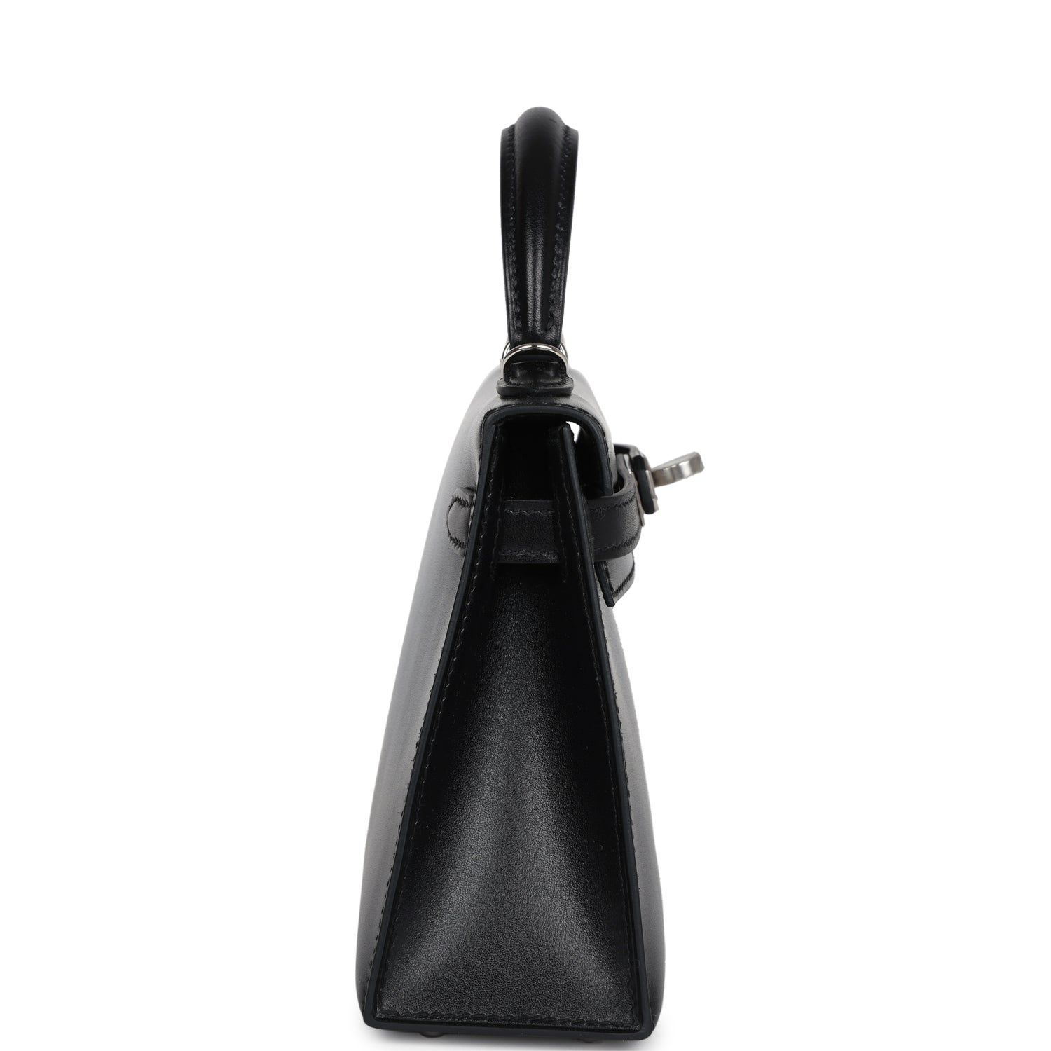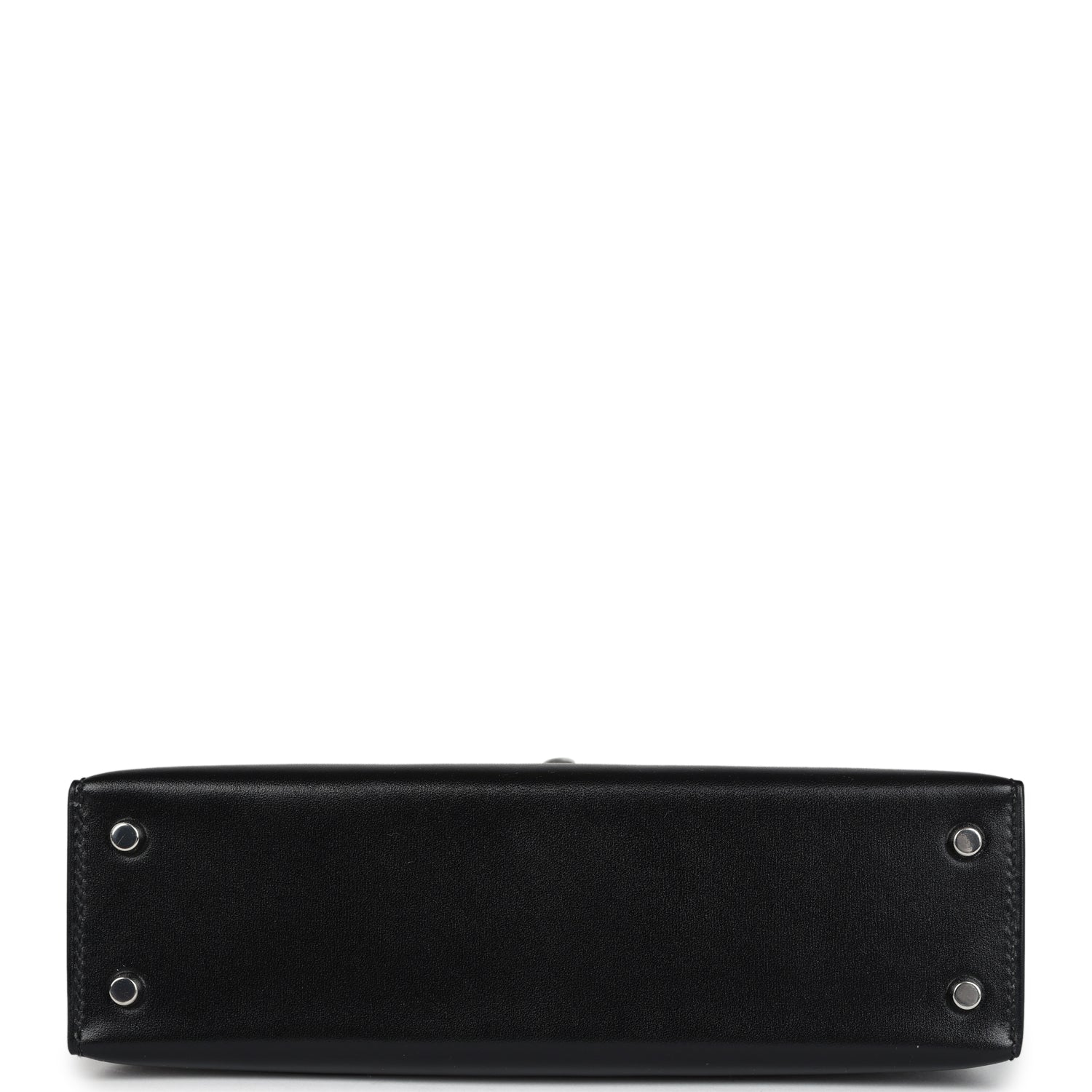 This Kelly, in the Sellier style, is in Black box leather with palladium hardware and has tonal stitching, two straps with front toggle closure, single rolled handle and removable shoulder strap.