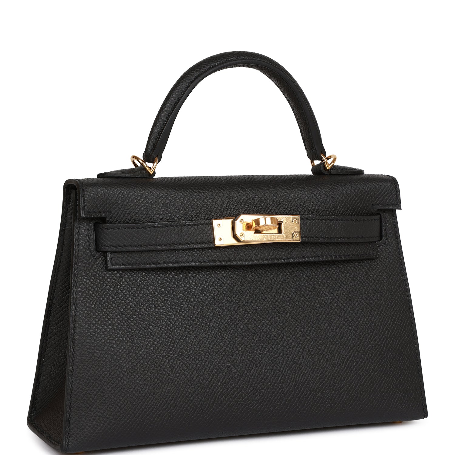 This tiny Kelly, in the Sellier style, is in black epsom leather with gold hardware and has tonal stitching, two front straps with front toggle closure, single rolled handle and removable shoulder strap.