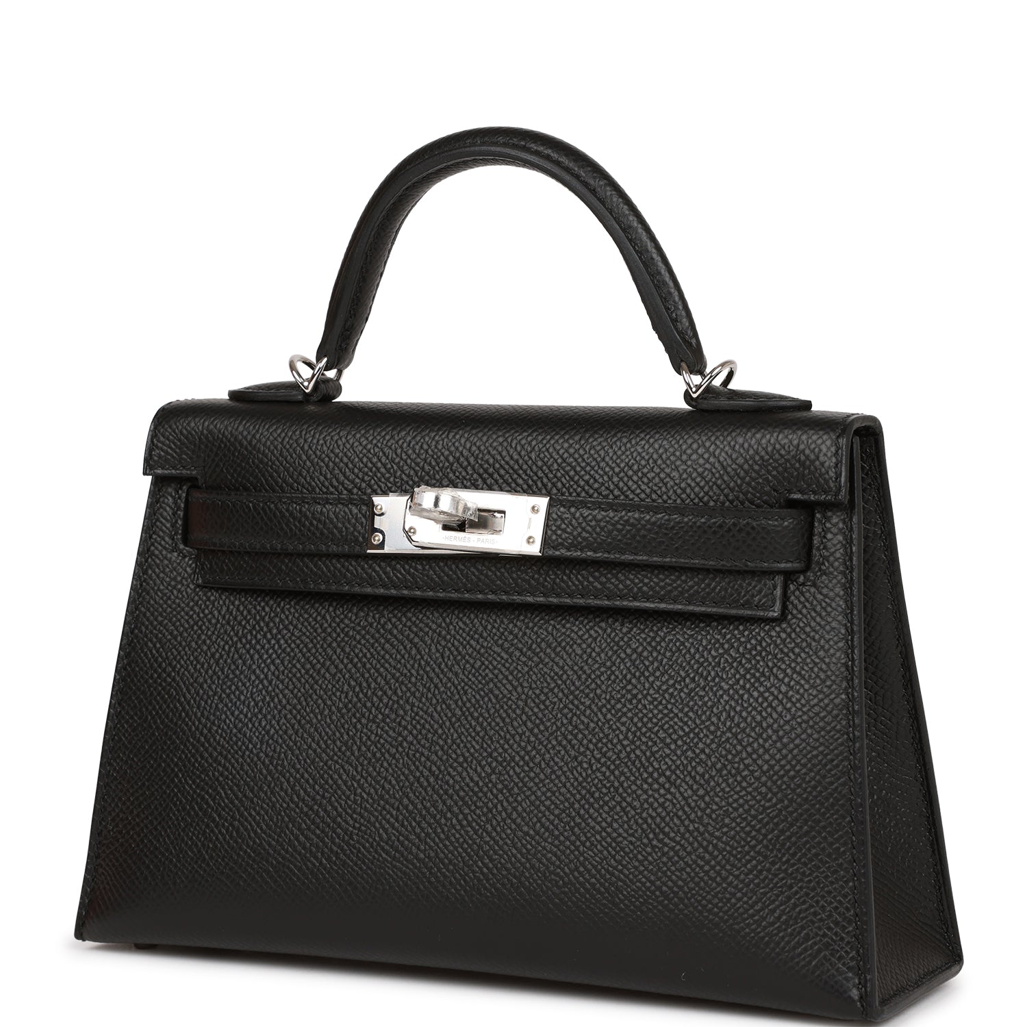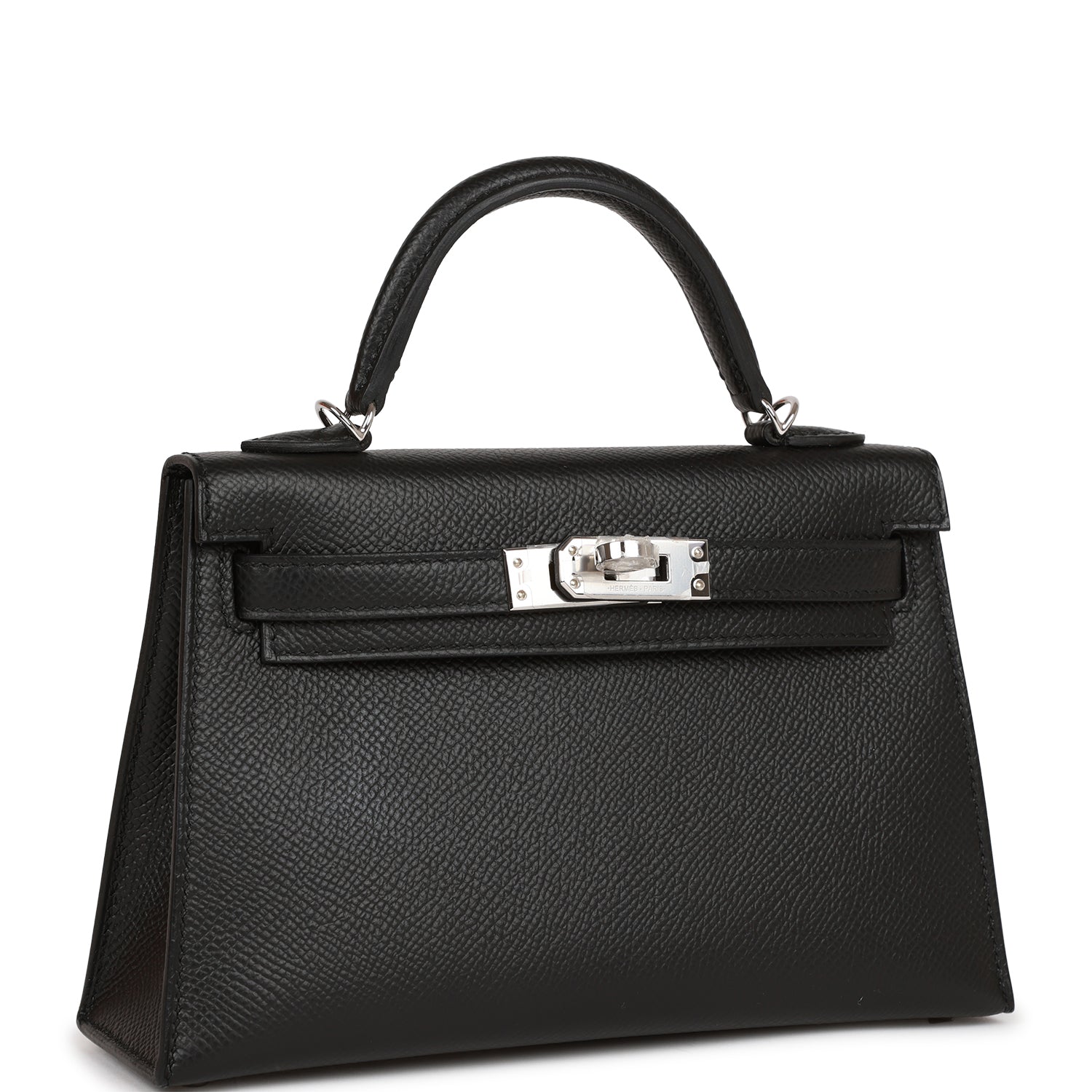 This tiny Kelly, in the Sellier style, is in black epsom leather with palladium hardware and has tonal stitching, two front straps with front toggle closure, single rolled handle and removable shoulder strap.