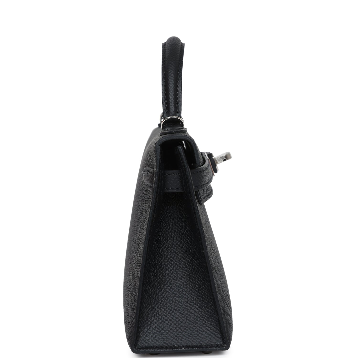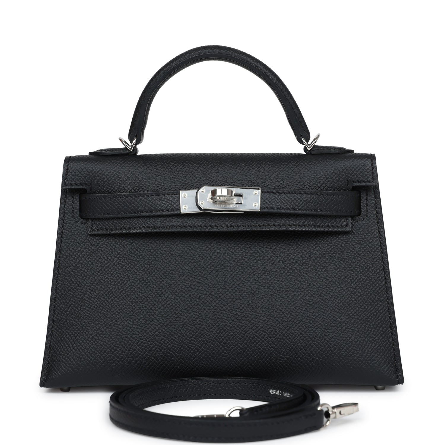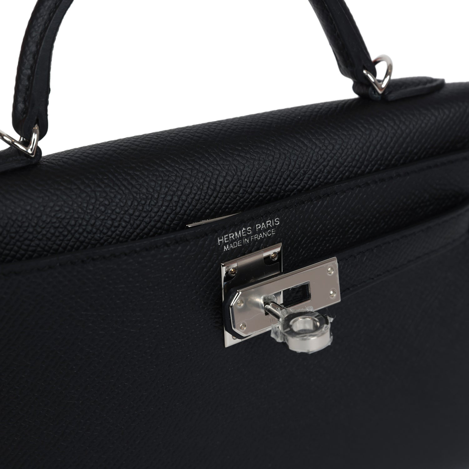 This Kelly, in the Sellier style, is in Black epsom leather with palladium hardware and has tonal stitching, two straps with front toggle closure, single rolled handle and removable shoulder strap.