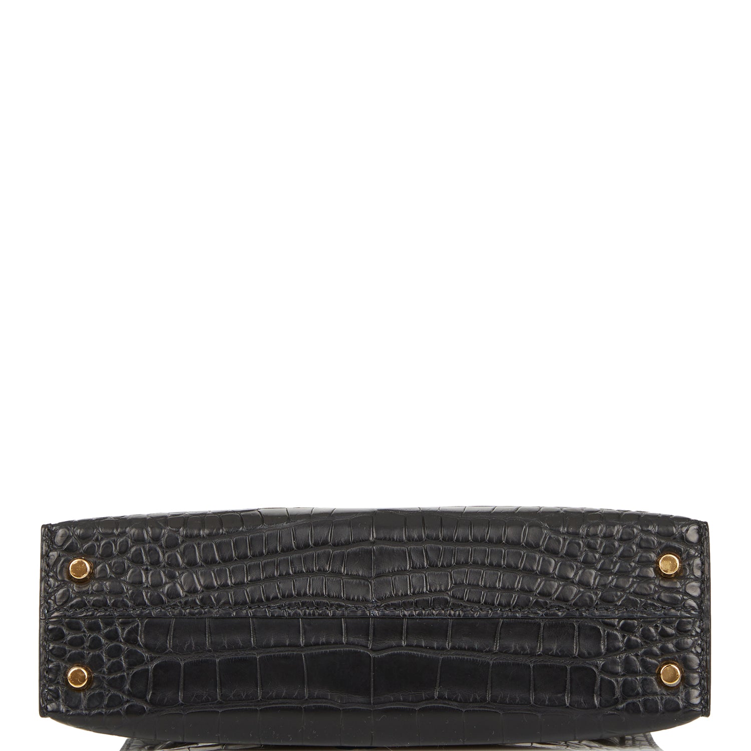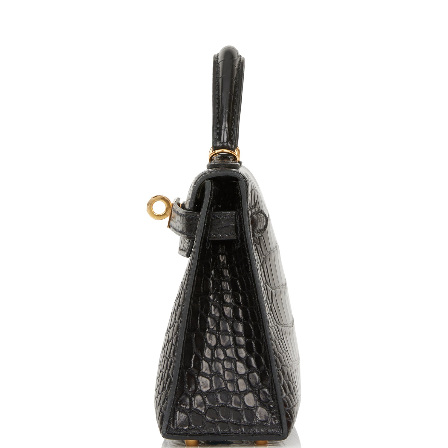 This tiny Kelly, in the Sellier style, is in Black matte Mississippiensis alligator with gold hardware and has tonal stitching, two front straps with front toggle closure, single rolled handle and removable shoulder strap.