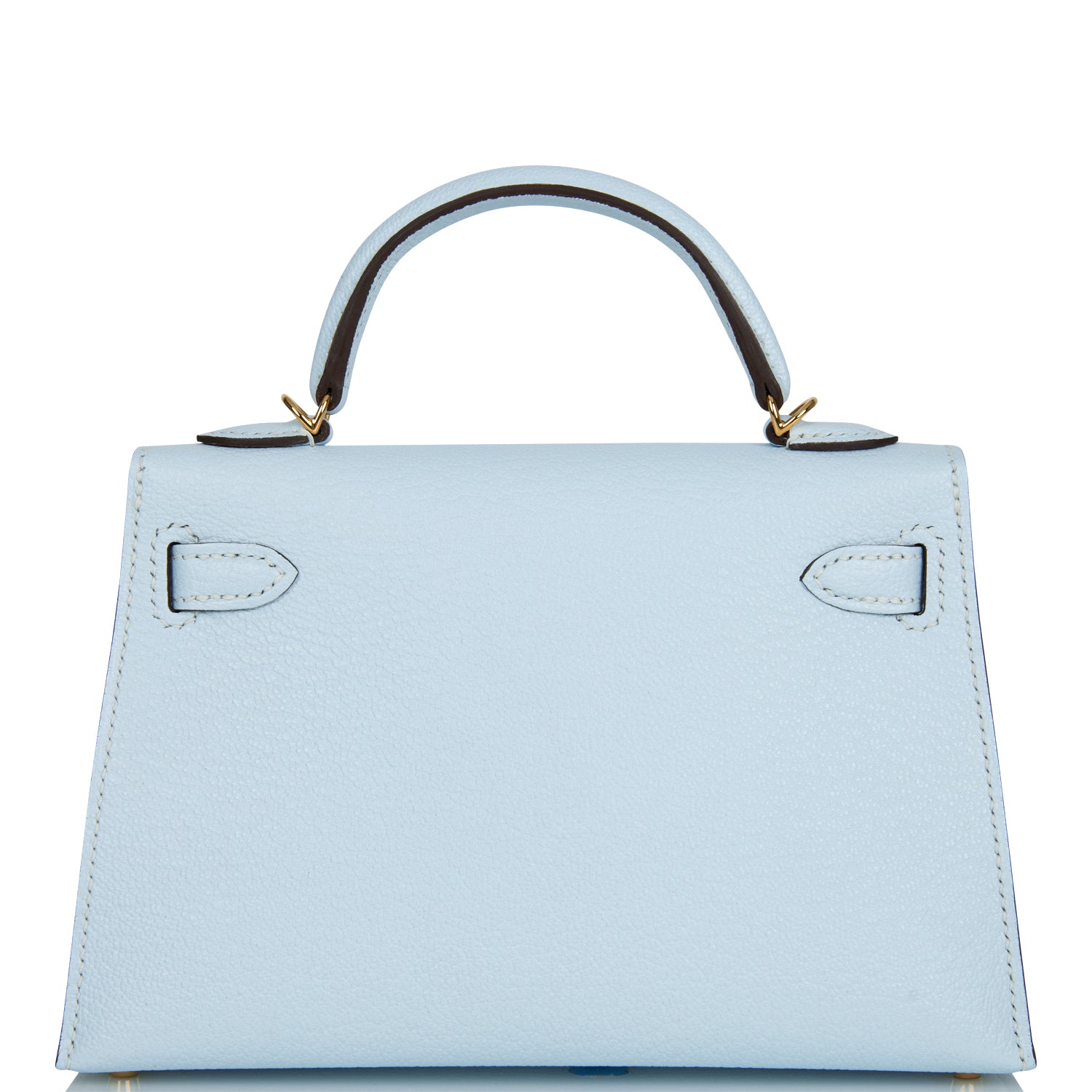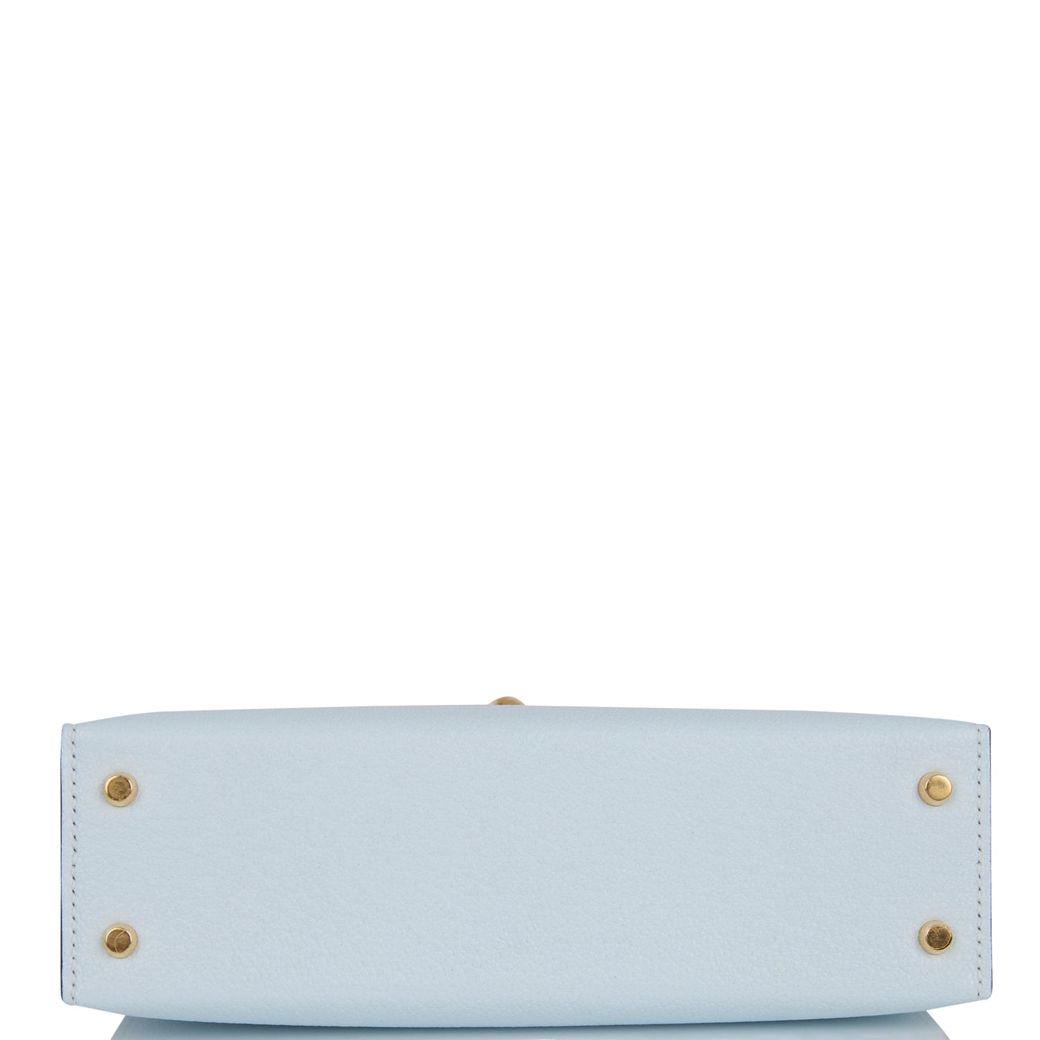 This Kelly, in the Sellier style, is in Bleu Brume chevre leather with gold hardware and has tonal stitching, two straps with front toggle closure, single rolled handle and removable shoulder strap.