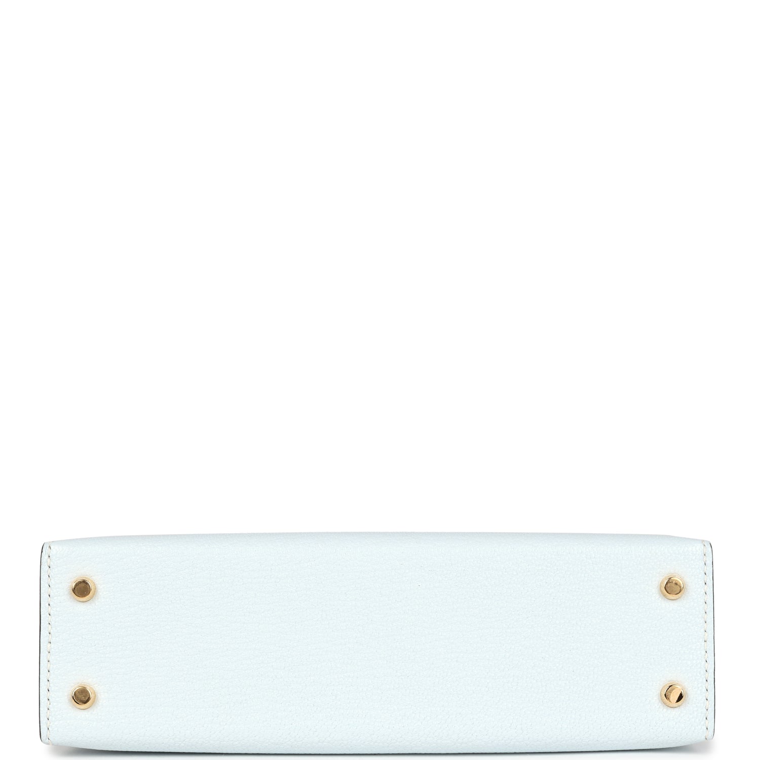 This Kelly, in the Sellier style, is in Bleu Brume chevre mysore leather with gold hardware and has tonal stitching, two straps with front toggle closure, single rolled handle and removable wooly/canvas shoulder strap.
