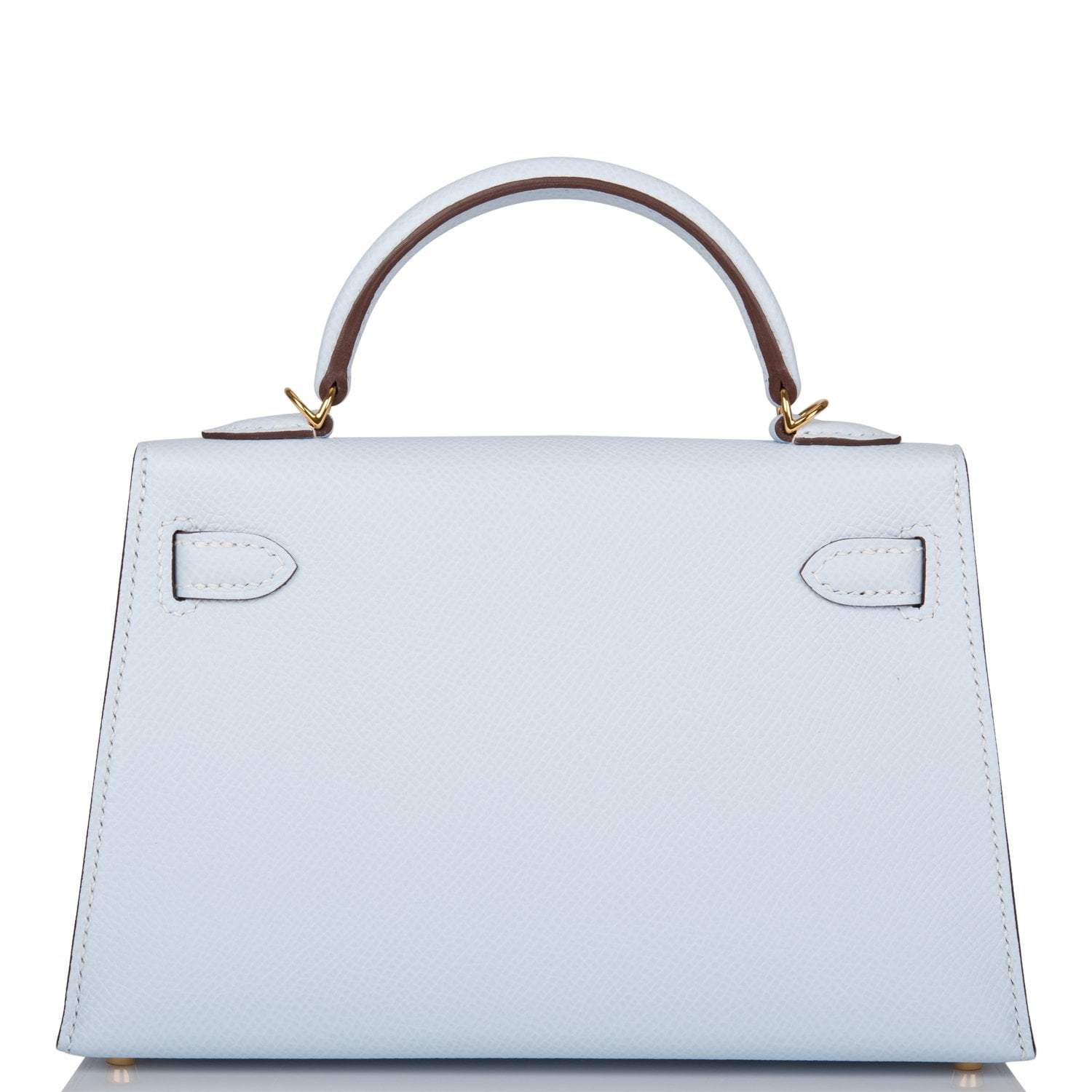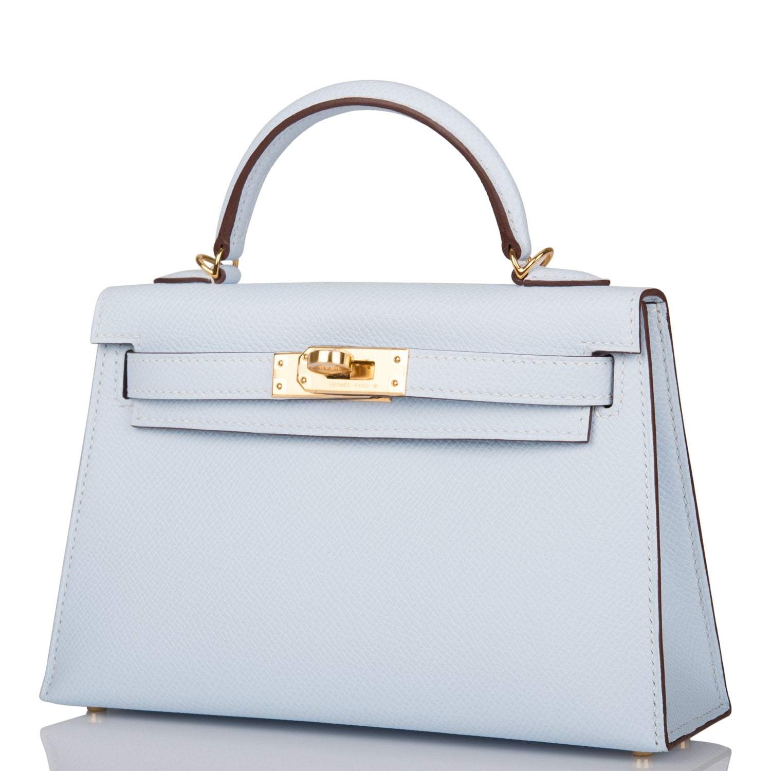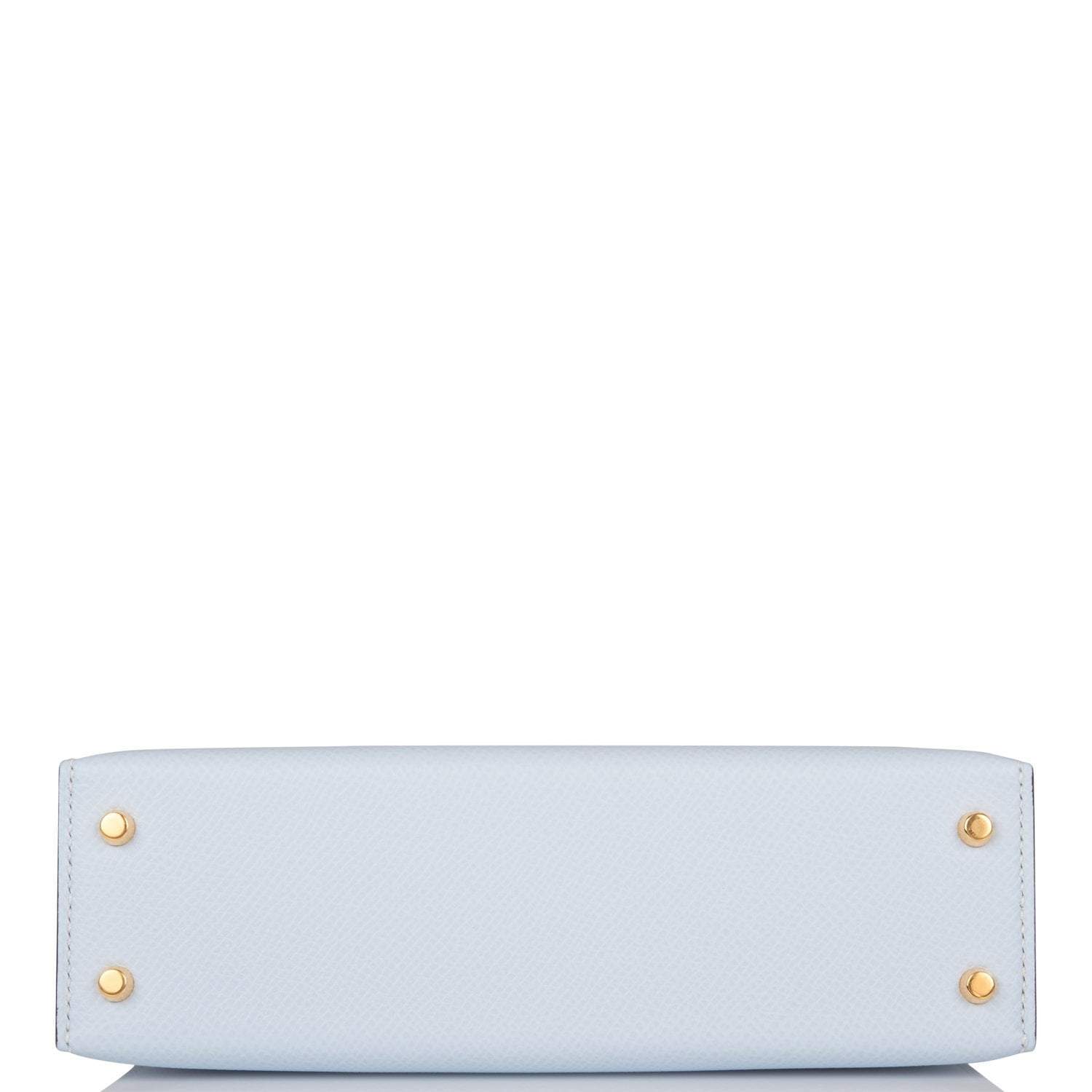 This Kelly, in the Sellier style, is in Bleu Brume epsom leather with gold hardware and has tonal stitching, two straps with front toggle closure, single rolled handle and removable shoulder strap.