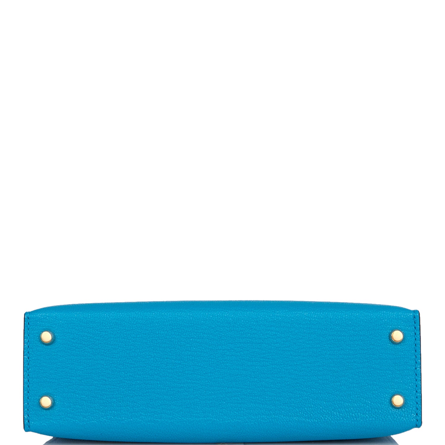This Kelly, in the Sellier style, is in Bleu Frida chevre leather with gold hardware and has tonal stitching, two straps with front toggle closure, single rolled handle and removable shoulder strap.