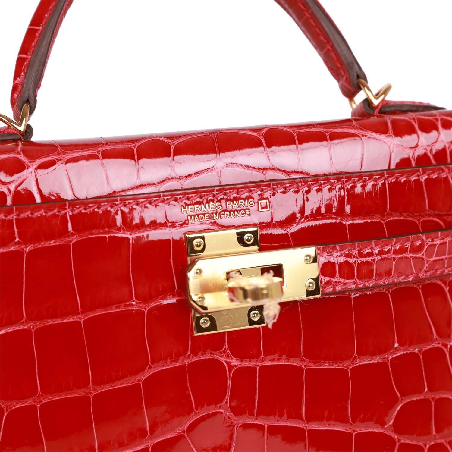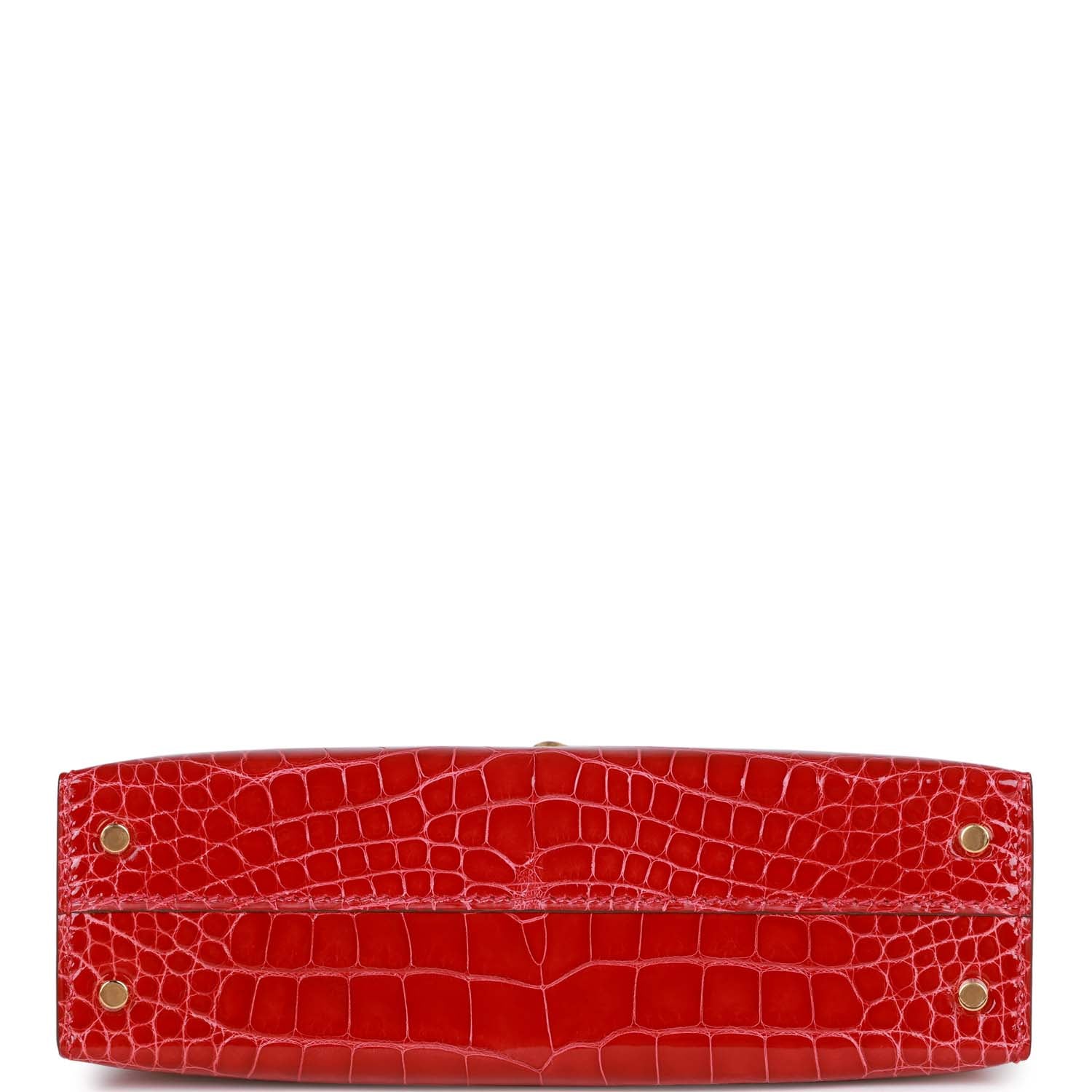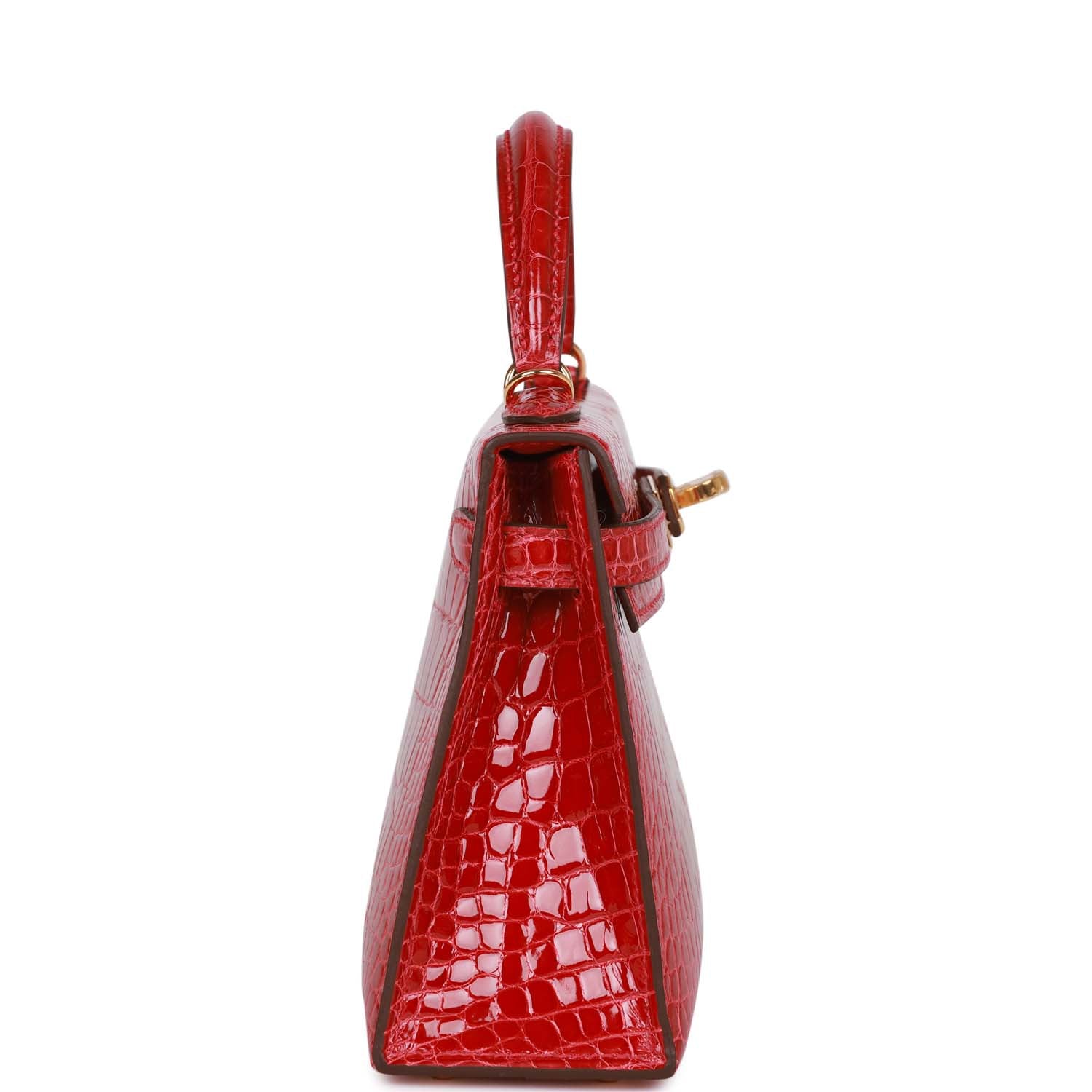 This tiny Kelly, in the Sellier style, is in Braise shiny Mississippiensis alligator with gold hardware and has tonal stitching, two front straps with front toggle closure, single rolled handle and removable shoulder strap.
