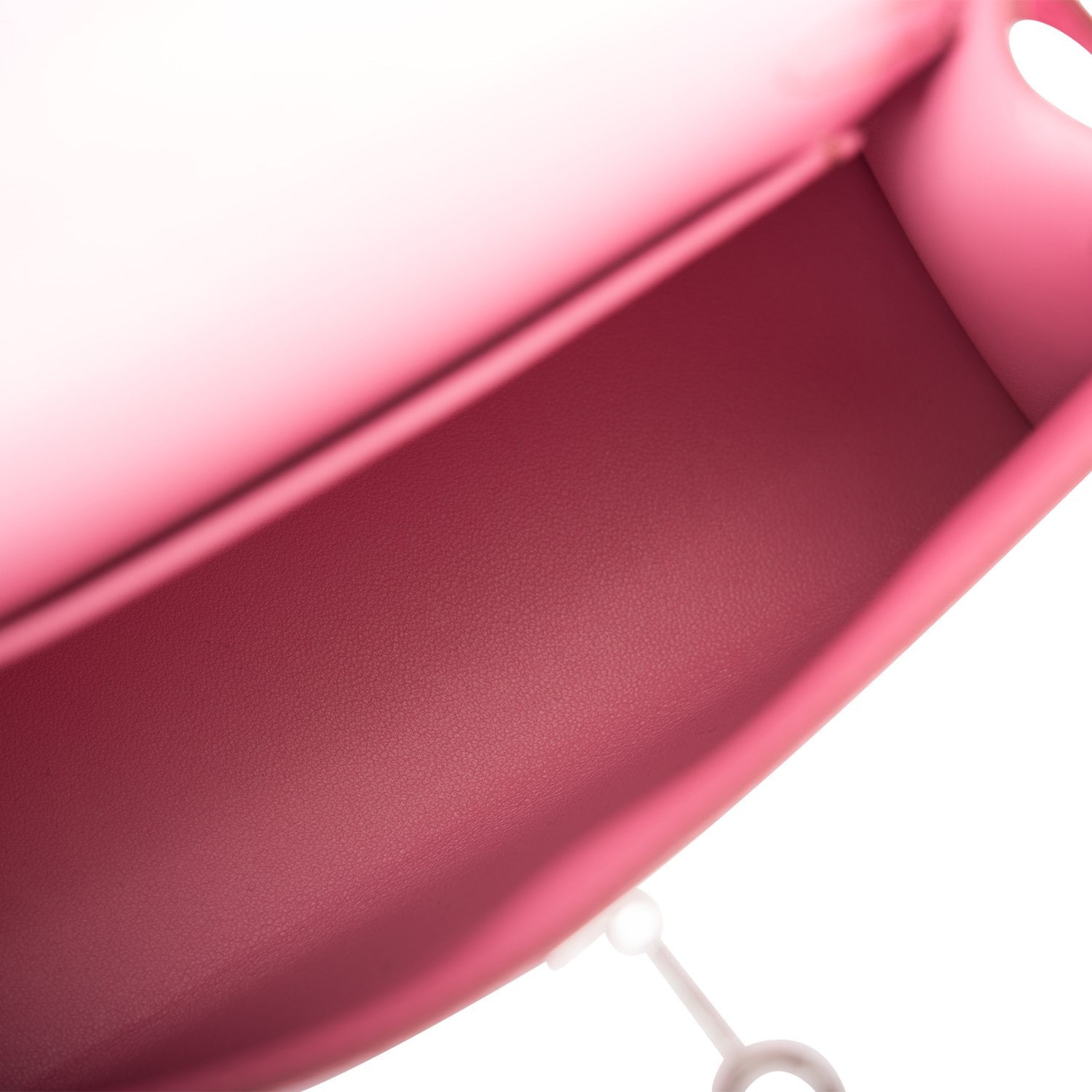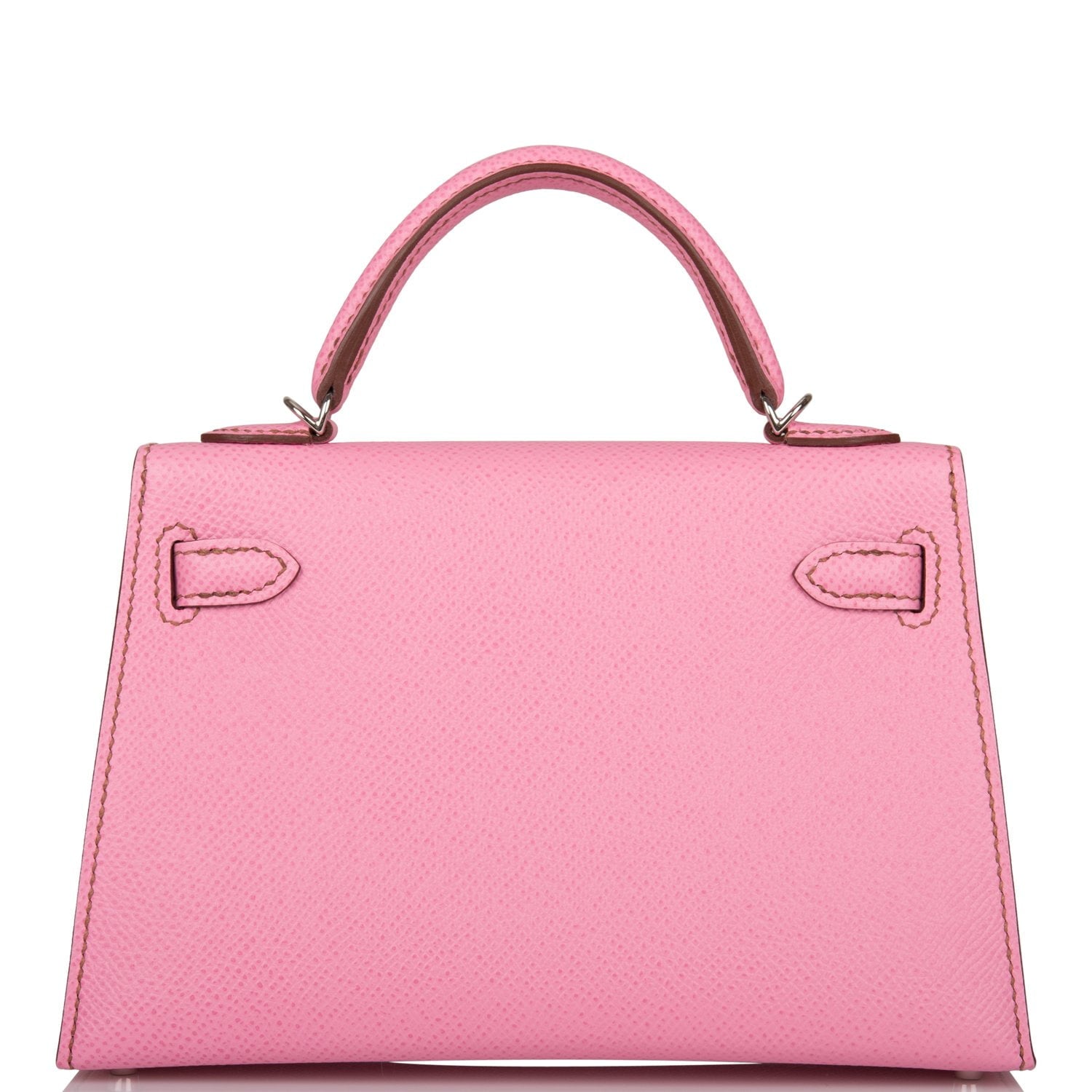 This Kelly, in the Sellier style, is in Bubblegum epsom leather with palladium hardware and has contrast stitching, front flap, two straps with center toggle closure, single rolled handle and removable shoulder strap.