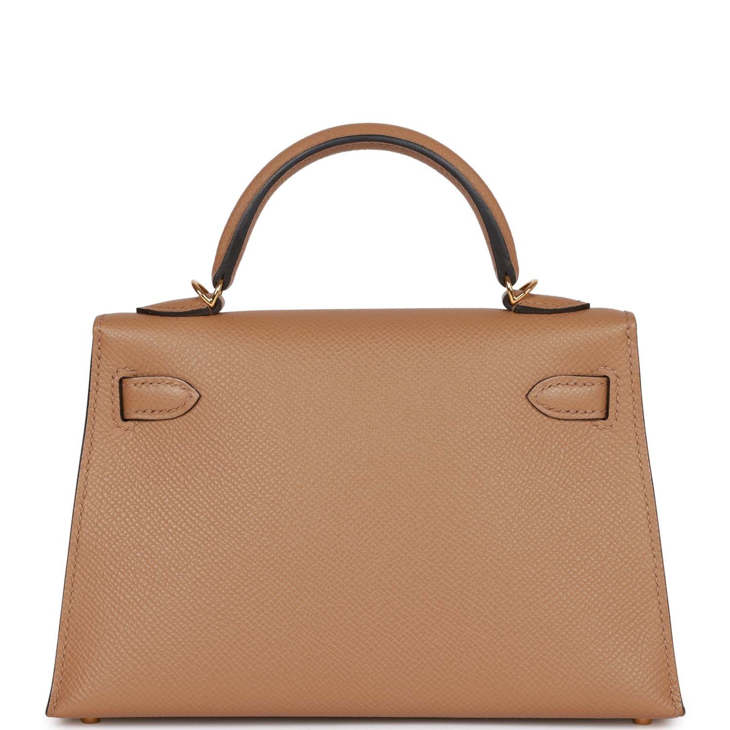 This tiny Kelly, in the Sellier style, is in Chai epsom leather with gold hardware and has tonal stitching, two front straps with front toggle closure, single rolled handle and removable shoulder strap.