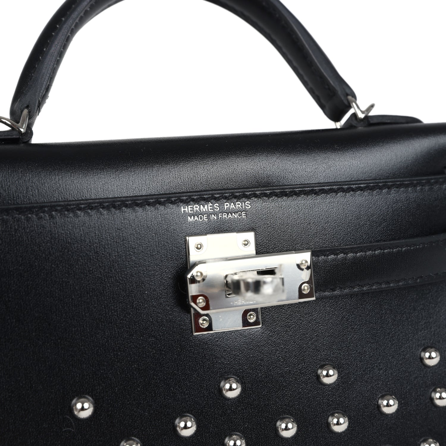 This limited edition Kelly, in the Sellier style, is in Black boxcalf leather with palladium hardware and has palladium rounds studs, tonal stitching, two front straps with front toggle closure, single rolled handle and removable shoulder strap.