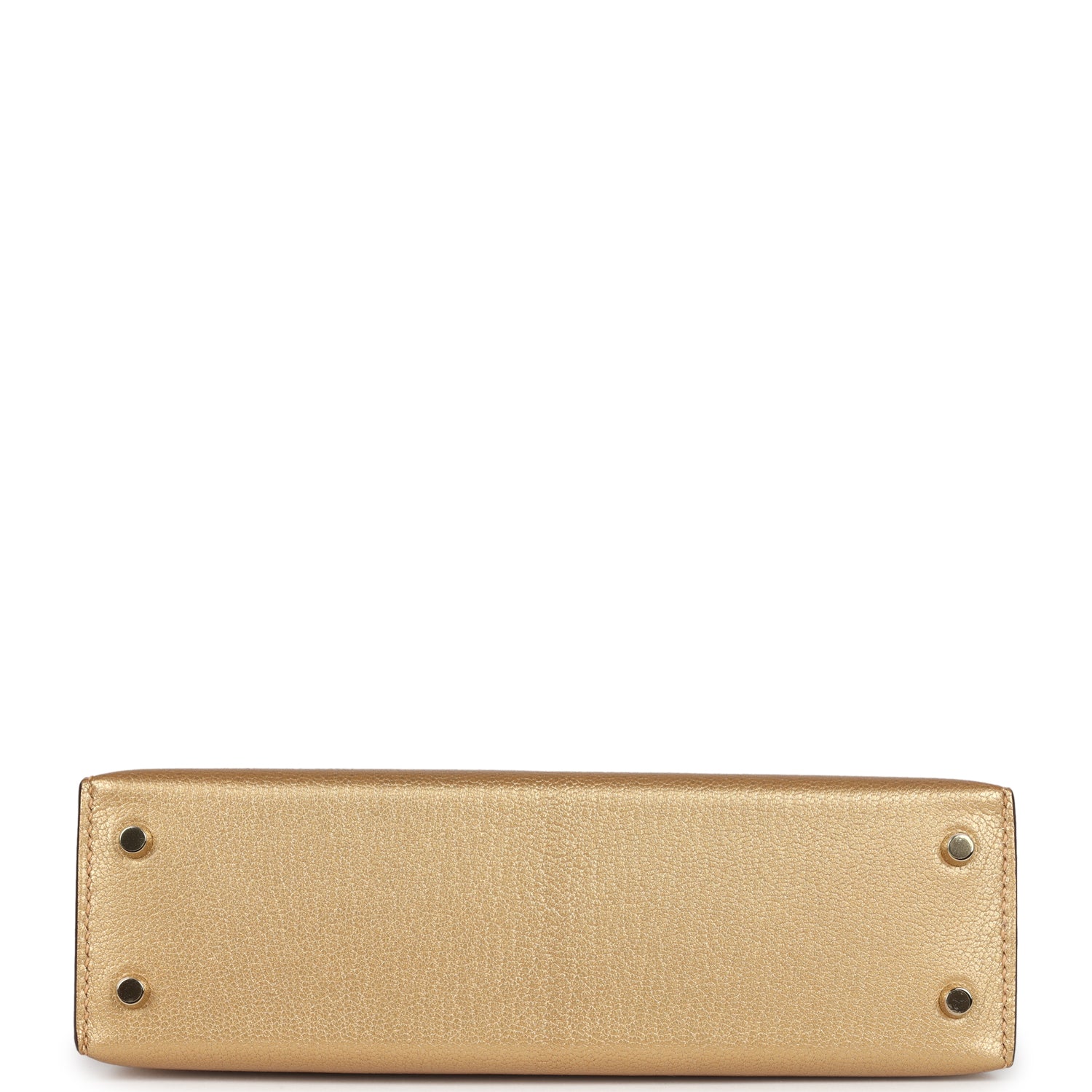 This limited edition Kelly, in the Sellier style, is in Dore Chevre Chamkilight leather with permabrass hardware, has tonal stitching, two front straps with front toggle closure, single rolled handle and removable shoulder strap.