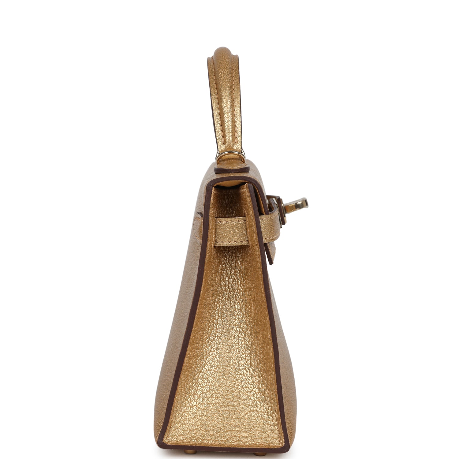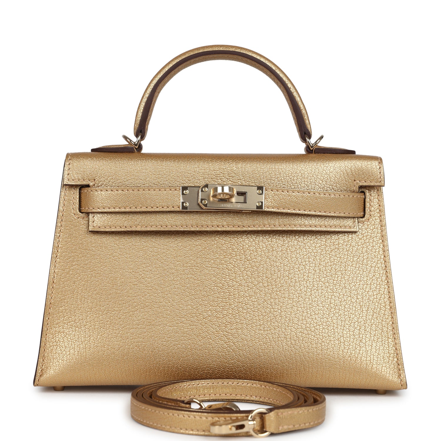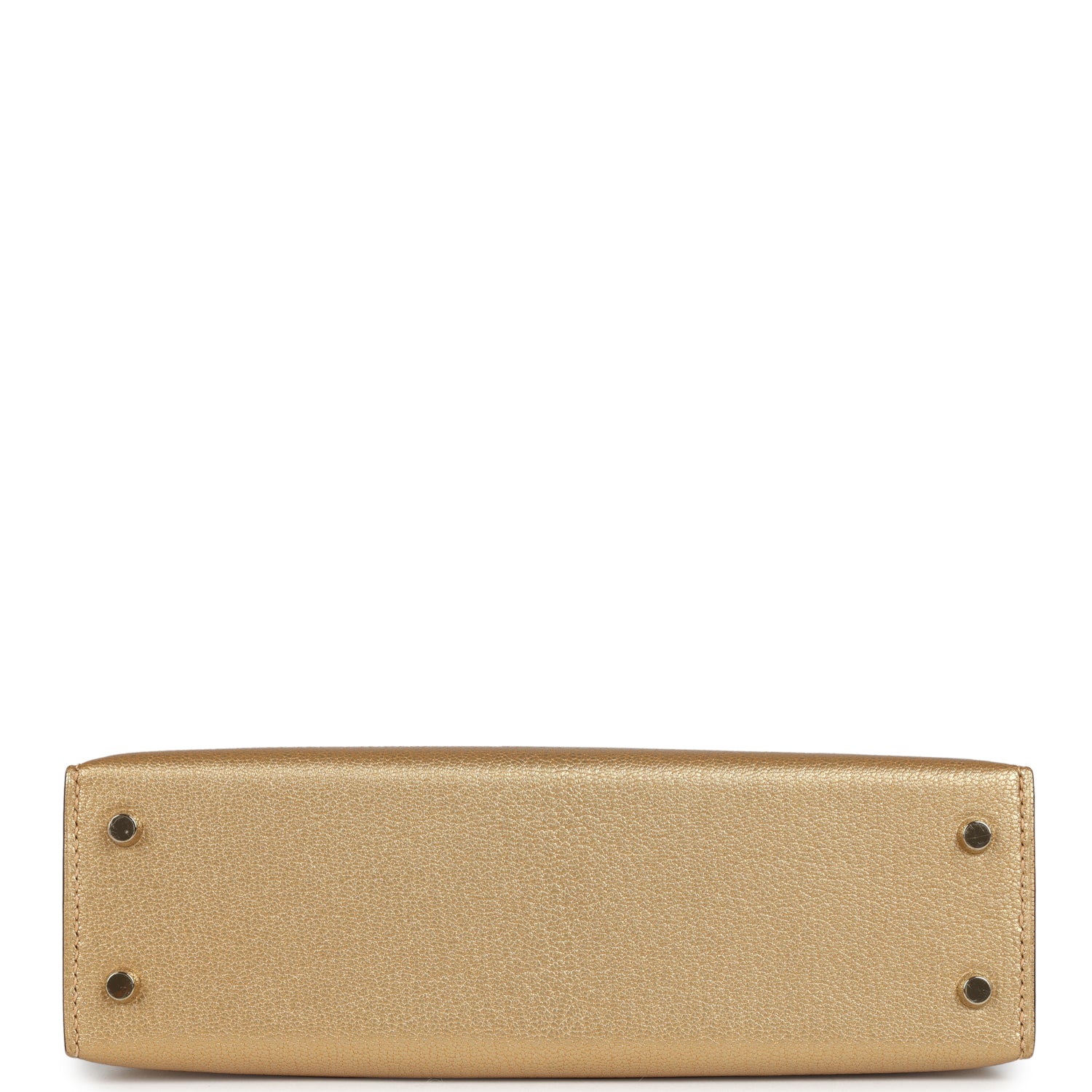 This limited edition Kelly, in the Sellier style, is in Dore Chevre Chamkilight leather with permabrass hardware, has tonal stitching, two front straps with front toggle closure, single rolled handle and removable shoulder strap.